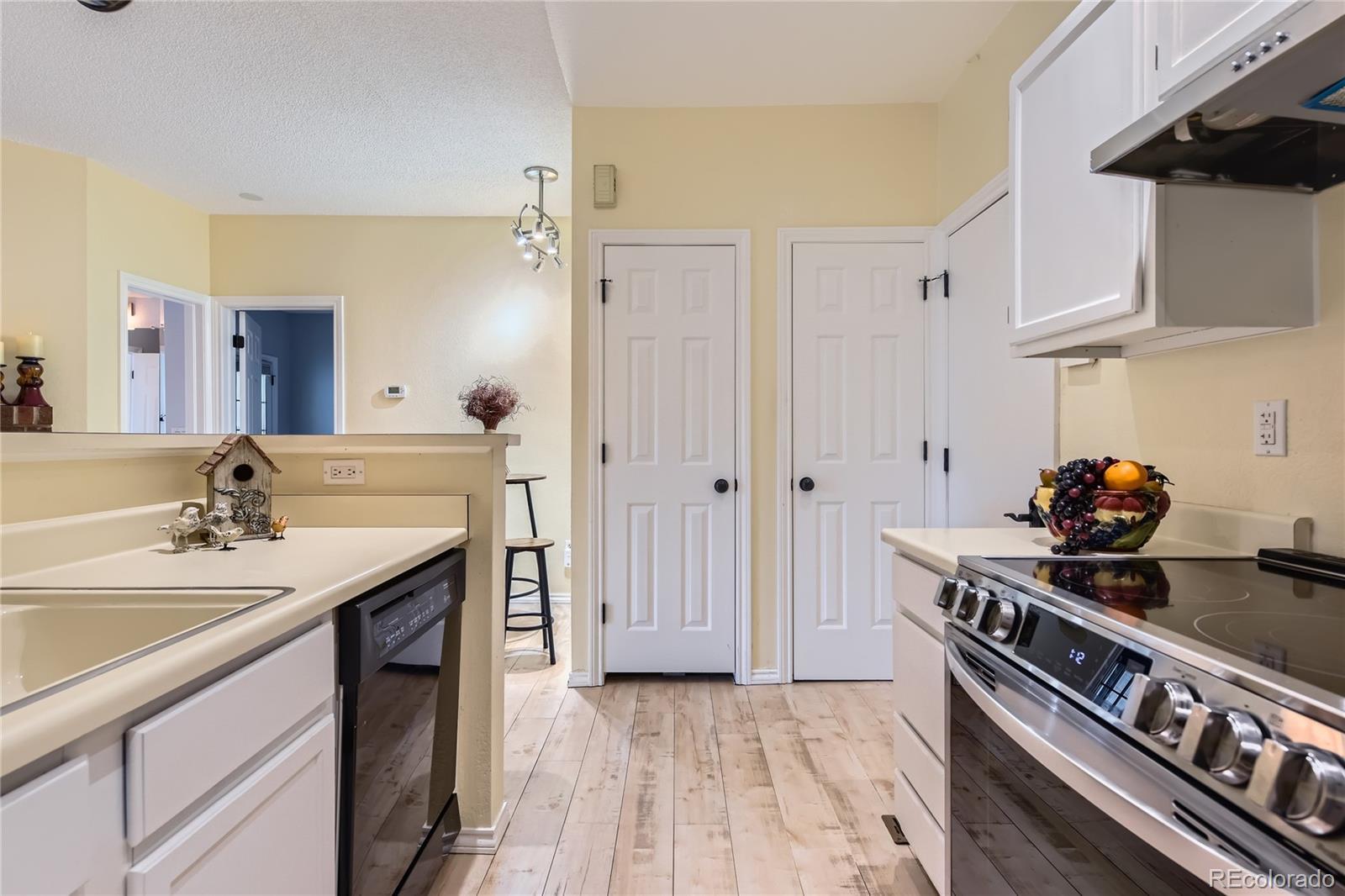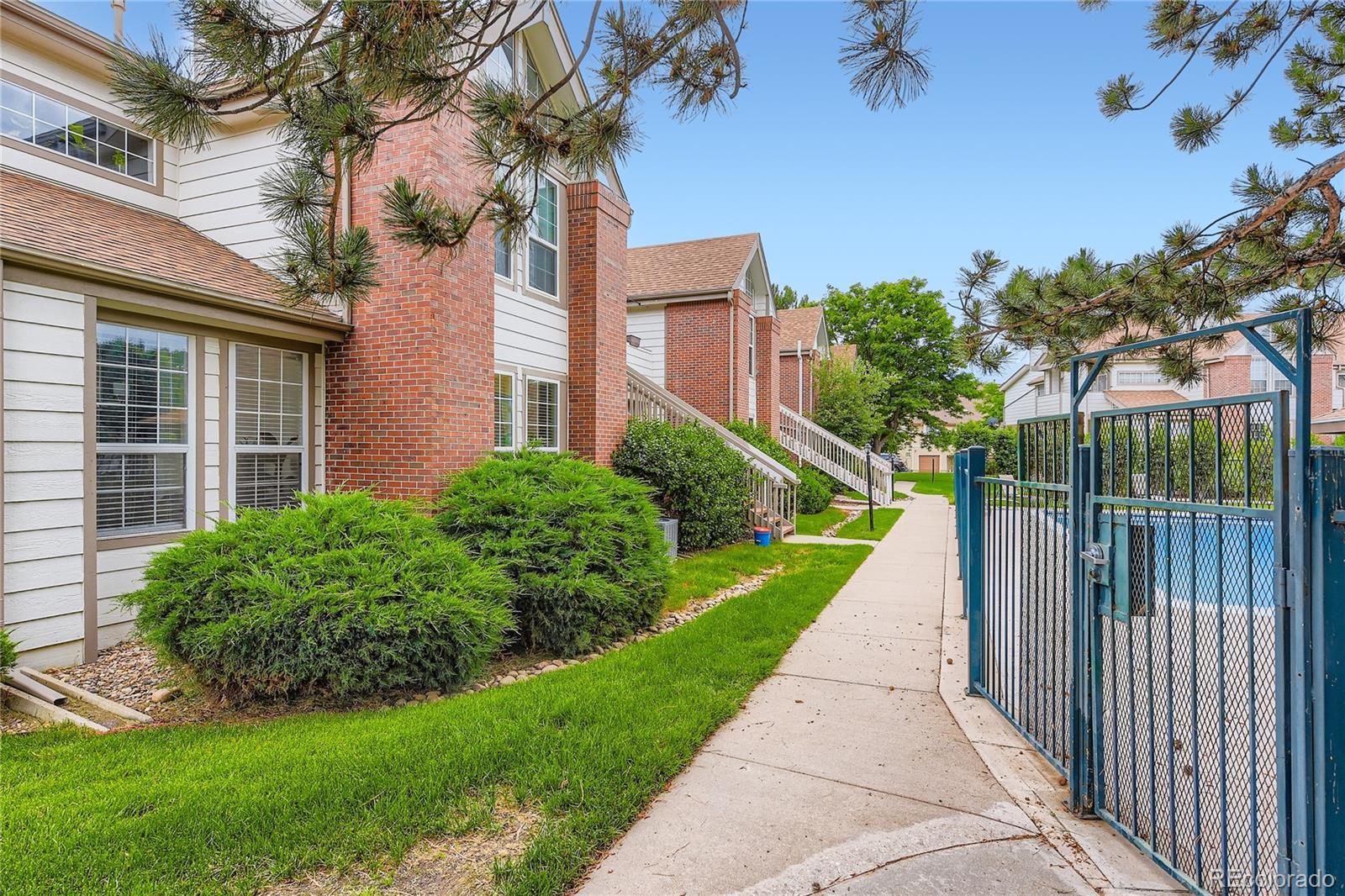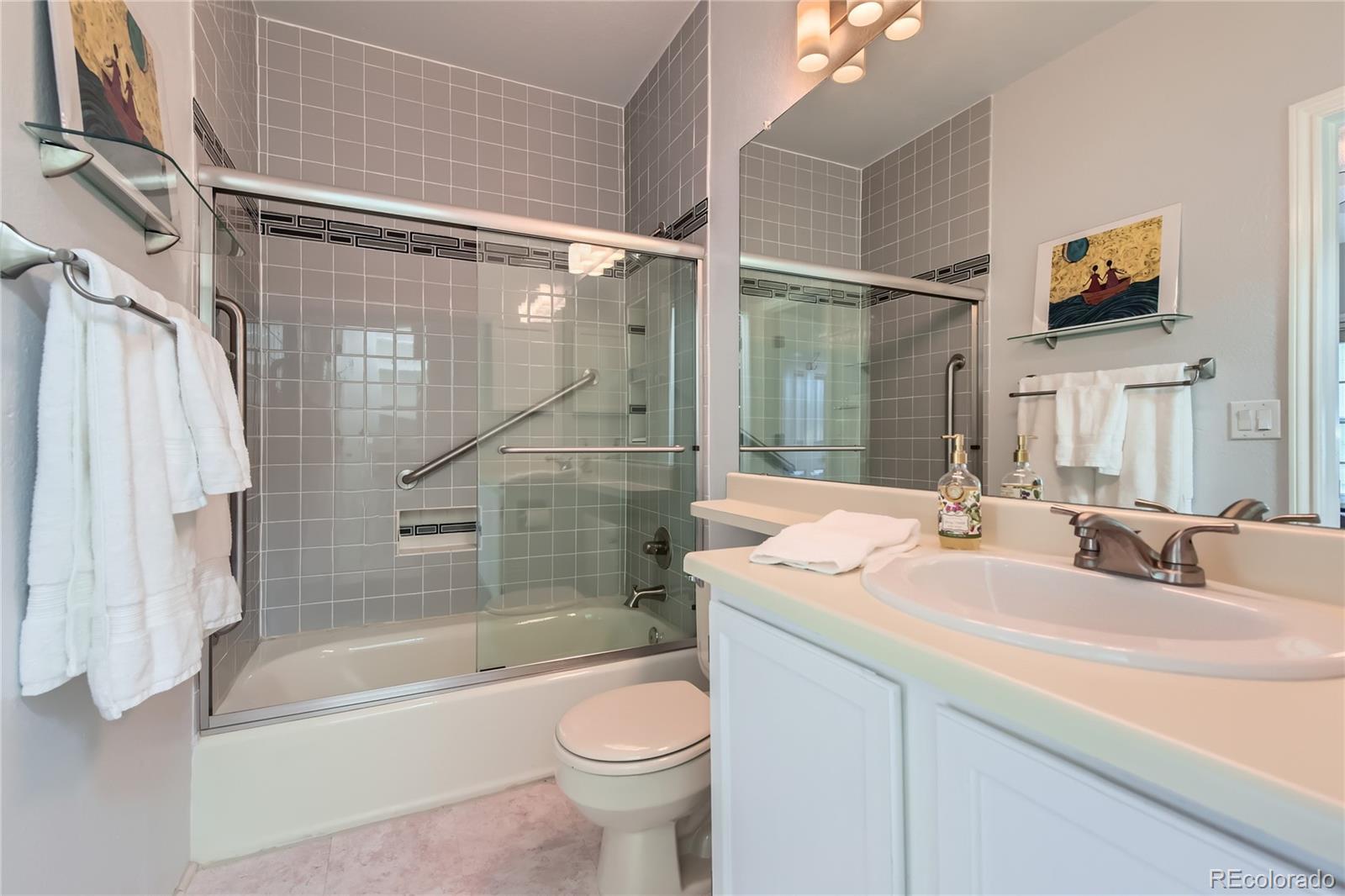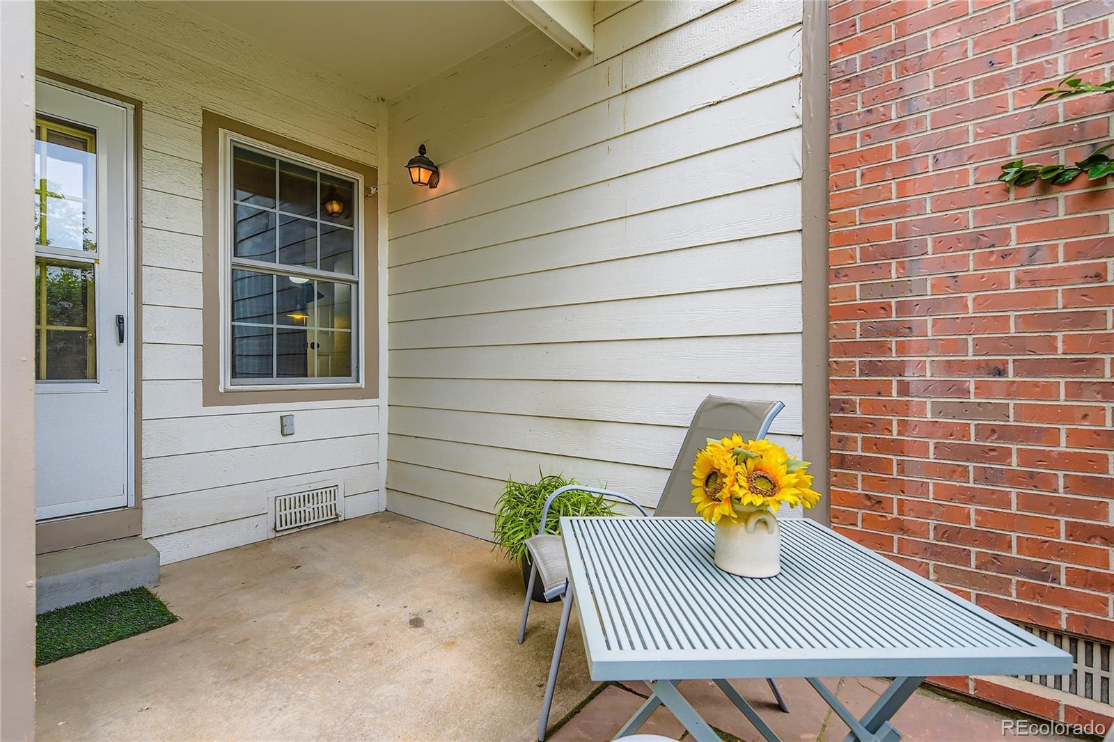 Immaculate, updated ground-floor 2 bedroom, 2 bath unit with a private patio, just steps from the pool! Attached garage with newer door and opener provides direct access into your home. Located just minutes from downtown Littleton in a beautiful well-maintained complex surround by Centennial Golf course. Enjoy modern living with newer windows complete with Hunter Douglas blinds and LVP flooring throughout. The updated kitchen boasts track lighting, crisp white cabinets, stainless steel appliances, and a large pantry with convenient pull-out shelving. The newer LG washer and dryer included. The living room offers comfort with a ceiling fan, a cozy wood-burning fireplace, and a built-in cabinet storage. The primary bedroom features a built-in Murphy bed, ceiling fan, and a spacious walk-in closet with an organizer. A private covered patio, accessible from the primary bedroom, is perfect for pets or relaxation. The en-suite full bath has newer tile, countertops, and a new light fixture. A large second bedroom includes double doors, built-in cabinet storage, closet organizer and a ceiling fan. This prime location offers easy access to light rail, walking and bike paths along the South Platte River, Centennial Golf Course, and walking distance to all of historic downtown Littleton's shopping and restaurants.