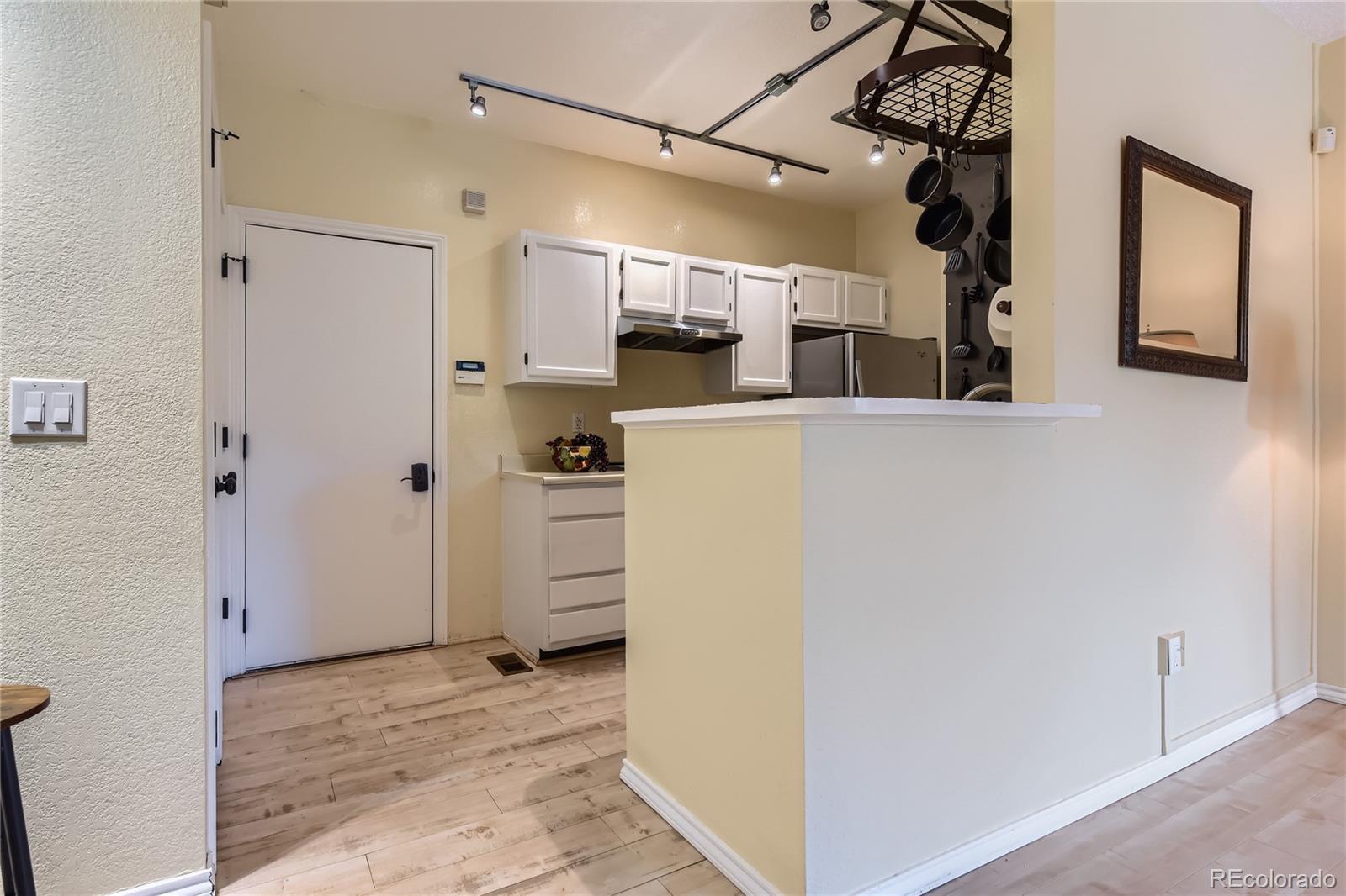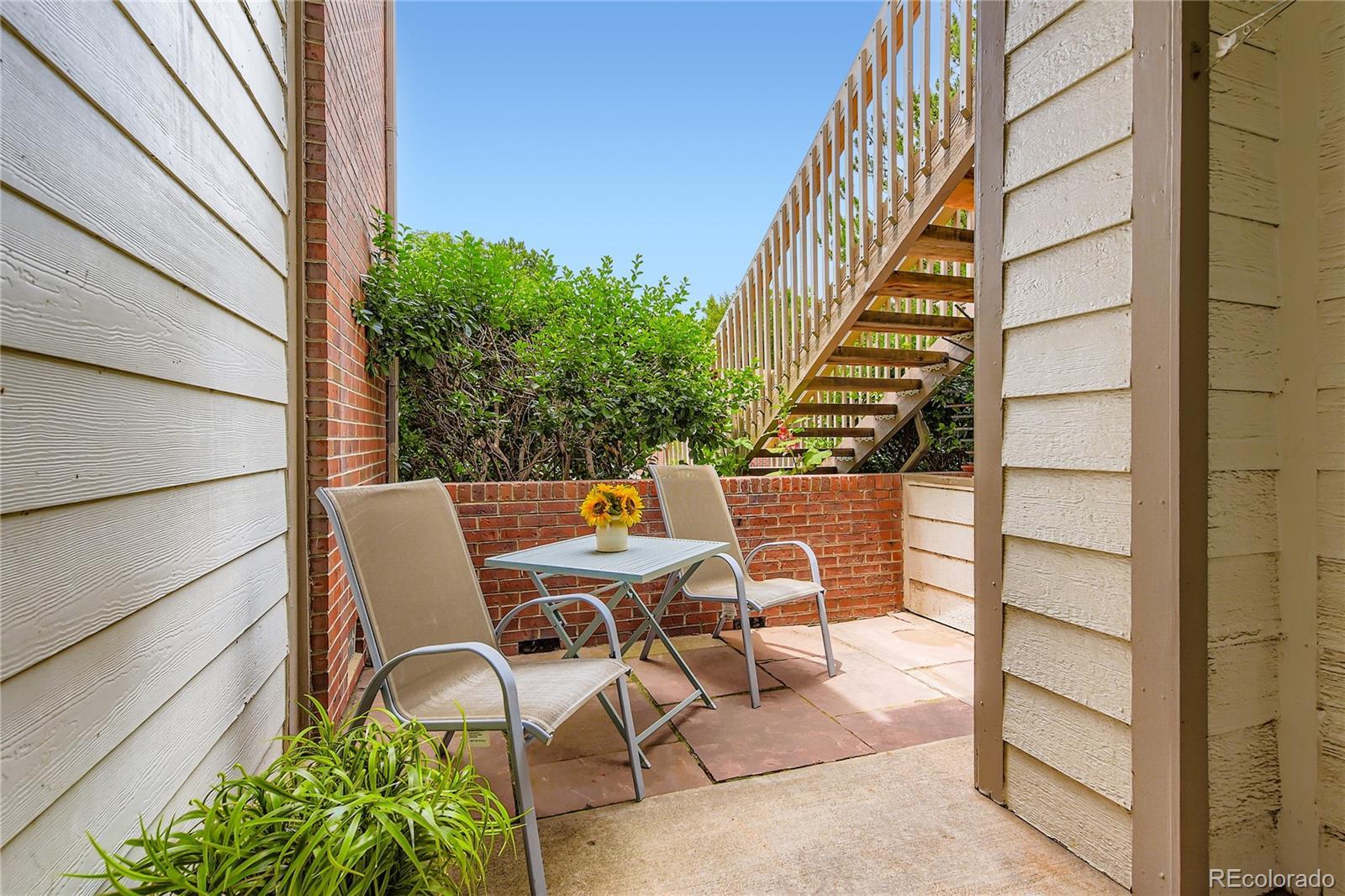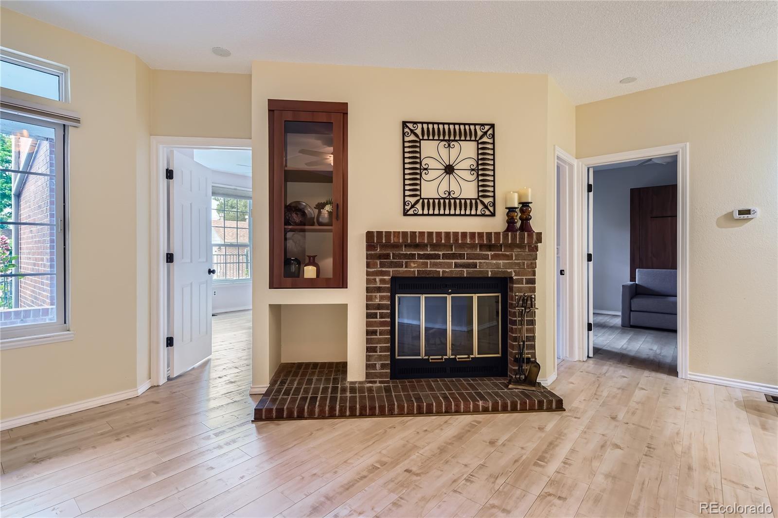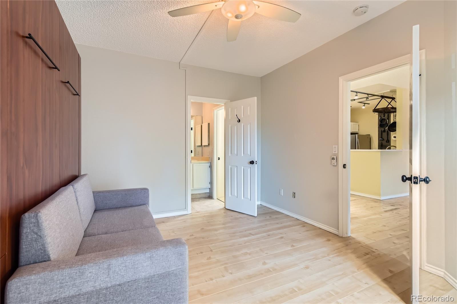 Immaculate, updated ground-floor 2 bedroom, 2 bath unit with a private patio, just steps from the pool! Attached garage with newer door and opener provides direct access into your home. Located just minutes from downtown Littleton in a beautiful well-maintained complex surround by Centennial Golf course. Enjoy modern living with newer windows complete with Hunter Douglas blinds and LVP flooring throughout. The updated kitchen boasts track lighting, crisp white cabinets, stainless steel appliances, and a large pantry with convenient pull-out shelving. The newer LG washer and dryer included. The living room offers comfort with a ceiling fan, a cozy wood-burning fireplace, and a built-in cabinet storage. The primary bedroom features a built-in Murphy bed, ceiling fan, and a spacious walk-in closet with an organizer. A private covered patio, accessible from the primary bedroom, is perfect for pets or relaxation. The en-suite full bath has newer tile, countertops, and a new light fixture. A large second bedroom includes double doors, built-in cabinet storage, closet organizer and a ceiling fan. This prime location offers easy access to light rail, walking and bike paths along the South Platte River, Centennial Golf Course, and walking distance to all of historic downtown Littleton's shopping and restaurants.