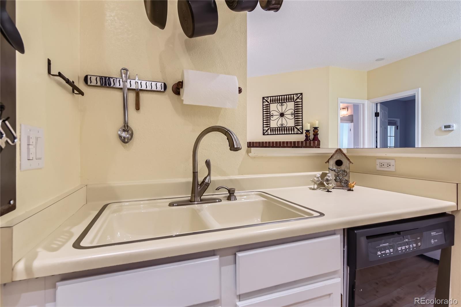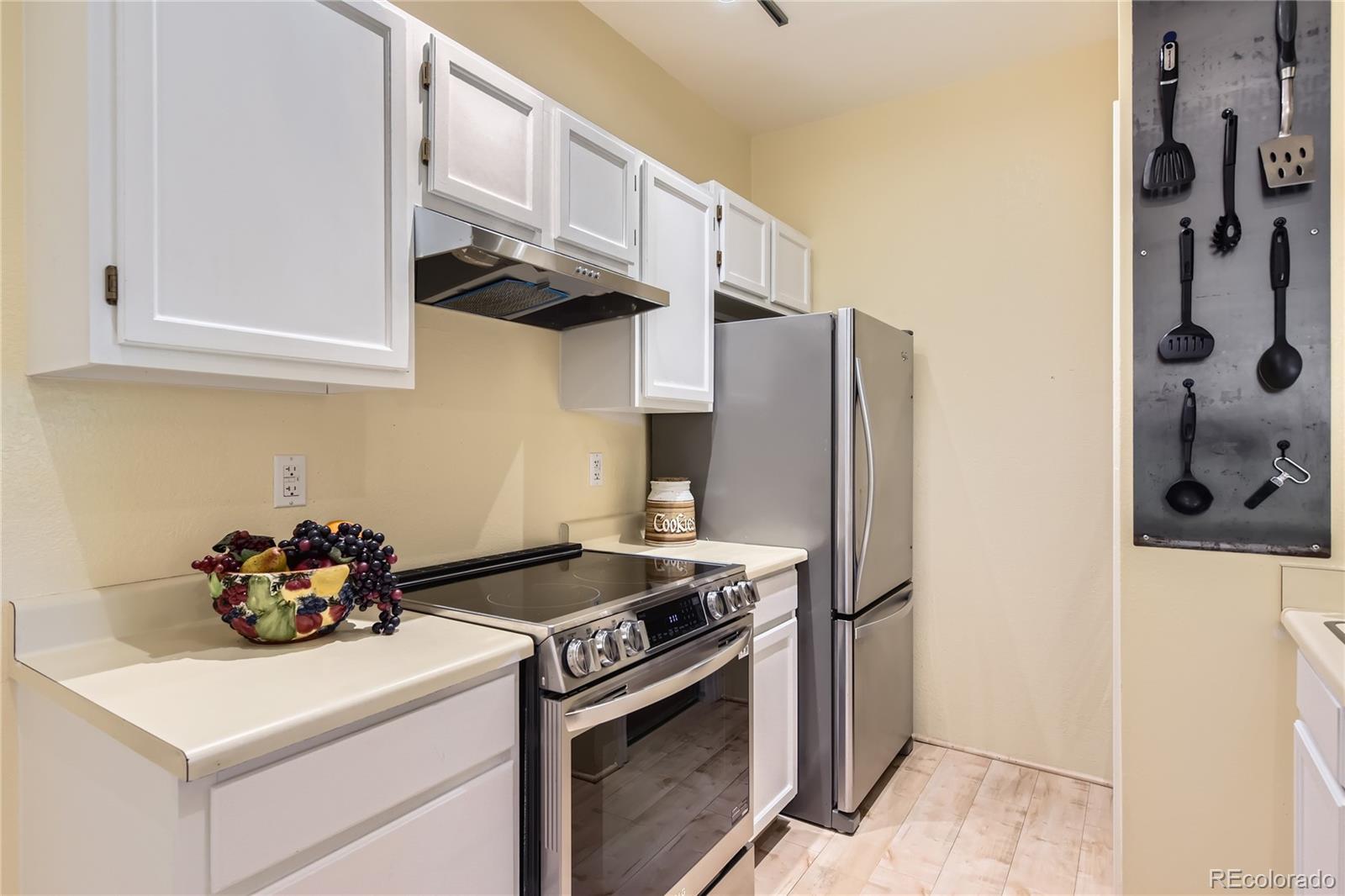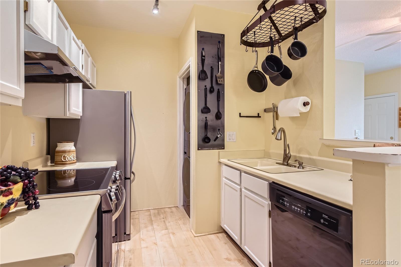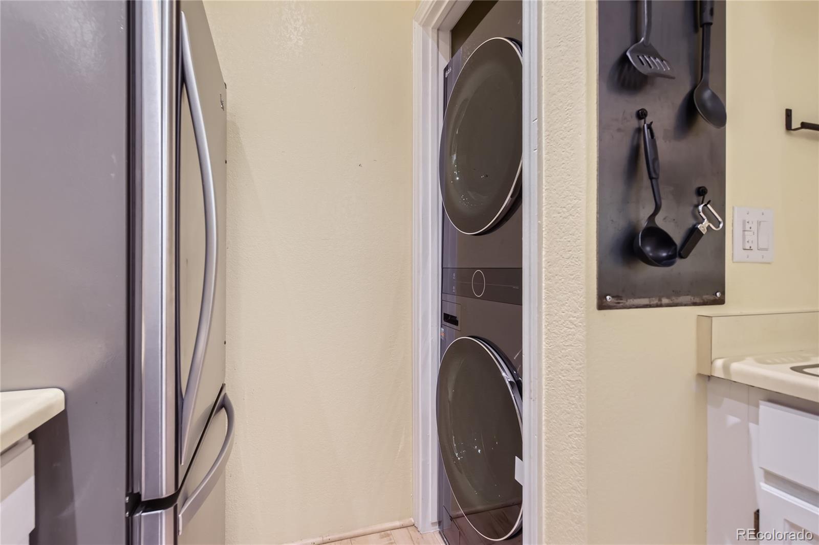 Immaculate, updated ground-floor 2 bedroom, 2 bath unit with a private patio, just steps from the pool! Attached garage with newer door and opener provides direct access into your home. Located just minutes from downtown Littleton in a beautiful well-maintained complex surround by Centennial Golf course. Enjoy modern living with newer windows complete with Hunter Douglas blinds and LVP flooring throughout. The updated kitchen boasts track lighting, crisp white cabinets, stainless steel appliances, and a large pantry with convenient pull-out shelving. The newer LG washer and dryer included. The living room offers comfort with a ceiling fan, a cozy wood-burning fireplace, and a built-in cabinet storage. The primary bedroom features a built-in Murphy bed, ceiling fan, and a spacious walk-in closet with an organizer. A private covered patio, accessible from the primary bedroom, is perfect for pets or relaxation. The en-suite full bath has newer tile, countertops, and a new light fixture. A large second bedroom includes double doors, built-in cabinet storage, closet organizer and a ceiling fan. This prime location offers easy access to light rail, walking and bike paths along the South Platte River, Centennial Golf Course, and walking distance to all of historic downtown Littleton's shopping and restaurants.
