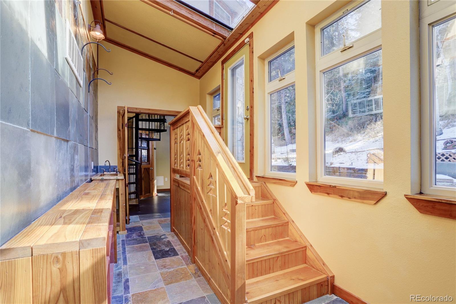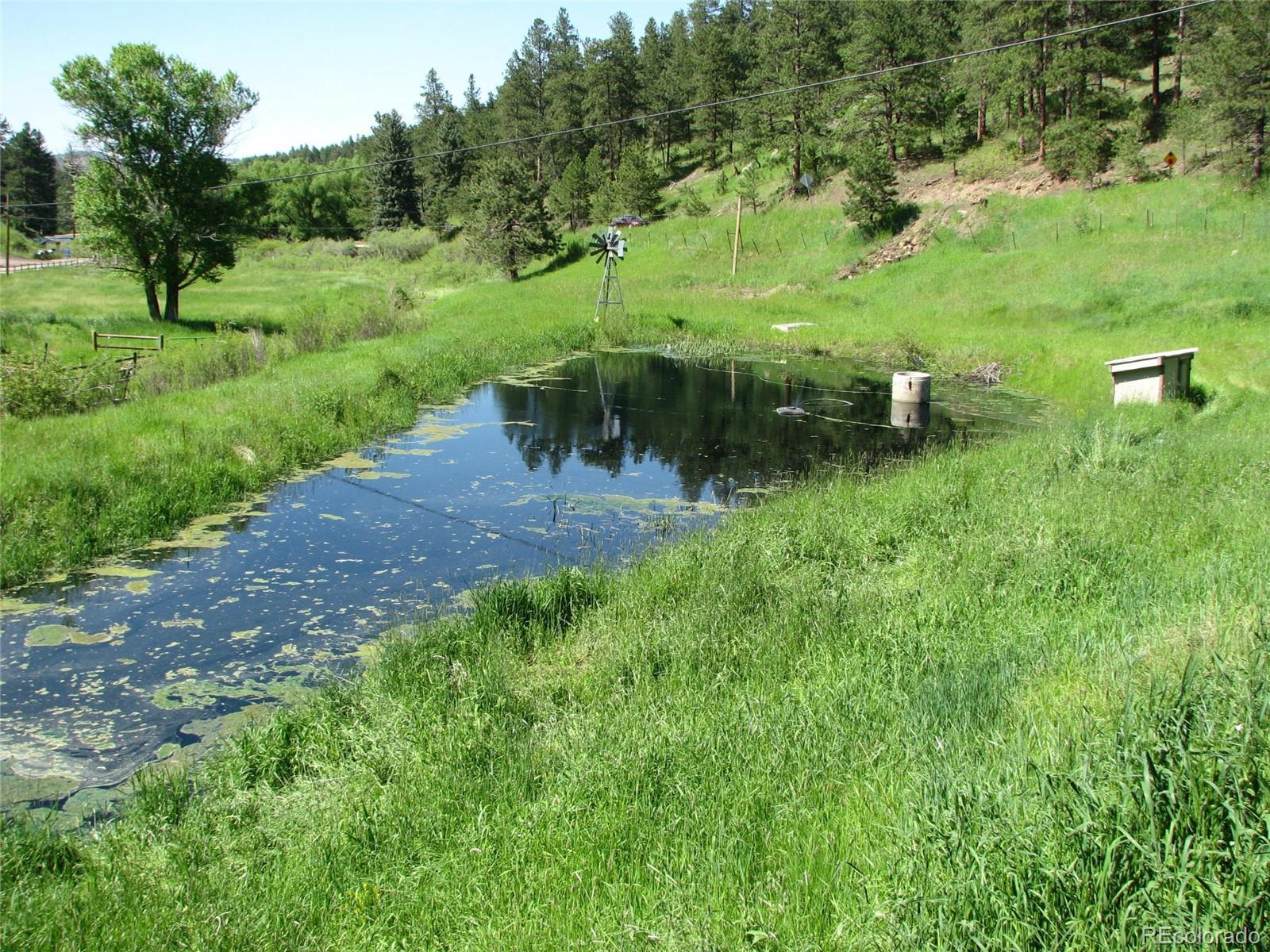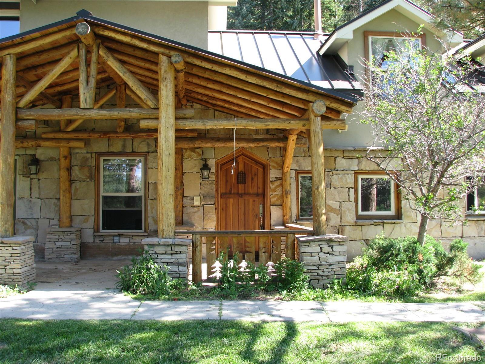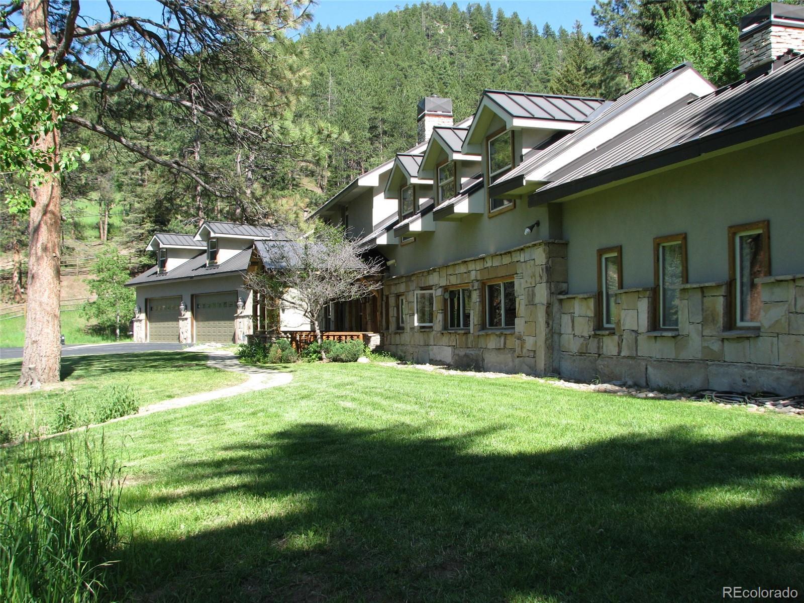 Detailed, sprawling, and classic layout found in no other Mountain retreat sitting minutes from Hwy 285 and 8 miles to C-470. This expansive Retreat features intricate wood and stone style emphasizing a layout that feels as if nothing else exists outside its solitude. While featuring its own meadow on its luxurious 5.46 acres, it also boasts its own pond fed by a natural spring for fresh mountain water, adding its tranquil sound to the quiet peace of the land. It greets with a large, paved drive as it winds its way over its creek bridge and reveals the grandness of the stone façade and beautifully coordinated solid metal roof, bringing both style, security, and its own subtle majesty. Incorporated into its modern amenities is the Original log cabin that stood proudly on the site in the late 1800s. It cunningly melds its history with its stunningly peaceful and expansive gourmet kitchen that savors its expansive counters and storage space surrounding the large island center space, enabling the gas range burners to function between electric cook tops on both sides enjoying ample counter space, allowing the chef to freely look around the detailed designs and walk around feeling the openness of the surrounding land. Kitchens high exposed-beam ceilings surrounded by chinked logs walls lift the spirit of creativity. Main house features custom made wood doors with vintage-style arched pointed tops. Some of these stunning doors feature glass panes with deep colors bringing warmth into their rooms. The main gas fireplace in great room adds a water feature which mimics the sounds of the creek just outside. Main house radiant heat in main floor and upstairs, plus two gas furnaces with A/C as backup to always meet what is desired. Three tankless water heaters, two in main house and one for garage and living area over garage. The newer expansive 4 car garage with living area is attached to main house by enclosed walkway. Newer barn with a basement has ample space for many uses.