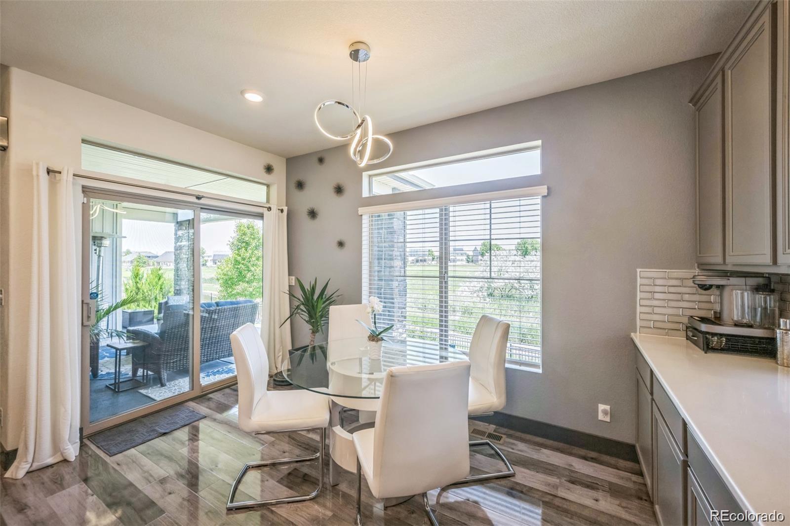 This beautifully crafted single-family home offers stylish, low-maintenance living with luxurious finishes and serene outdoor space. Inside, an open-concept layout welcomes you with coffered ceilings, designer lighting, and a spacious living area that flows seamlessly into the gourmet kitchen—complete with a large center island, stainless steel appliances, walk-in pantry, and elegant cabinetry. The bright dining area opens to a covered patio, perfect for entertaining or enjoying quiet mornings overlooking the landscaped yard with walkaround pathway and gorgeous Green Valley Ranch Golf Club. Additional features include arched doorways, a dedicated office or flex room, a large laundry area, storage lift in garage, and spacious master bedrooms with walk-in closet. Blending comfort, sophistication, and modern design, this home is perfectly situated in a peaceful and well-kept gated community with private keyed/gated community pool.