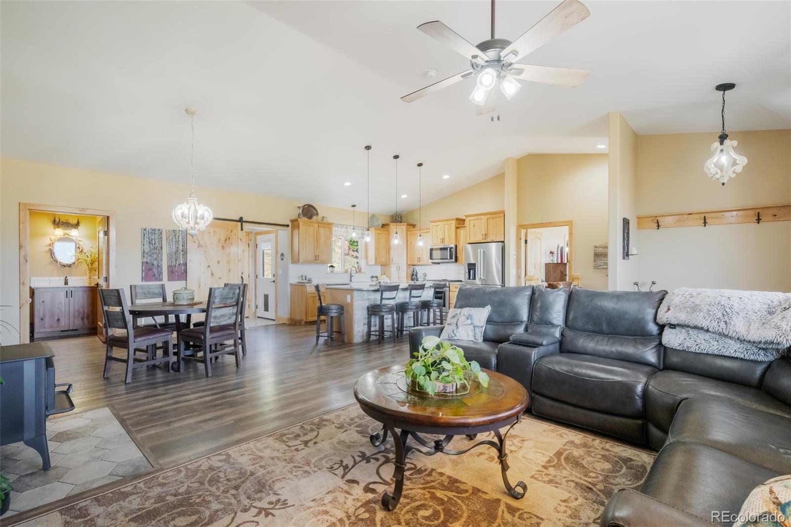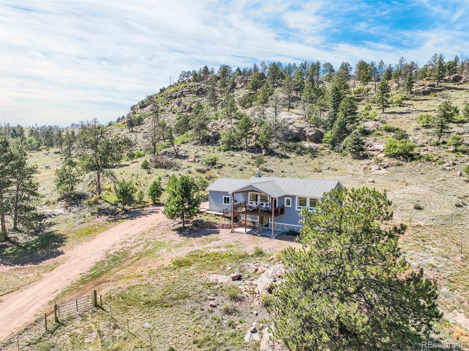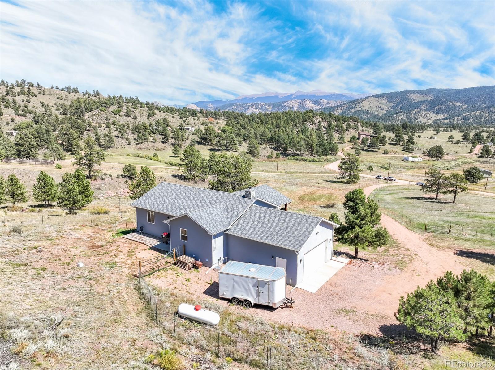 Experience the essence of mountain living in this custom-built ranch-style home on 11.8 picturesque acres in Florissant, CO. Designed with comfort mountain style, this stucco home combines elegance with rugged beauty, perfectly complementing the natural surroundings. As you approach, you'll be captivated by sweeping views of the iconic Pikes Peak and the striking rock outcroppings scattered across the property. The expansive acreage offers ample space for both leisure and livestock, complete with a barn featuring 2 stalls and multiple fenced pastures, ideal for equestrian enthusiasts or those seeking a hobby farm. Inside, the home boasts a seamless blend of rustic charm and modern sophistication. The heart of the home is its open concept great room and the kitchen is a chef's dream outfitted with top-of-the-line appliances, sleek finishes, and ample storage. Whether preparing gourmet meals or hosting friends and family, this kitchen ensures effortless functionality and style. The raised ranch layout provides ease of living, with spacious living areas and picture windows that open to breathtaking outdoor vistas, filling the home with natural light and creating an inviting atmosphere. Enjoy the best of indoor-outdoor living as you relax on the porch, savoring the crisp mountain air and panoramic views that stretch across the horizon. With endless possibilities for recreation and serene privacy, this property offers a rare combination of luxury, comfort, and the beauty of Colorado’s high country. Whether you’re looking for a peaceful retreat or a full-time residence, this property offers a truly unique mountain lifestyle.