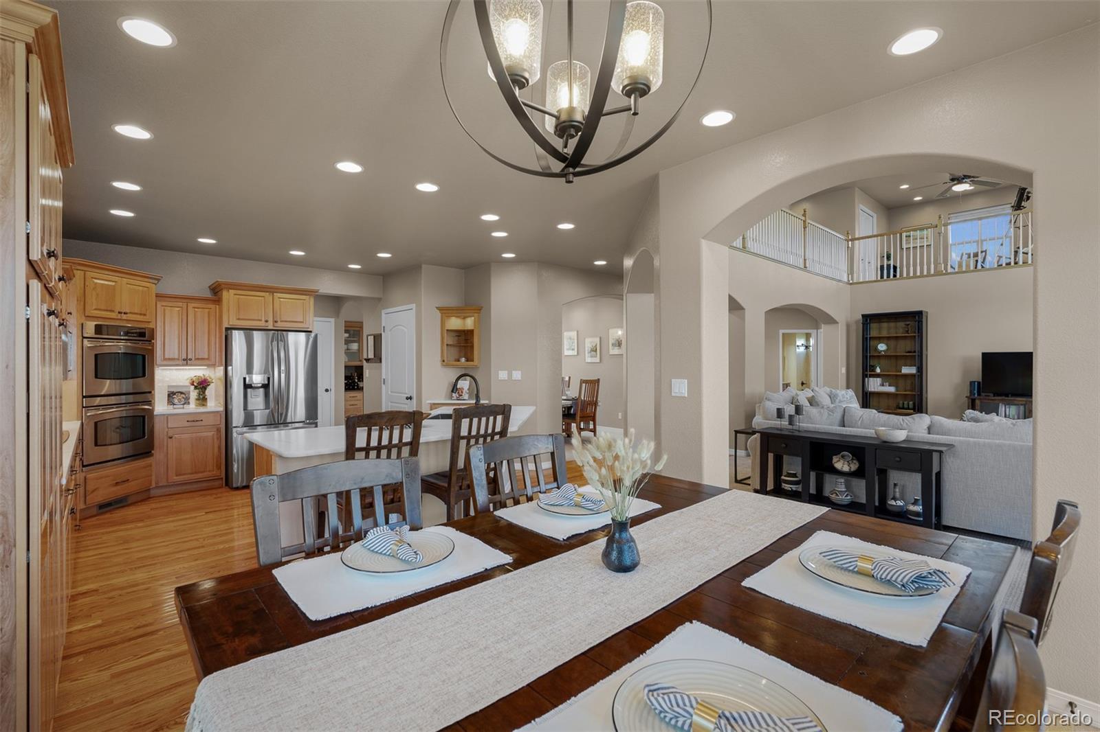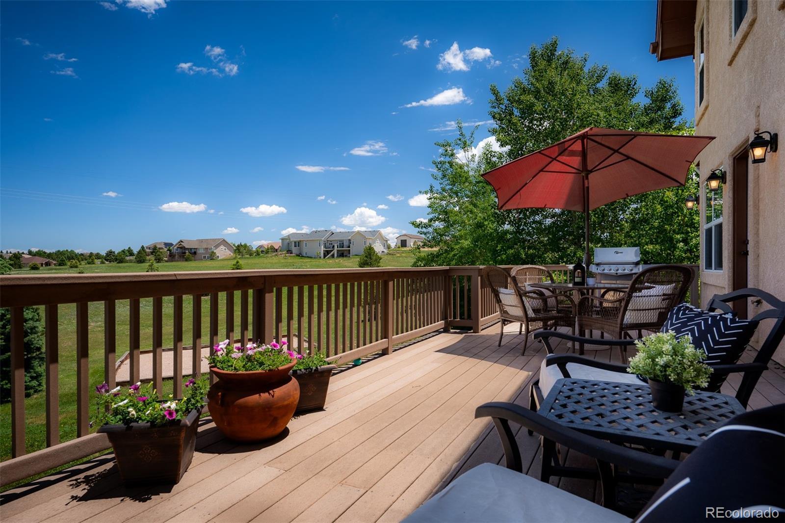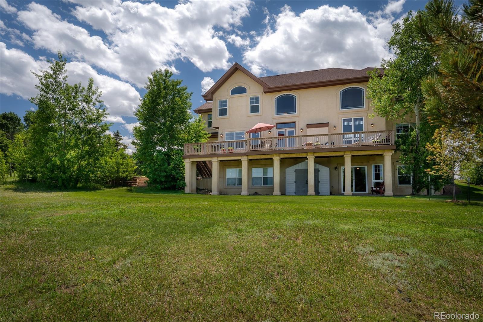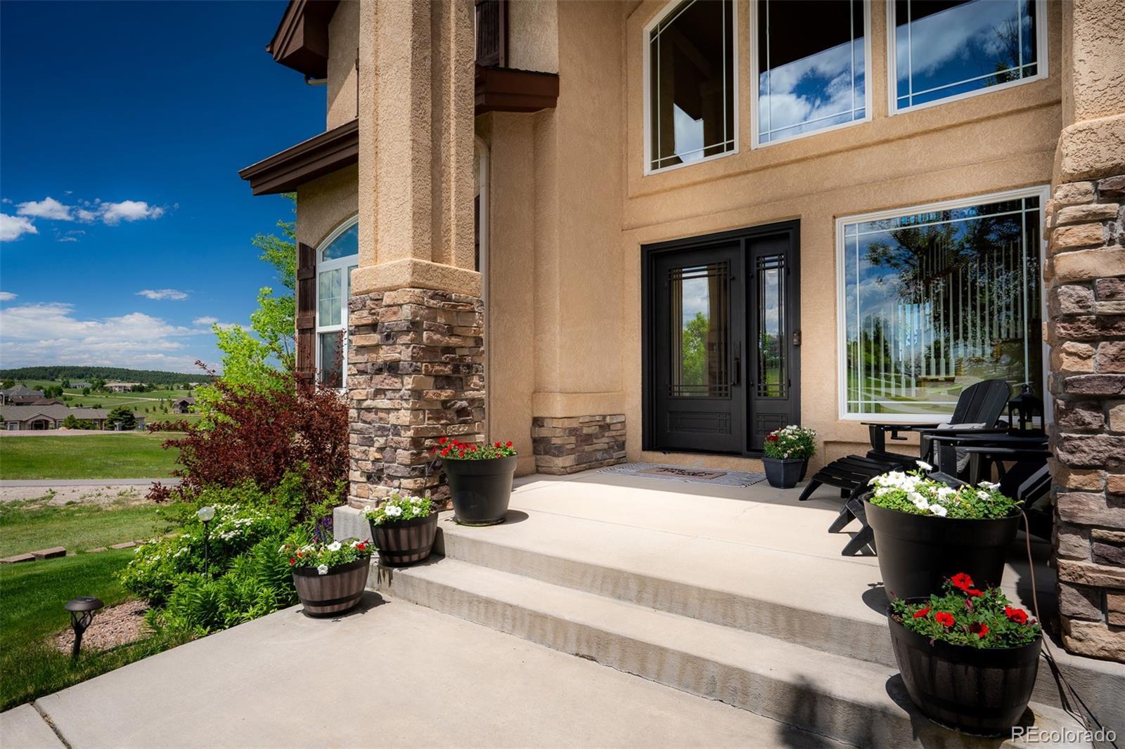 Welcome to this exquisite luxury home in the prestigious Kings Deer neighborhood of Monument, Colorado—set on a private, beautifully landscaped acreage just minutes from the golf course. This custom-designed Goetzman home has been lovingly maintained by its original owners and offers a blend of timeless elegance and modern updates throughout. Step inside to soaring tall ceilings, rounded stairs, new lighting, beautiful hardwood floors, textured carpet, and three fireplaces that create warmth and character. The newly renovated chef’s kitchen is a showstopper, featuring quartz countertops, stainless steel appliances, a beverage bar, and a unique butterfly bar that opens into the living room for seamless, open-concept living. A cozy informal dining area, beautiful formal dining room, custom mudroom with built-ins, and a spacious four-car oversized garage add everyday convenience and luxury. The primary suite is a true retreat, complete with a see-through fireplace, sitting area, breathtaking views, a huge walk-in closet, and an updated spa-like bathroom. Enjoy the outdoors from your low-maintenance deck with serene mountain views, or relax in the immaculately landscaped yard filled with colorful perennials. The walkout basement offers even more space with additional bedrooms, a large living area, home theater equipt with all theater and sound equipment, workout room, and plenty of storage. With custom front door with sidelights, and incredible attention to detail throughout, this home is the perfect blend of elegance, comfort, and privacy. Welcome to your dream home in Kings Deer! This is one of Colorado's Finest.