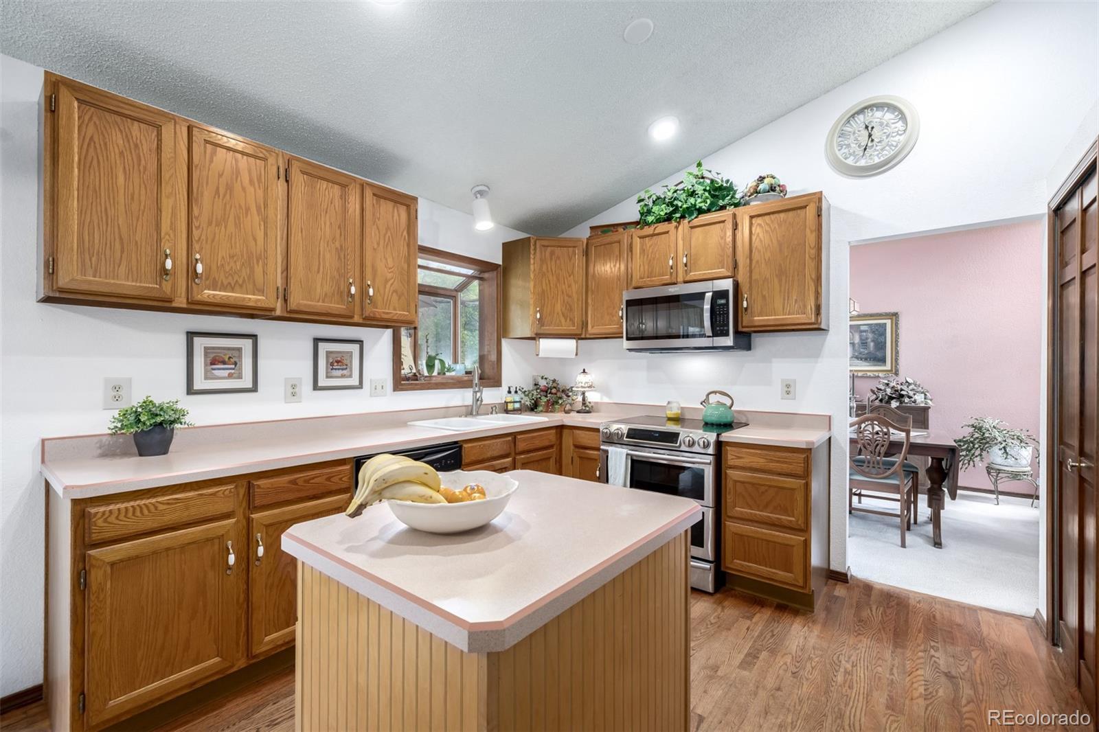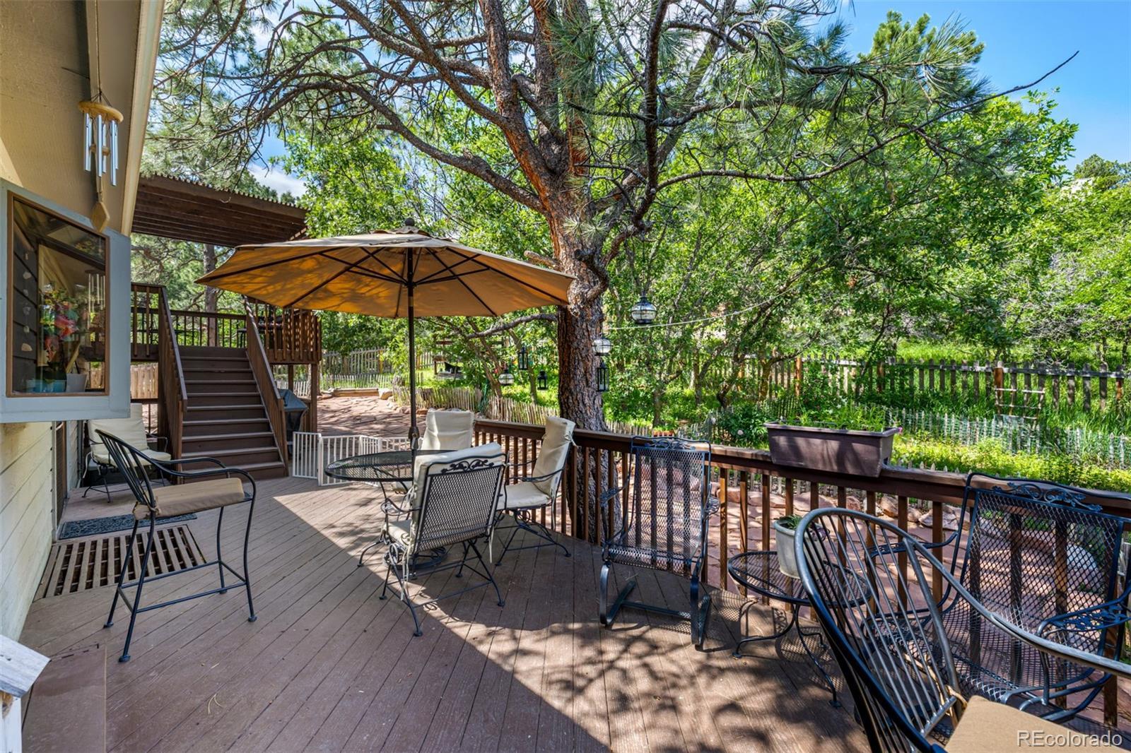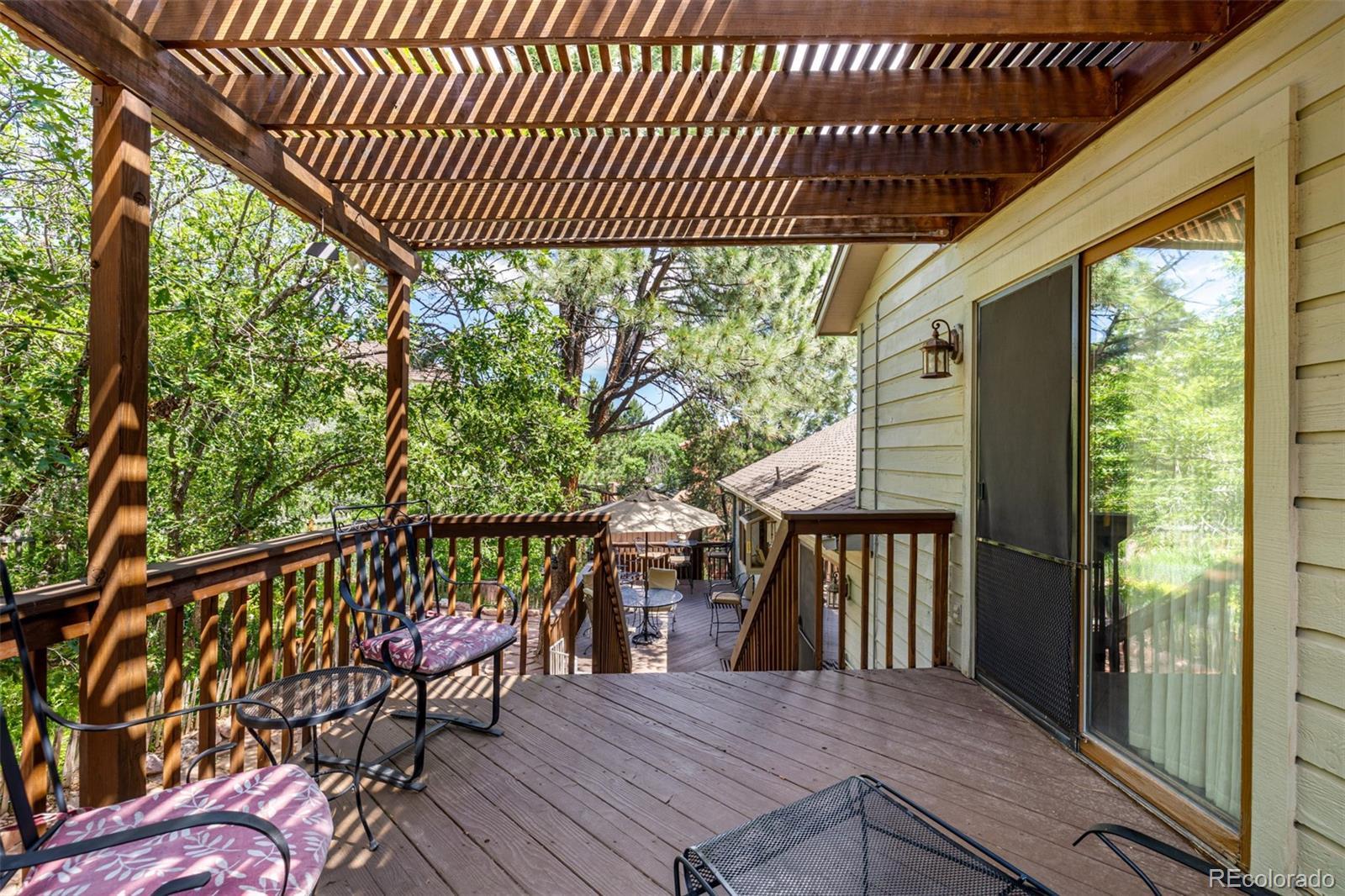 Tucked within the serenity of a quiet neighborhood in the acclaimed D-20 school district, this 6-bedroom residence offers a timeless blend of classic charm and thoughtful design. Set atop a gentle rise, the home is framed by mature trees and lush landscaping to create a rare sense of privacy and calm. A graceful entry unfolds to a spacious living room where vaulted ceilings and oversized picture windows bring natural light and airiness to the forefront. From here, the layout unfolds into a formal dining room, where clerestory windows filter sunlight in soft, shifting patterns, while a broad rear window frames a tranquil view of the lush backyard beyond. The kitchen, lovingly preserved in its original finishes, feels warm and inviting, with stainless steel appliances, abundant counter space, and a clever prep island offering both function and charm. A bright breakfast nook gazes out toward the deck, an ideal spot for quiet mornings. Upstairs, the primary suite offers a sense of retreat, anchored by its own vaulted ceiling and private balcony—an ideal perch for moments of solitude. The attached ensuite and walk-in closet lend comfort and practicality. Two additional upper-level bedrooms mirror each other in form and function, each with generous layouts, ample storage, and delightful window seats. A fourth upper bedroom offers additional versatility. On the garden level, a warm and welcoming family room centers around a stone fireplace flanked by built-in shelving. A dedicated home office and 3 bedroom spaces on this level further expand the home’s flexibility, making room for guests, hobbies, or multigenerational living. Outside, thoughtfully landscaped paths of red sandstone meander through a flourishing garden where a pergola adds charm and shade to the expansive deck. Mature trees and lush plantings provide both beauty and seclusion, creating an outdoor experience that feels both vibrant and deeply peaceful.