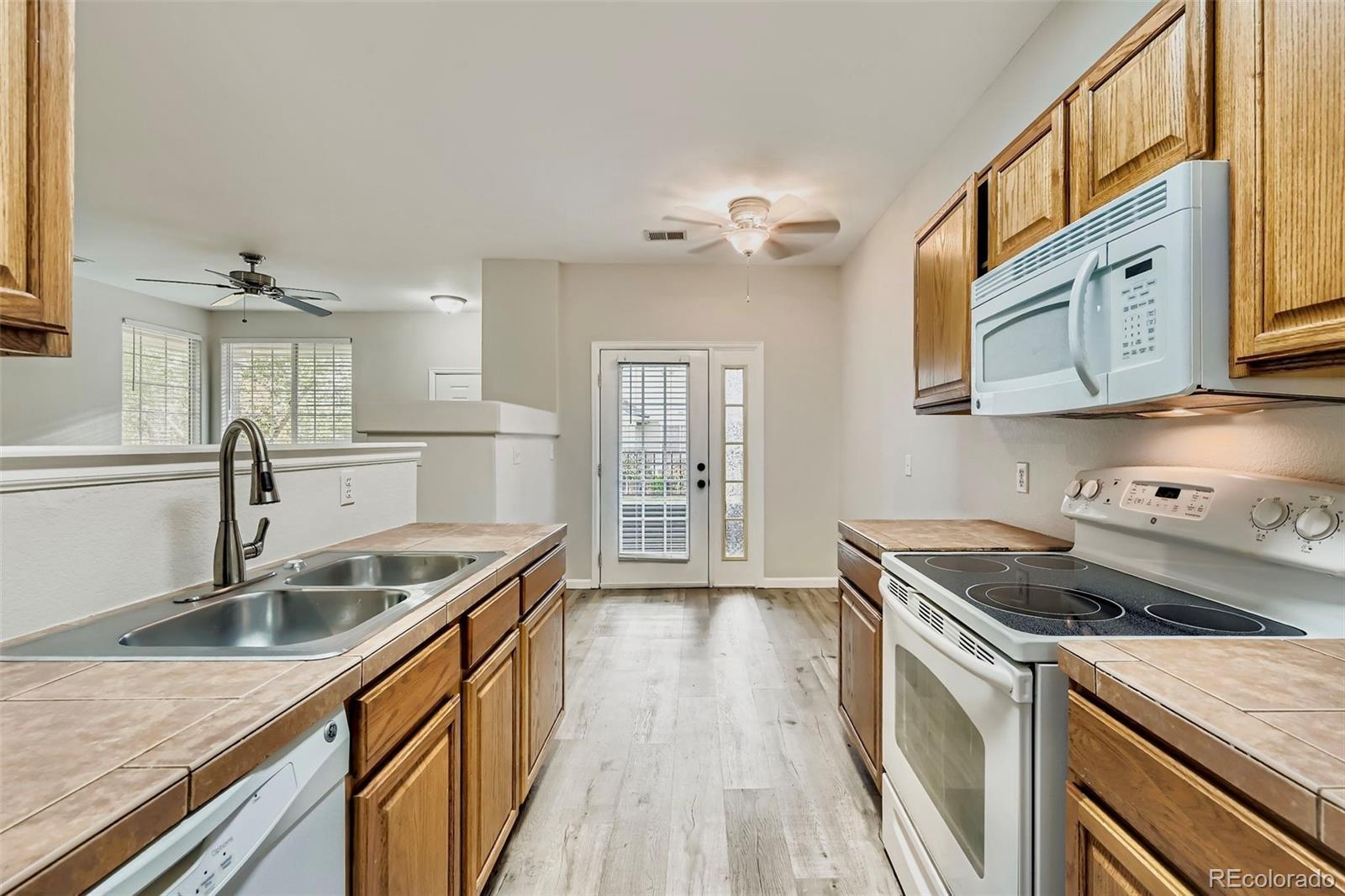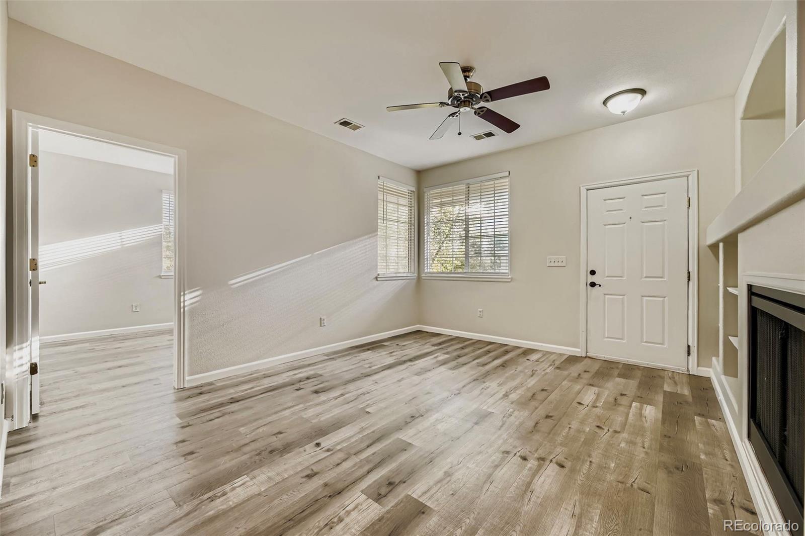 Effortless living in this ground level condo where convenience meets functionality. Beautifully updated and well-maintained 3 Bed/2 Bath condo in desirable Homestead at Saddle Rock Community of Aurora. This end unit condo offers a spacious and open living space with rich laminate plank flooring throughout that provides durability and convenience. Ground level entry features easy access to walking trails and adjacent open space. The home boasts an open floor plan with a spacious living/dining area. The kitchen opens into the main living areas, including an eat-in dining area, pantry height cabinets, oversized refrigerator and a private patio. Custom closet is located off the dining room doubles as a pantry and coat closet. The home features high ceilings with large windows to scatter light throughout the home. The primary bedroom is spacious and features a primary bathroom with soaking tub and spacious walk in closet with tons of built in shelving. A detached 1-car garage is just steps away from your front door and features a built-in work table and storage provide ample parking and storage space. Cherry Creek School District! Community amenities include pool and spa! Also enjoy access to the Saddle Rock South Community Center with pool and tennis courts!!
