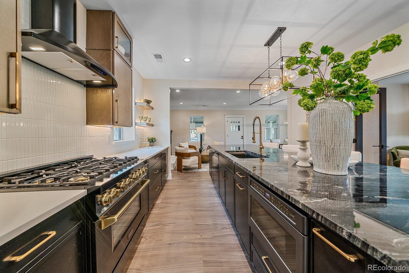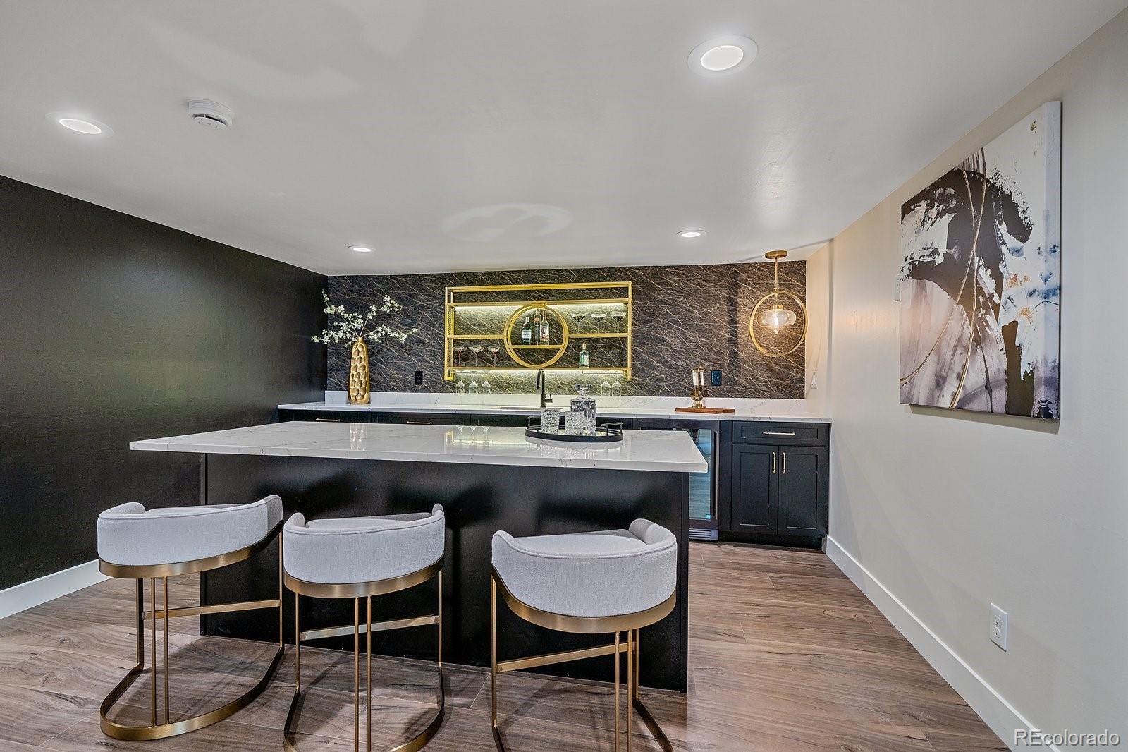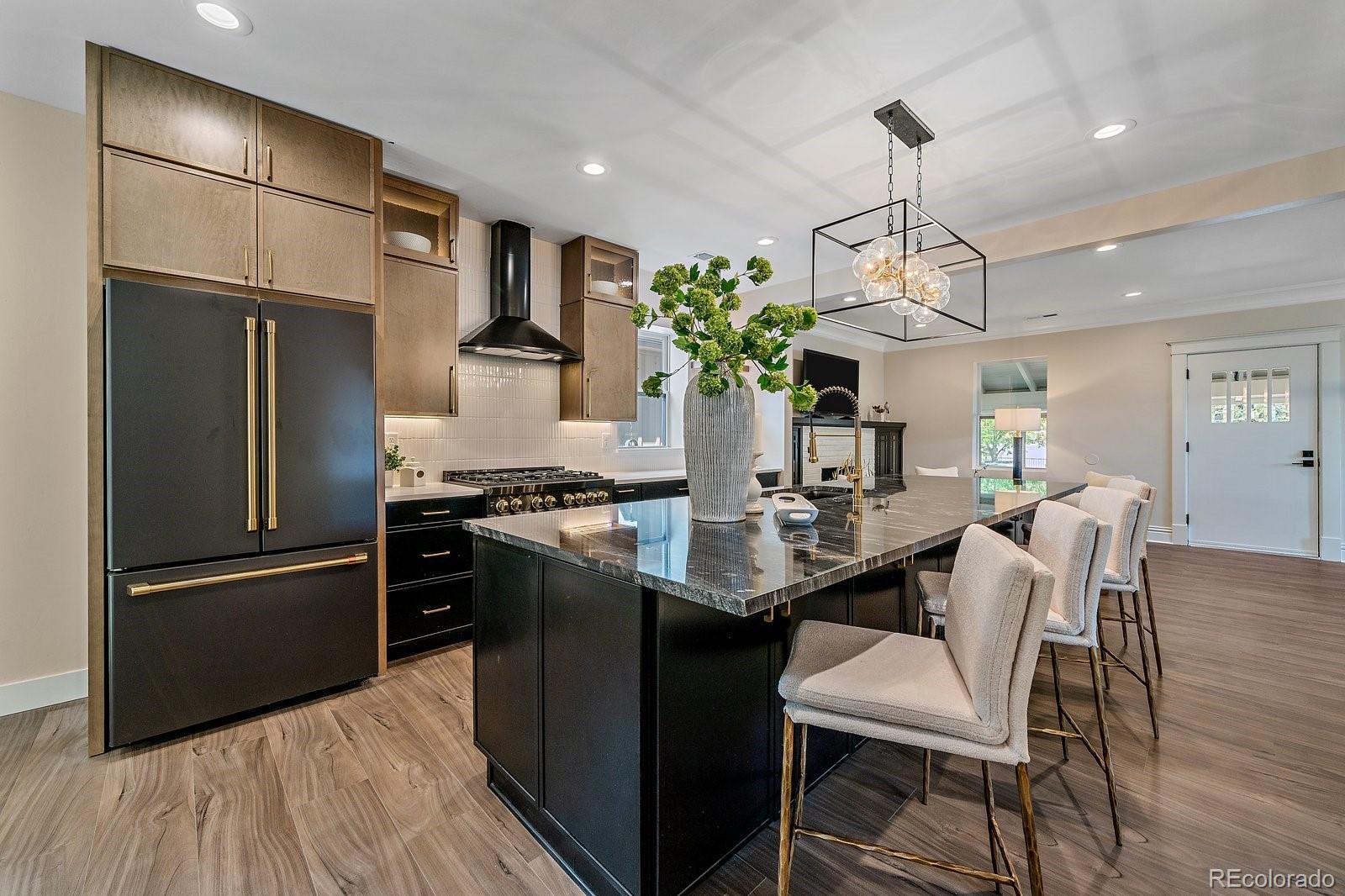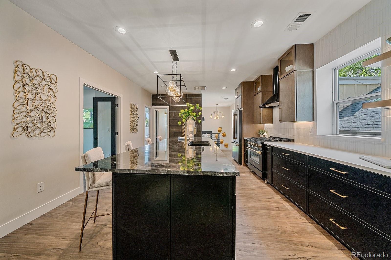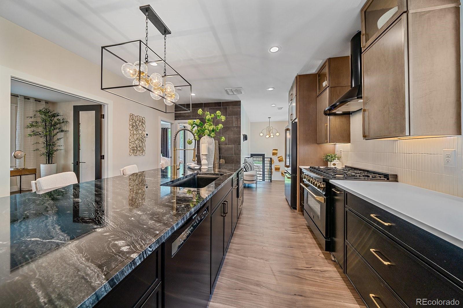 Tucked into the heart of Denver’s coveted Hale neighborhood, 805 Elm Street is a jaw-dropping fusion of timeless craftsmanship and bold design. This full-brick stunner keeps its original soul—refurbished built-ins, the charming front door, and a wood-burning fireplace—while elevating every inch with showstopping updates. Inside, stained maple cabinetry wraps the perimeter, contrasting perfectly with a sleek black island that seats six, finished in black granite and gold hardware. Black appliances and chopstick tile tie it all together, while midcentury lighting adds that effortlessly cool vibe. The kitchen features premium appliances, including a ZLINE Autograph Collection 36” 6-burner dual fuel range, Café matte black counter-depth fridge and built-in microwave drawer oven, Bosch matte black dishwasher, and a Zephyr matte black hood—all with brushed gold accents. The main level bathroom is a spa-like retreat: emerald green tile, black glass freestanding tub, and a European-style shower with dual heads. It’s bold. It’s breathtaking. And it’s just the beginning. Downstairs, the lower level transforms into a speakeasy-style lounge, complete with two more bedrooms, two full bathrooms, and flexible space for entertaining, workouts, or play—whatever your lifestyle demands. A sleek Zephyr wine cooler completes the basement wet bar setup. A brand new oversized 2-car garage (24’8” x 24’8”) is currently under construction, adding major value and convenience. Features we love: • Full brick exterior with preserved vintage charm • Designer kitchen with ZLINE, Café, Bosch & Zephyr appliances • Emerald-tiled spa bathroom with dual shower & tub • Speakeasy-inspired bar with wine cooler • Brand new 24’8” x 24’8” 2-car garage • Midcentury lighting throughout • Prime Hale location near parks, shops & dining • Main floor includes 2 spacious sun-filled bedrooms This home is where old-school charm meets bold, modern living. Come see what the buzz is all about