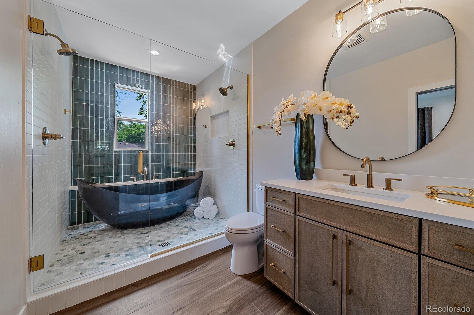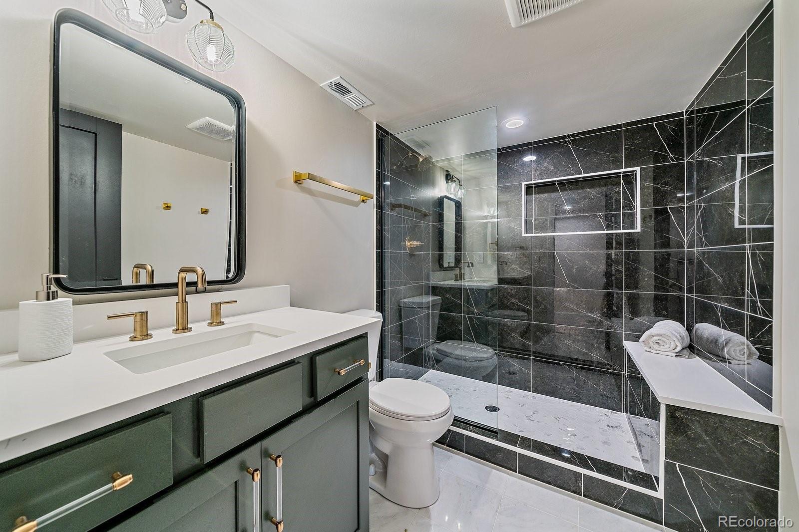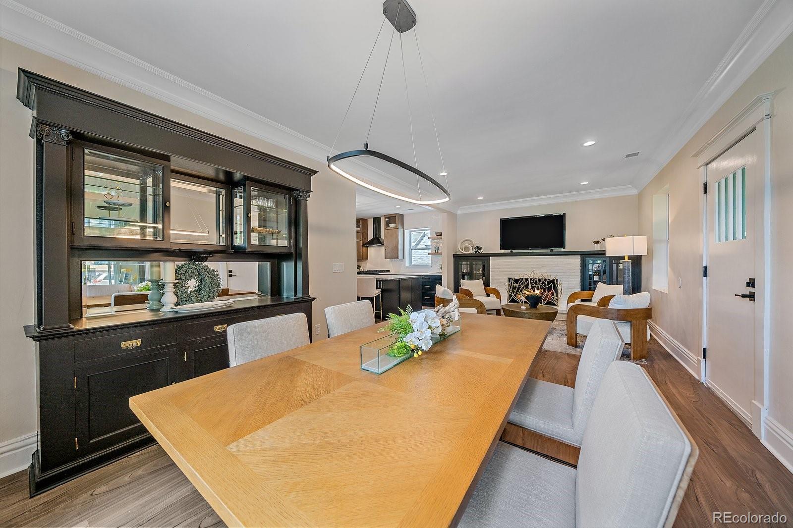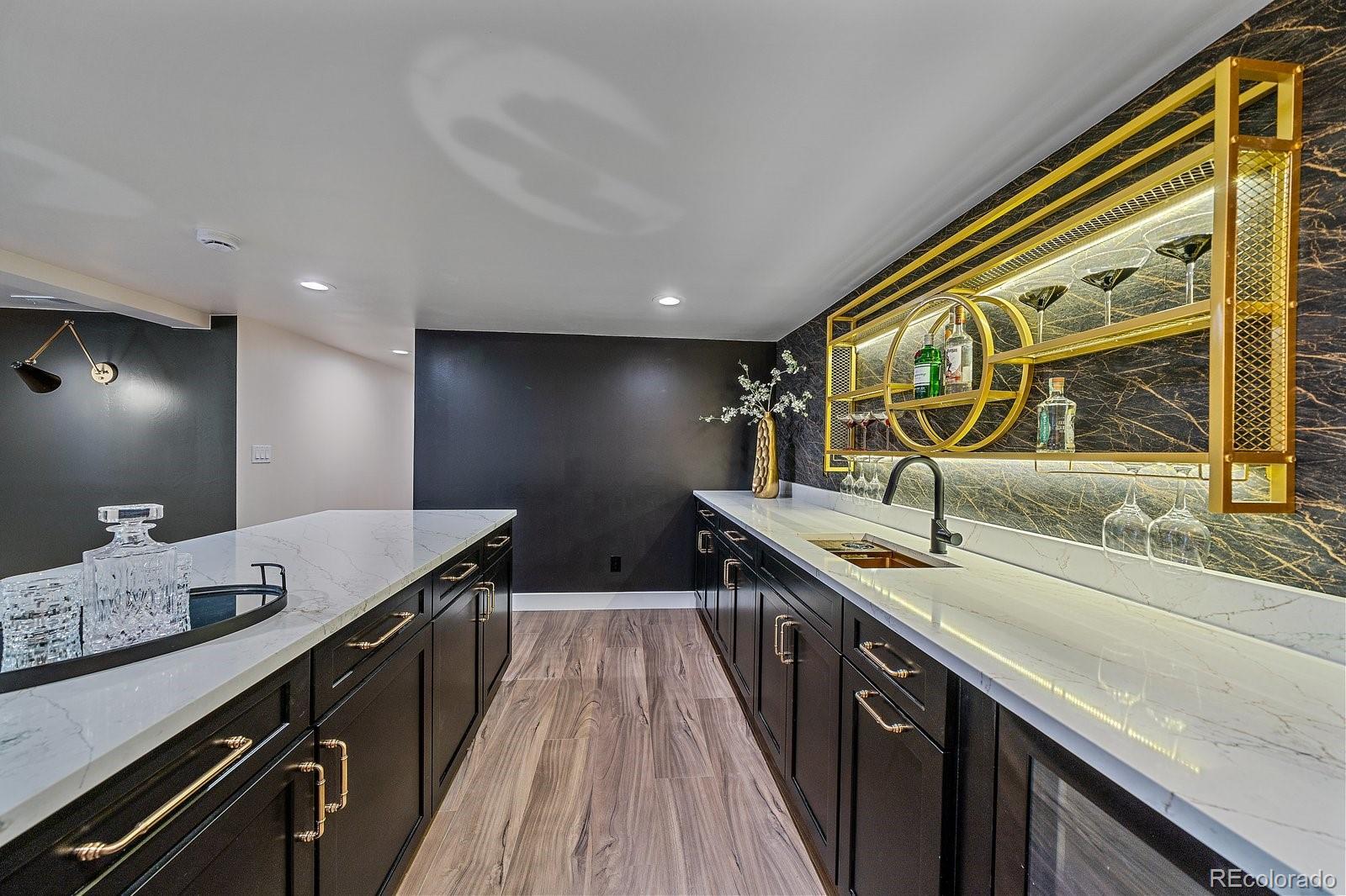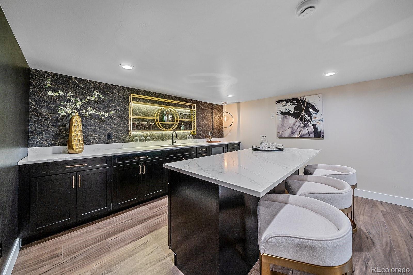 Tucked into the heart of Denver’s coveted Hale neighborhood, 805 Elm Street is a jaw-dropping fusion of timeless craftsmanship and bold design. This full-brick stunner keeps its original soul—refurbished built-ins, the charming front door, and a wood-burning fireplace—while elevating every inch with showstopping updates. Inside, stained maple cabinetry wraps the perimeter, contrasting perfectly with a sleek black island that seats six, finished in black granite and gold hardware. Black appliances and chopstick tile tie it all together, while midcentury lighting adds that effortlessly cool vibe. The kitchen features premium appliances, including a ZLINE Autograph Collection 36” 6-burner dual fuel range, Café matte black counter-depth fridge and built-in microwave drawer oven, Bosch matte black dishwasher, and a Zephyr matte black hood—all with brushed gold accents. The main level bathroom is a spa-like retreat: emerald green tile, black glass freestanding tub, and a European-style shower with dual heads. It’s bold. It’s breathtaking. And it’s just the beginning. Downstairs, the lower level transforms into a speakeasy-style lounge, complete with two more bedrooms, two full bathrooms, and flexible space for entertaining, workouts, or play—whatever your lifestyle demands. A sleek Zephyr wine cooler completes the basement wet bar setup. A brand new oversized 2-car garage (24’8” x 24’8”) is currently under construction, adding major value and convenience. Features we love: • Full brick exterior with preserved vintage charm • Designer kitchen with ZLINE, Café, Bosch & Zephyr appliances • Emerald-tiled spa bathroom with dual shower & tub • Speakeasy-inspired bar with wine cooler • Brand new 24’8” x 24’8” 2-car garage • Midcentury lighting throughout • Prime Hale location near parks, shops & dining • Main floor includes 2 spacious sun-filled bedrooms This home is where old-school charm meets bold, modern living. Come see what the buzz is all about