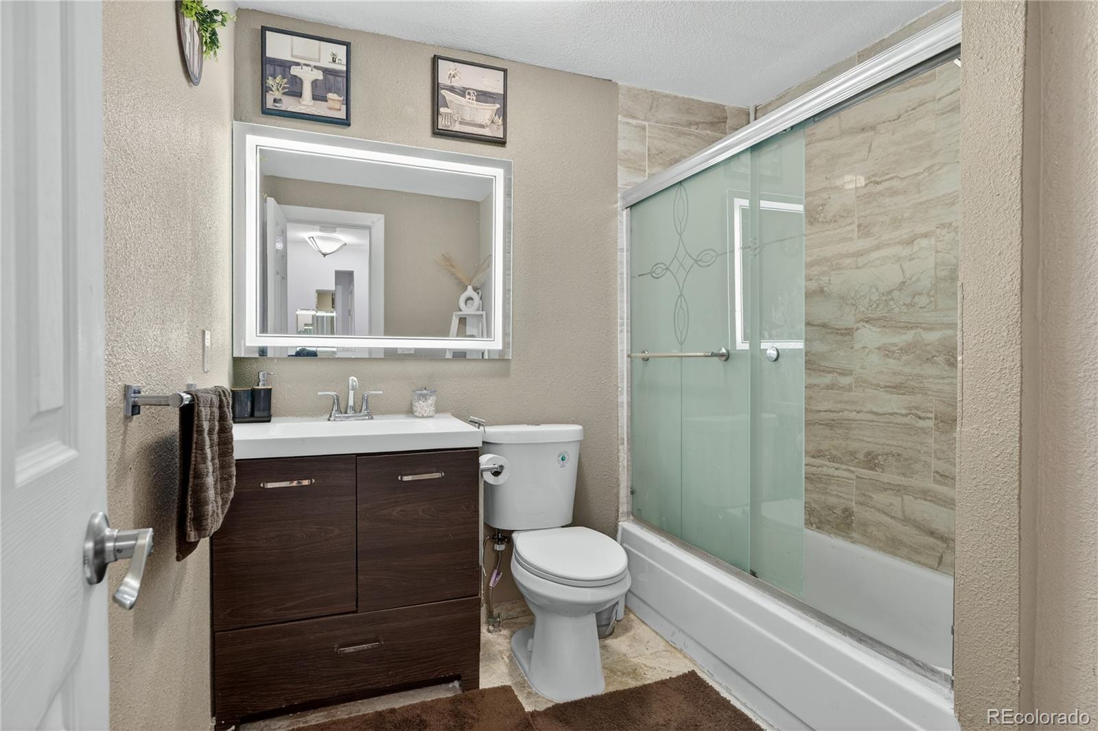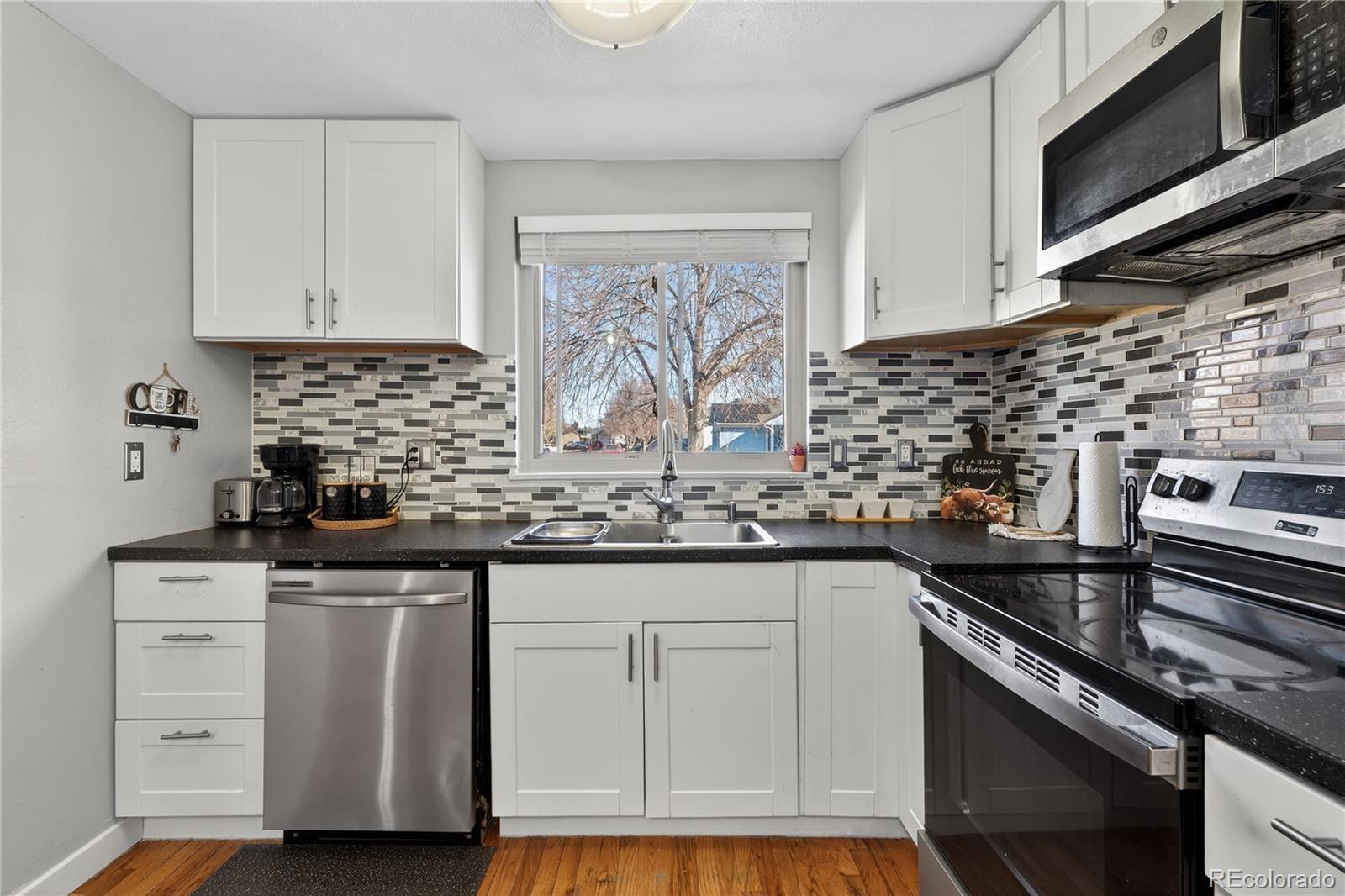 This beautifully maintained ranch home offers move-in ready comfort with updates throughout. Freshly painted with new baseboards, the home features a bright and inviting kitchen with new cabinets, new stainless steel appliances, and an eat-in table area perfect for casual dining or morning coffee. Two spacious bedrooms on the main level share a full bathroom, while the finished basement provides a separate entrance, a flexible living space, a non-conforming bedroom, and an additional bathroom, making it ideal for multi-generational living or a potential Airbnb/Vrbo short-term rental. Recent updates completed in the past year include new carpet, new bathroom sinks, new toilets, and new tile, giving the home a fresh and modern feel. The large backyard and front yard are fully covered with low-maintenance turf, providing plenty of space for outdoor activities or entertaining. A one-car garage adds convenience and extra storage. Situated in a quiet neighborhood with no HOA, this home offers easy access to Buckley Space Force and E-470, combining peaceful suburban living with practical commuting options.