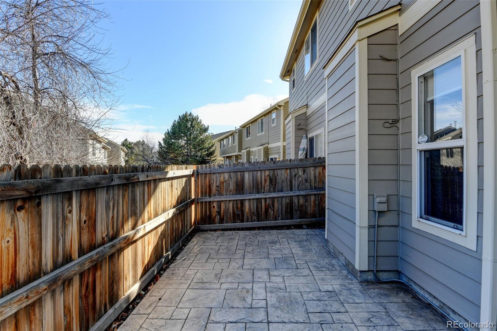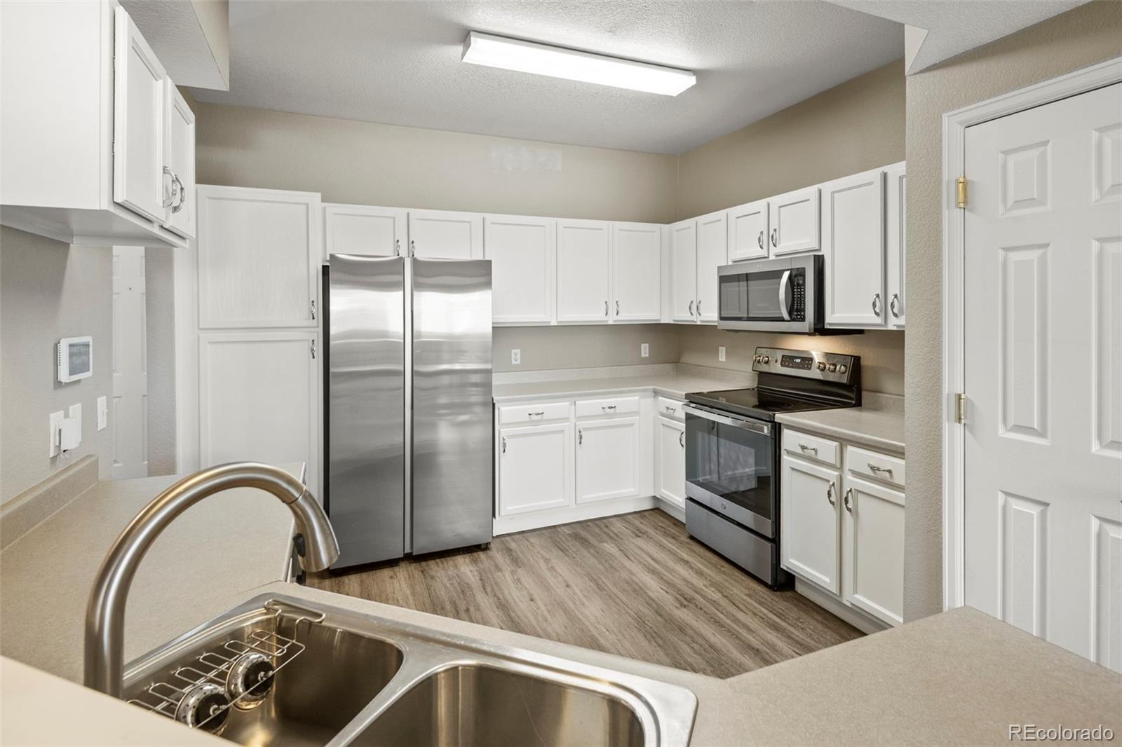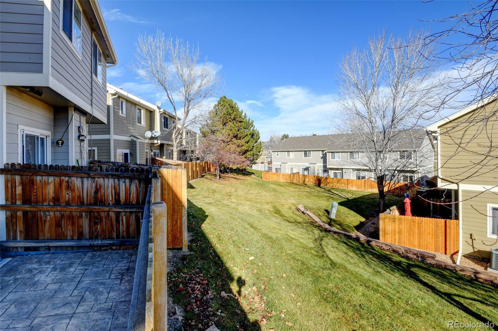 Beautiful townhome-style condominium backing to the community greenbelt with a private fenced back patio! Open concept main floor with newer LVP flooring and great natural lighting! Kitchen has all stainless appliances including a new refrigerator and new dishwasher! Main floor laundry room with full sized front loading washer and dryer included! New carpet in both bedrooms! Plenty of visitor parking spaces available, and this unit backs to the community greenbelt, away from street noise! Easy access to I-25, shopping, and restaurants!