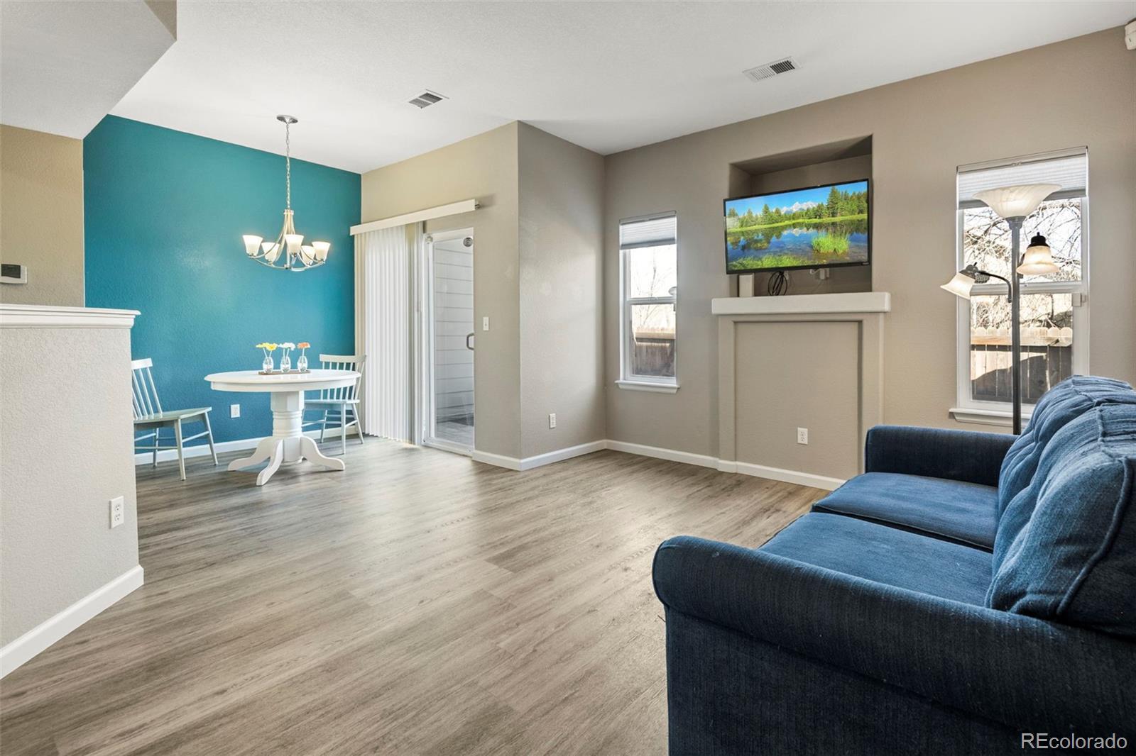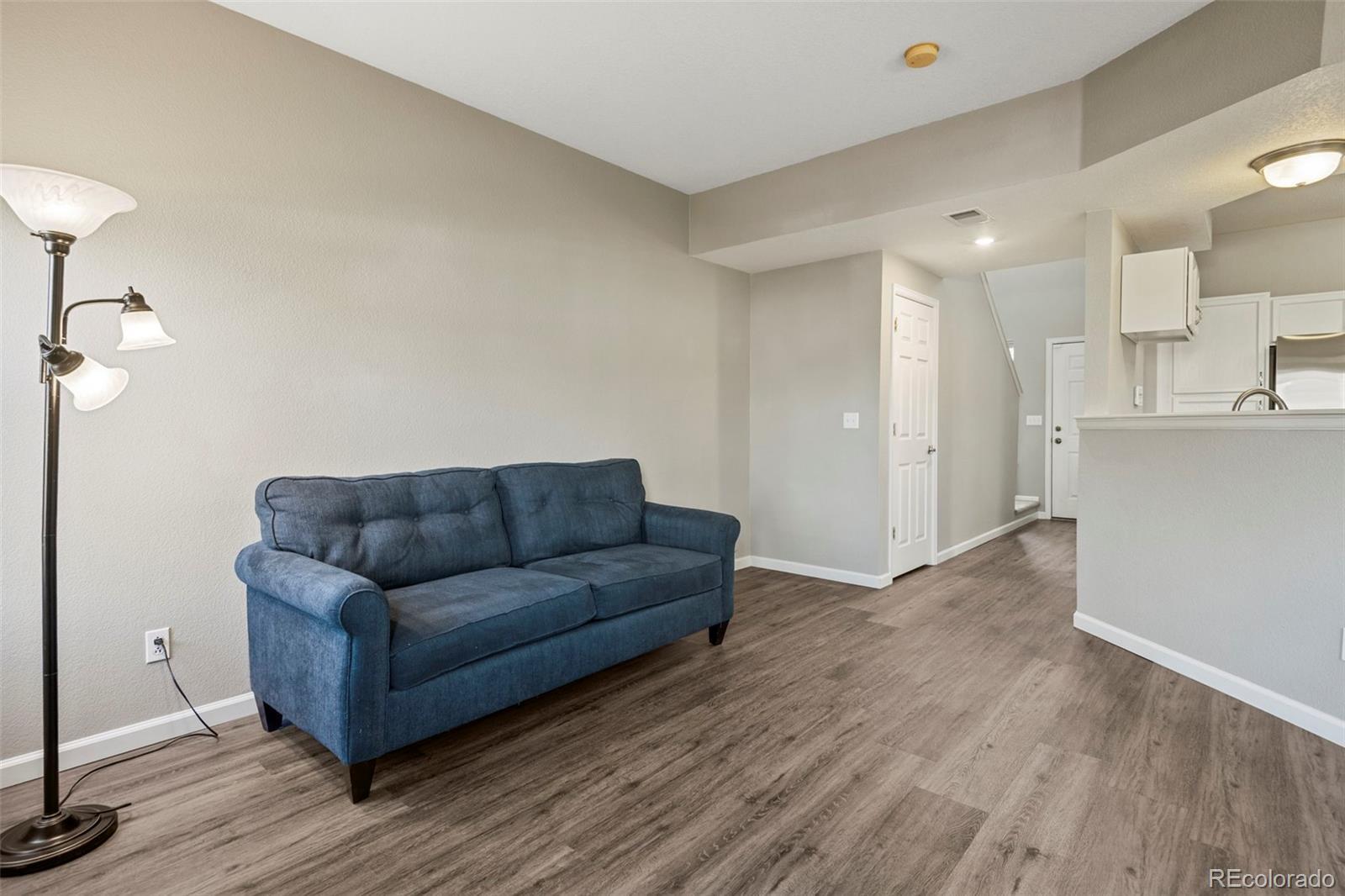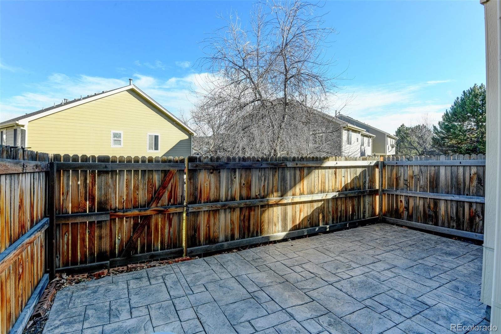 Beautiful townhome-style condominium backing to the community greenbelt with a private fenced back patio! Open concept main floor with newer LVP flooring and great natural lighting! Kitchen has all stainless appliances including a new refrigerator and new dishwasher! Main floor laundry room with full sized front loading washer and dryer included! New carpet in both bedrooms! Plenty of visitor parking spaces available, and this unit backs to the community greenbelt, away from street noise! Easy access to I-25, shopping, and restaurants!
