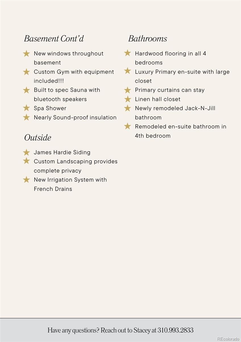 Welcome to one of Weatherstone’s most refined and extensively upgraded homes, where craftsmanship, comfort, and smart investment intersect. Located in one of Highlands Ranch’s most desirable neighborhoods, this 4-bedroom, 5-bathroom residence is truly turnkey. - The big-ticket items are already done for you: - Brand new HVAC system with Full House HEPA Filtration System - New electrical panel - James Hardie fiber cement siding - Tankless hot water heater These high-cost upgrades offer long-term peace of mind, energy efficiency, and low maintenance for years to come. Inside, enjoy upscale finishes throughout, including Visual Comfort lighting, custom railings, and Merino wool carpeting. The chef’s kitchen blends beauty and functionality with real bronze fixtures, double-thick countertops, deep drawers, an induction cooktop, and a double-wide pantry. Adjacent, the open living area features a cozy gas fireplace and window treatments that stay with the home. Step into your private backyard oasis—professionally landscaped with mature trees, French drains, and an irrigation system for effortless upkeep. The spacious patio is epoxy-coated and perfect for entertaining or relaxing in total privacy. Upstairs, hardwood floors run throughout four spacious bedrooms. The primary suite offers a luxurious en-suite bath and a generous closet. Two bedrooms share a remodeled Jack-and-Jill bath, and the fourth includes its own en-suite. The newly finished basement rivals any boutique gym, complete with premium fitness equipment (INCLUDED), a custom sauna, and a spa-style shower with three-spout hot/cold therapy. The oversized three-car garage features epoxy floors, built-in storage, and a 220V EV charger. Even the laundry room shines with quartz countertops, a chute, second pantry, and direct garage access. This home is a rare find—refined, move-in ready, and built for the long term.