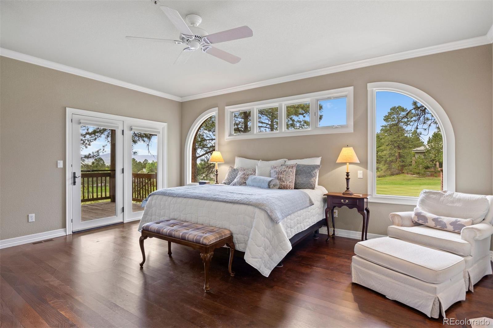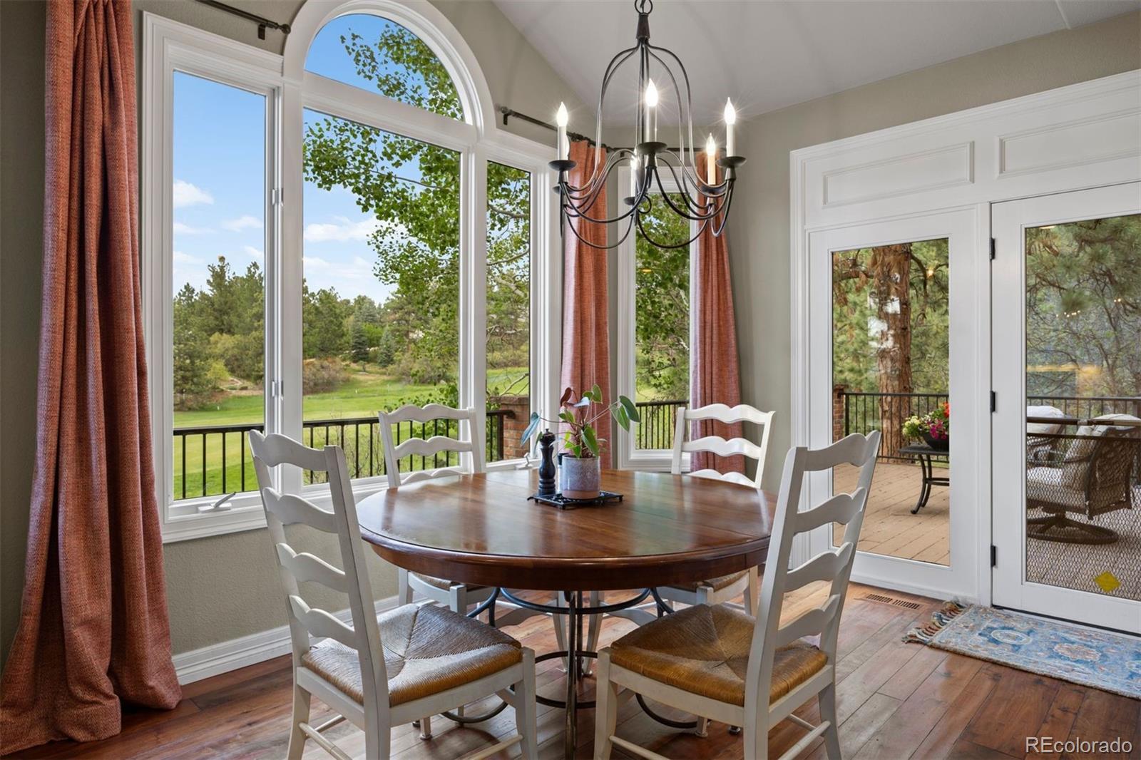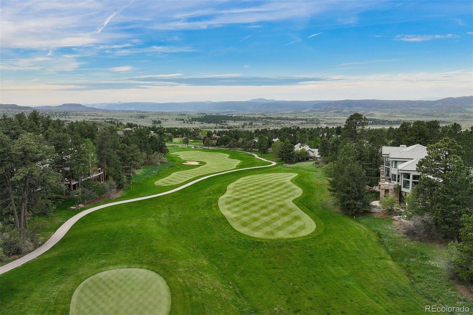 Nestled on one of the most picturesque cul-de-sacs in Castle Pines Village, this mountain traditional red-brick home is surrounded by towering Ponderosa pines and offers privacy along with breathtaking views of both the mountains and the 15th fairway of The Country Club at Castle Pines, a Jack Nicklaus–designed golf course. Thoughtfully designed with four en-suite bedrooms, each uniquely separated to ensure privacy, the home blends comfort and functionality. Recent improvements include TWO COMPLETELY NEW COMPOSITE DECKS from the great room and kitchen and primary suite. With hand troweled hardwood throughout, the spacious great room features expansive windows that flood the space with natural light ideal for entertaining or to enjoy the golf course and mountain views. The MAIN LEVEL PRIMARY SUITE offers a private retreat with a new covered southwest-facing deck, perfect for catching sunsets. The suite includes a generous PRIMARY BATH, FULLY RENOVATED with luxury in mind, elegant and serene. A bright, airy kitchen showcases alder cabinetry, a cozy breakfast nook, built-in desk, and a center island—positioned to take full advantage of the spectacular views. Additional features include a formal dining room, butler’s pantry, and handsome study with custom alder built-ins. The upstairs level features two generous bedrooms with ensuite baths. The open-concept lower level boasts high ceilings, a walkout design, and a spacious rec room—perfect for gatherings or movie nights. A fourth bedroom with newer bath is a quiet and private retreat for guests. There's also ample unfinished space ready for your creative vision. NEW CONCRETE DRIVEWAY AND GARAGE FLOOR further enhance the property’s appeal. Located in a secure, gated community, this home is minutes from the Denver Tech Center and Park Meadows Mall. Enjoy access to pools, tennis and pickleball courts, walking trails, and more. There are two private Jack Nicholas golf courses in this very special neighborhood.