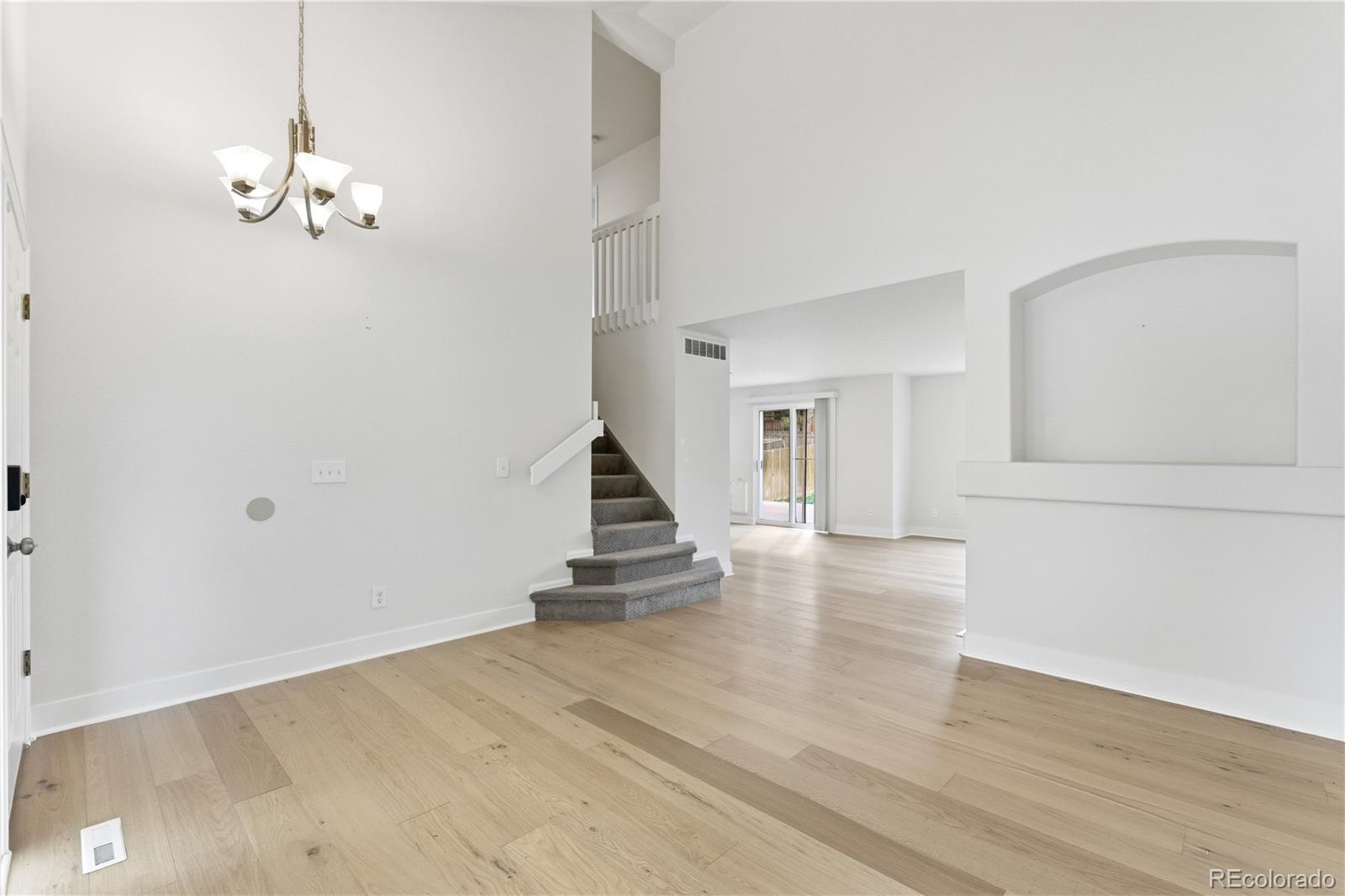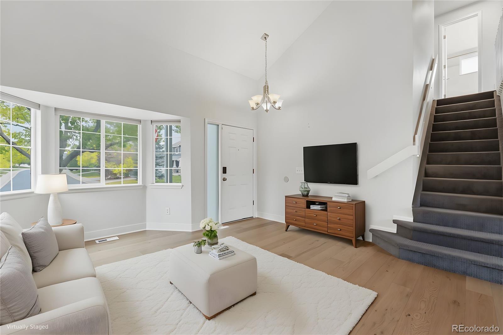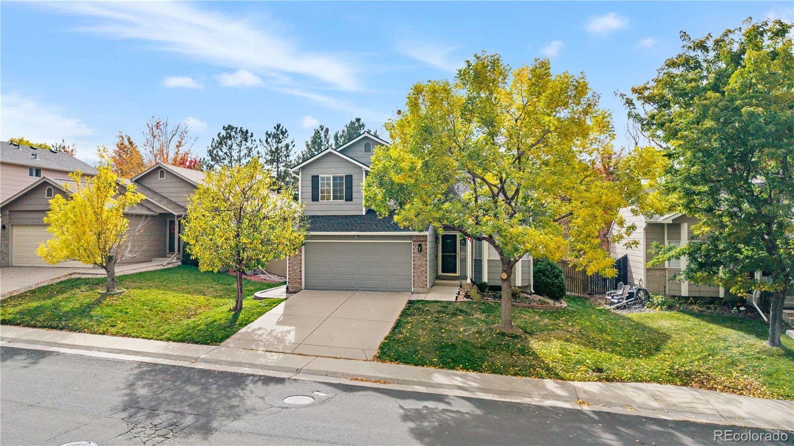 Welcome to this beautifully updated two-story home in the desirable Saddle Rock Ridge community. Bright and open with vaulted ceilings and modern finishes, this home offers the perfect blend of comfort and functionality. The main level features LVP flooring throughout, creating a seamless flow from the spacious living area into the inviting family room, where a cozy fireplace adds warmth and charm. The dining area connects the family room and kitchen, with sliding doors leading out to the private backyard and patio - ideal for entertaining or relaxing outdoors. The kitchen is designed for both everyday living and hosting, featuring sleek quartz countertops, stainless steel appliances, and a generous island for meal prep or casual dining. A convenient powder room and laundry room complete the main floor. Upstairs, the primary suite offers a bright and spacious layout with an en suite five-piece bathroom that includes a soaking tub, separate shower, dual sinks, and quartz countertops. A large walk-in closet provides ample storage and completes the space. Three additional bedrooms and another full bathroom provide plenty of space for family, guests, or a home office. The finished basement offers a spacious bonus room - perfect for a family/media space, gym, play area, or home office. The private backyard features a spacious deck, perfect for outdoor dining or weekend gatherings. Surrounded by mature landscaping, it offers a comfortable space to relax and unwind. Conveniently located near parks, trails, shopping, and dining—with access to top-rated Cherry Creek schools - this home combines modern comfort with an ideal neighborhood setting. **2025 appliances, interior and exterior paint, roof, furnace**