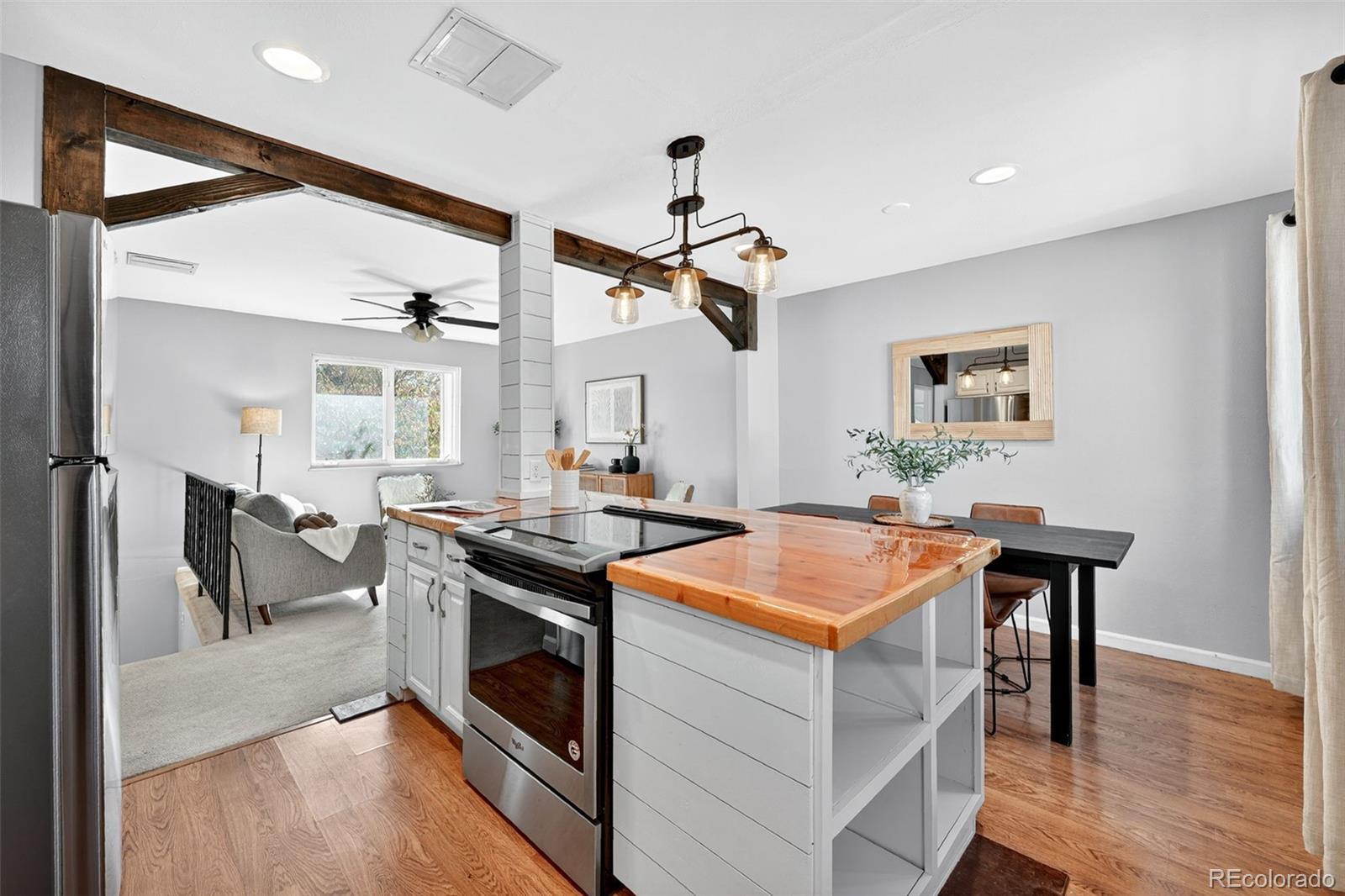 Butcher Counters, Ceiling Fan(s), Eat-in Kitchen, Kitchen Island, Open Floorplan