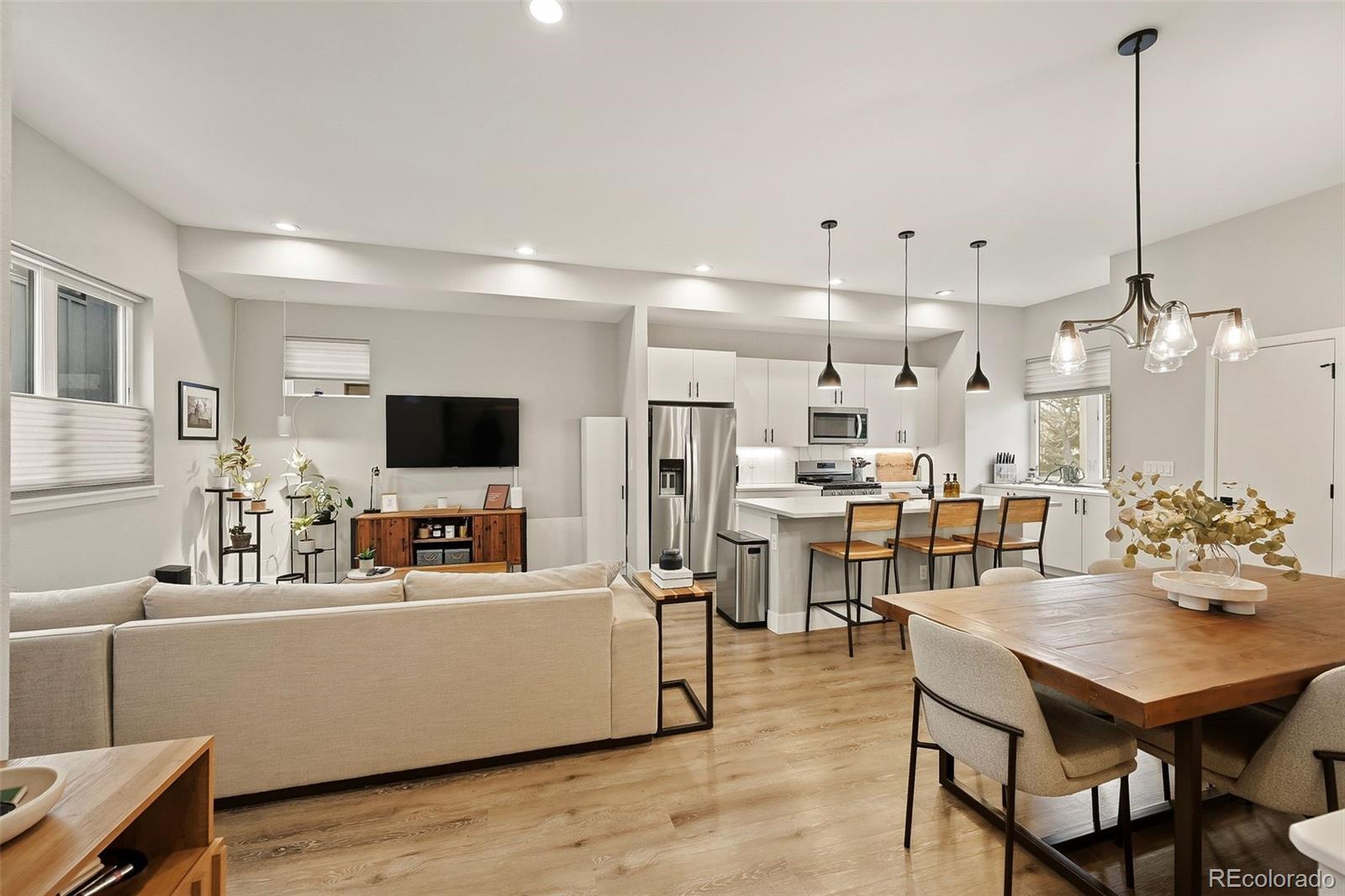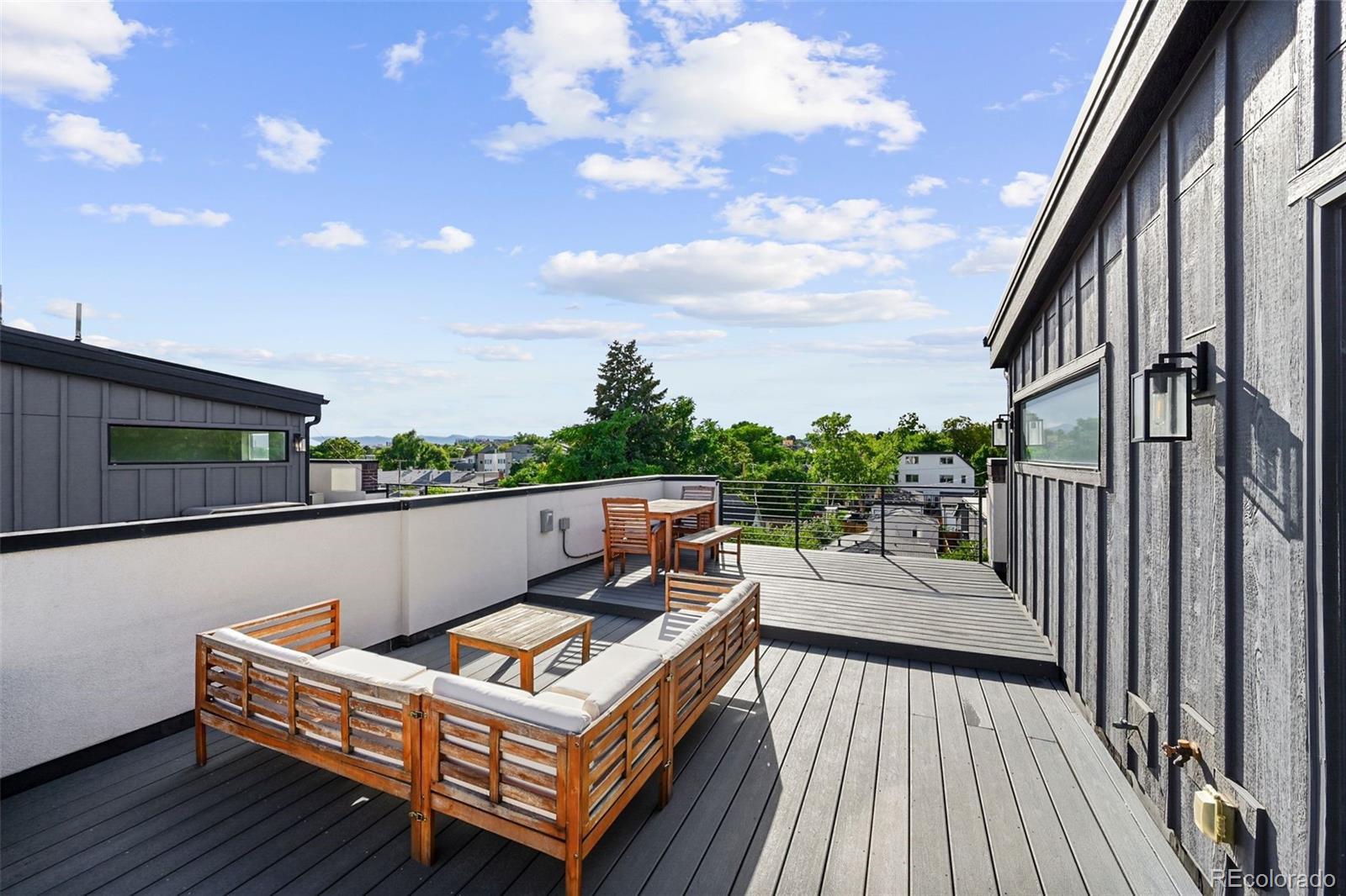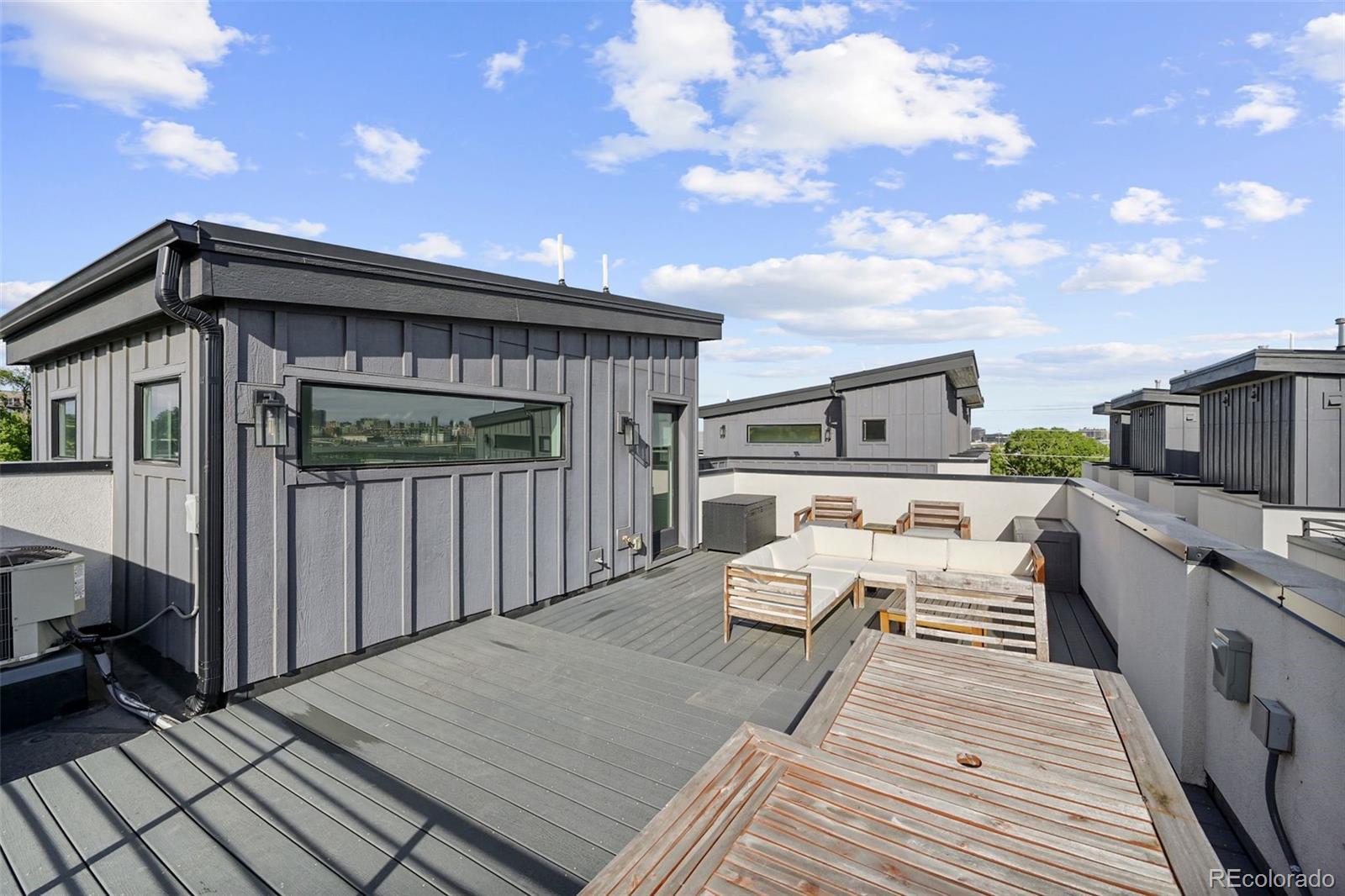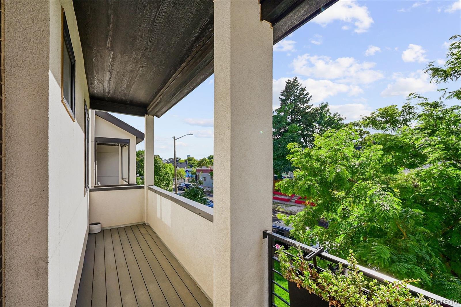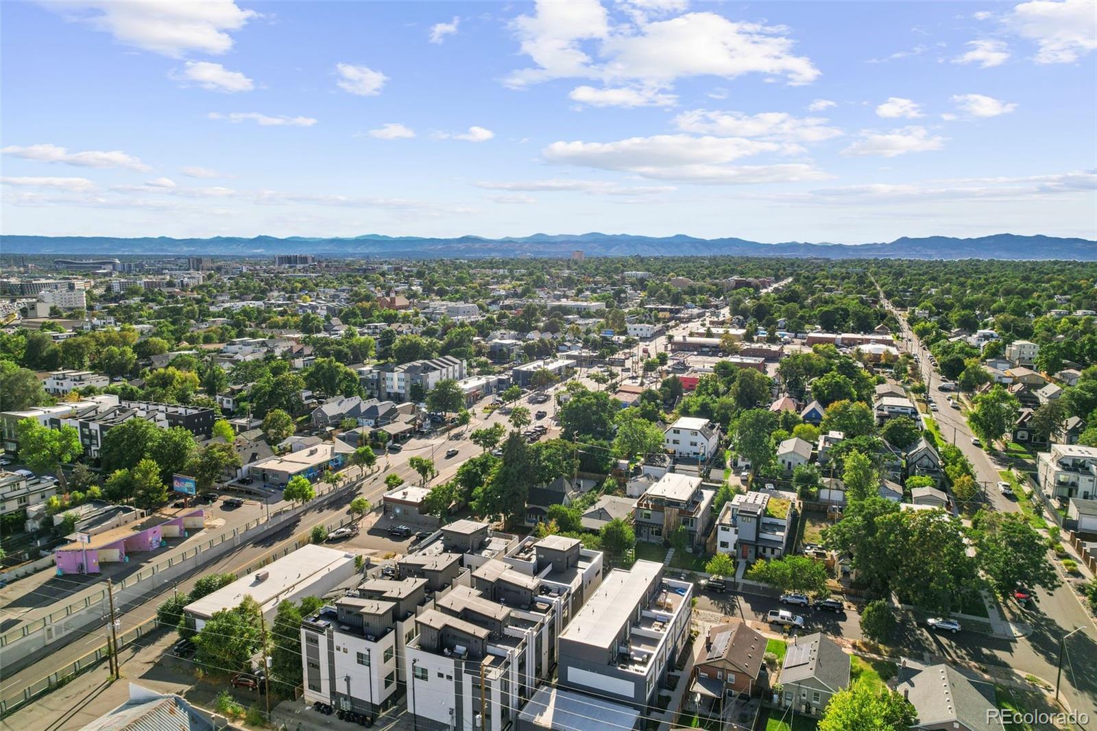Modern design. Effortless living. Unforgettable views. // Built in 2022, this striking 2-bedroom, 4-bath townhome offers over 1,400 square feet of thoughtfully designed space in the heart of Sunnyside, adjacent to the Highlands. As an end unit, natural light pours through expansive windows, highlighting the clean architectural lines and contemporary finishes throughout. // The main level opens into a dramatic great room with soaring 11' ceilings and an airy, open layout that feels both spacious and intimate. The kitchen is sleek and timeless—featuring quartz countertops, soft-closing shaker cabinetry and stainless steel appliances. A generous island seamlessly connects kitchen and living spaces, making it perfect for weeknight dinners or hosting friends. The ample-sized dining room (often an afterthought in townhomes) can be extended to the 2nd fl covered patio. // Upstairs, the primary suite offers a calm retreat with a modern en-suite bath and refined finishes. This same floor includes the secondary bedroom with ensuite bath—ideal for guests or a home office, and in the large hallway the laundry room. // Crowning the home is an expansive third-floor rooftop deck with panoramic 360-degree views of the mountains and downtown Denver—an extraordinary extension of your living space. Whether enjoying morning coffee with mountain views or evening sunsets over the skyline, this rooftop is truly the highlight. // Laminate and tile flooring, modern lighting, hand-troweled walls and a straight-in two-car garage with storage add comfort and efficiency to everyday life. Low-maintenance, new construction in one of Denver’s most vibrant neighborhoods—just steps to local coffee shops, parks, restaurants, and easy access to downtown, I-70, and I-25—this home offers the perfect blend of style, simplicity, and location.