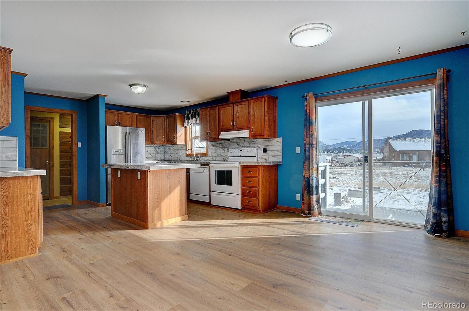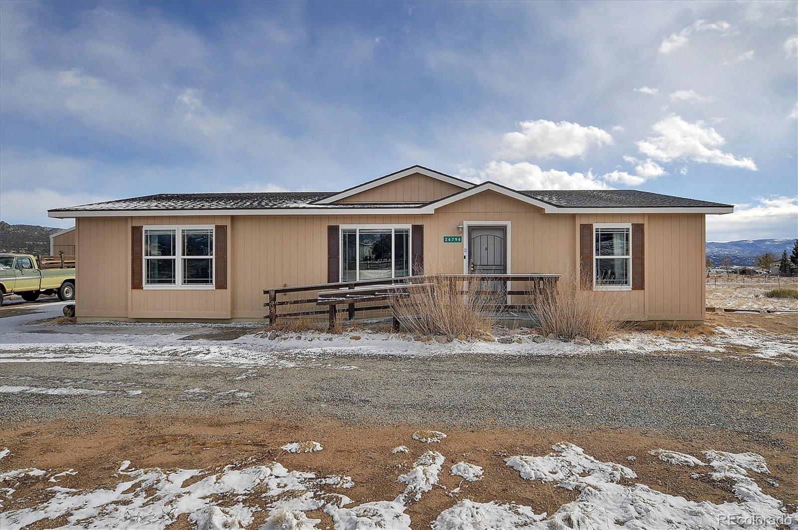 Surrounded by magnificent mountain views in every direction, this well-cared-for 3-bedroom, 2-bath manufactured home offers comfort and space on a beautiful level one-acre site. This 1581 SF home combines easy living with practical design and the serene setting of rural Colorado. Step inside to an inviting open floor plan, with new LVT flooring, filled with natural light and mountain vistas. The spacious living room flows seamlessly into a large, well-equipped kitchen with new tile counter tops and backsplash, complete with an expansive center island, pantry, and generous counter space—perfect for both everyday living and entertaining. The adjoining dining area easily accommodates a full-sized table and opens through sliding glass doors to a back patio, ideal for outdoor meals, morning coffee, or simply taking in the unobstructed mountain scenery. The comfortable primary suite offers plenty of room to unwind, featuring a bright bath with a walk-in tub, newly tiled shower, and vanity, and the convenience of in-suite laundry facilities. Two additional bedrooms and a recently tiled full bath provide excellent flexibility for family, guests, a home office, or craft room. Outdoors, the property is equally impressive with an oversized 40’ x 24’ detached garage providing ample space for vehicles, recreational equipment, or a workshop, along with two additional storage sheds for tools, gear, or gardening tools. The property is served by a private well and septic system, offering independence and low monthly utility costs. Located just outside the Buena Vista town limits with no covenants, this property enjoys a peaceful setting while remaining close to all amenities. County-maintained roads ensure year-round access to downtown shops, dining, and schools, as well as quick access to the highway and endless outdoor adventures. This property offers the perfect blend of convenience, privacy, and panoramic mountain beauty in the heart of the Arkansas River Valley.