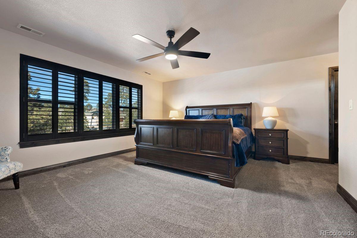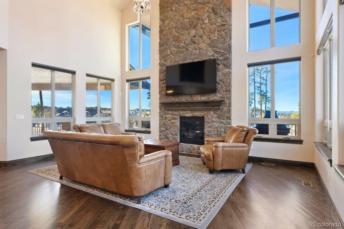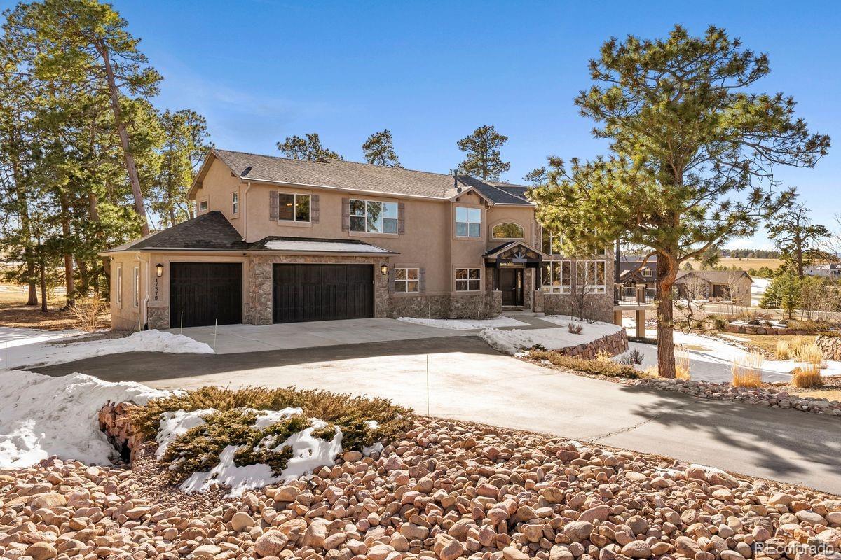 Expansive and stately custom 2-story in the desirable Walden Preserve Community w/ over half an acre with mature towering pines, gorgeous professional landscaping and commanding views of Pikes Peak. Award winning School District 38. Over 4,600 square feet w/ 5 bedrooms, 4 baths and attached finished 3 car garage w/ epoxy floors. Incredible great room w/ 2-story vaulted ceilings, two walls of windows pouring natural light into the living space and showcase scenic views, gas fireplace w/ stone surround to the ceiling, gorgeous large chandelier and hardwood floors. Stunning kitchen w/ high grade cabinetry, a pantry, granite counters, double oven, stainless appliances, gas cook-top, island w/ seating and open to the great room. Formal dining w/ tray ceiling, crown molding, hardwood floors and space for an 8 person table. Massive covered composite deck with metal railings and tremendous mountain views. The upper floor provides 4 bedrooms. Expansive primary suite w/ walk-in closet featuring a well designed closet system, plantation shutters, 5 piece bath w/ a fireplace, large double vanity for an abundance of storage, granite counters, large soaking tub and over-sized shower. This home is upgraded - central AC, knotty alder solid doors and trim, hardwood floors, high end lighting throughout, Tesla solar system providing low electric bills, high end cabinetry, UV window protection, dramatic wide staircase w/ metal railings and hardwood treads, custom window coverings throughout. Main level laundry w/ sink and tons of cabinetry. Main level office w/ french doors. Finished walk-out lower level w/an additional bedroom, workout room, amazing theater room area w/ seating and surround sound, a wet bar, game area and a walk-out to a lower level stamped concrete patio w/ hot tub. The Walden Community offers miles of trails, open space and ponds. Conveniently located on the north side of El Paso County providing quick access to I-25, Highway 83, Colorado Springs and Denver.