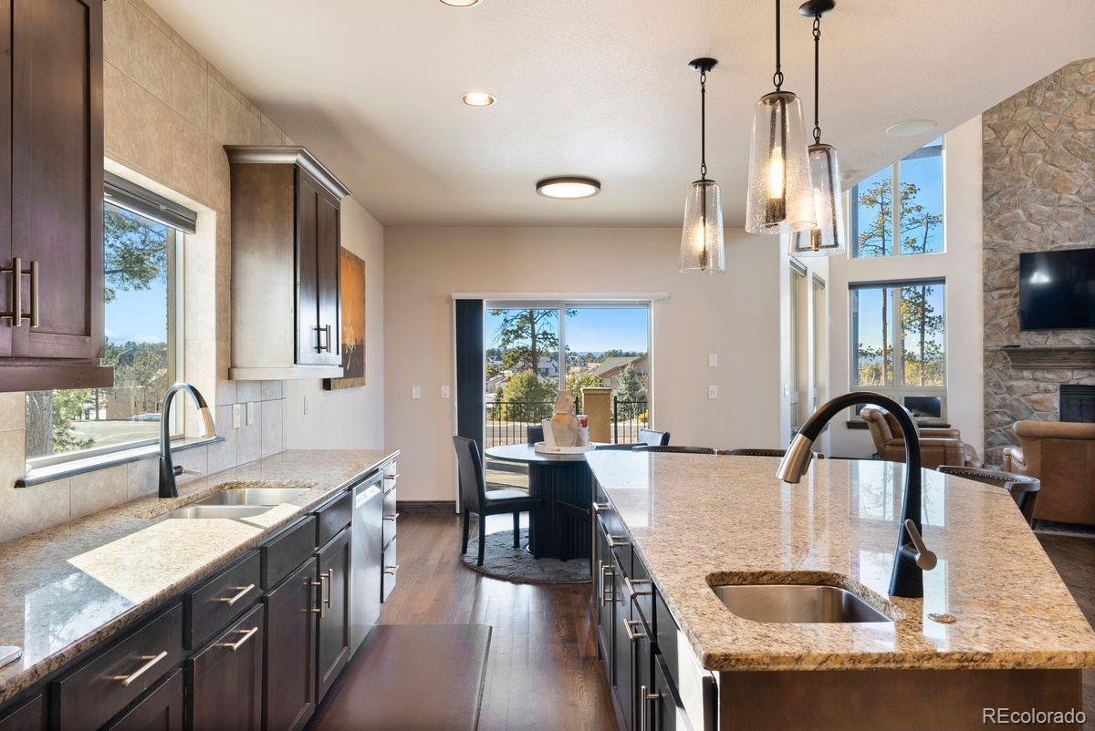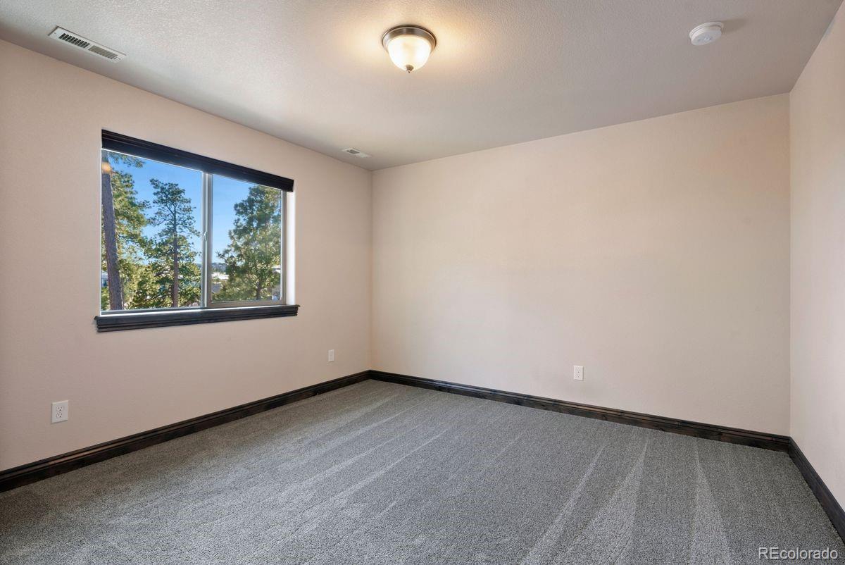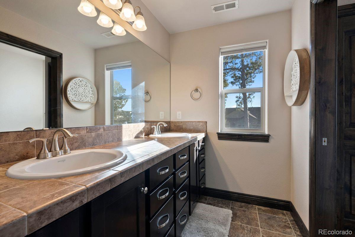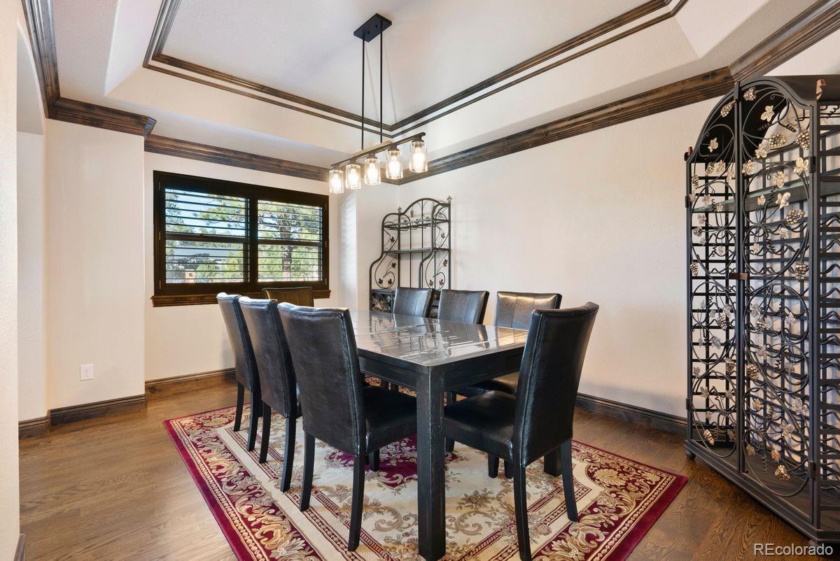 Expansive and stately custom 2-story in the desirable Walden Preserve Community w/ over half an acre with mature towering pines, gorgeous professional landscaping and commanding views of Pikes Peak. Award winning School District 38. Over 4,600 square feet w/ 5 bedrooms, 4 baths and attached finished 3 car garage w/ epoxy floors. Incredible great room w/ 2-story vaulted ceilings, two walls of windows pouring natural light into the living space and showcase scenic views, gas fireplace w/ stone surround to the ceiling, gorgeous large chandelier and hardwood floors. Stunning kitchen w/ high grade cabinetry, a pantry, granite counters, double oven, stainless appliances, gas cook-top, island w/ seating and open to the great room. Formal dining w/ tray ceiling, crown molding, hardwood floors and space for an 8 person table. Massive covered composite deck with metal railings and tremendous mountain views. The upper floor provides 4 bedrooms. Expansive primary suite w/ walk-in closet featuring a well designed closet system, plantation shutters, 5 piece bath w/ a fireplace, large double vanity for an abundance of storage, granite counters, large soaking tub and over-sized shower. This home is upgraded - central AC, knotty alder solid doors and trim, hardwood floors, high end lighting throughout, Tesla solar system providing low electric bills, high end cabinetry, UV window protection, dramatic wide staircase w/ metal railings and hardwood treads, custom window coverings throughout. Main level laundry w/ sink and tons of cabinetry. Main level office w/ french doors. Finished walk-out lower level w/an additional bedroom, workout room, amazing theater room area w/ seating and surround sound, a wet bar, game area and a walk-out to a lower level stamped concrete patio w/ hot tub. The Walden Community offers miles of trails, open space and ponds. Conveniently located on the north side of El Paso County providing quick access to I-25, Highway 83, Colorado Springs and Denver.