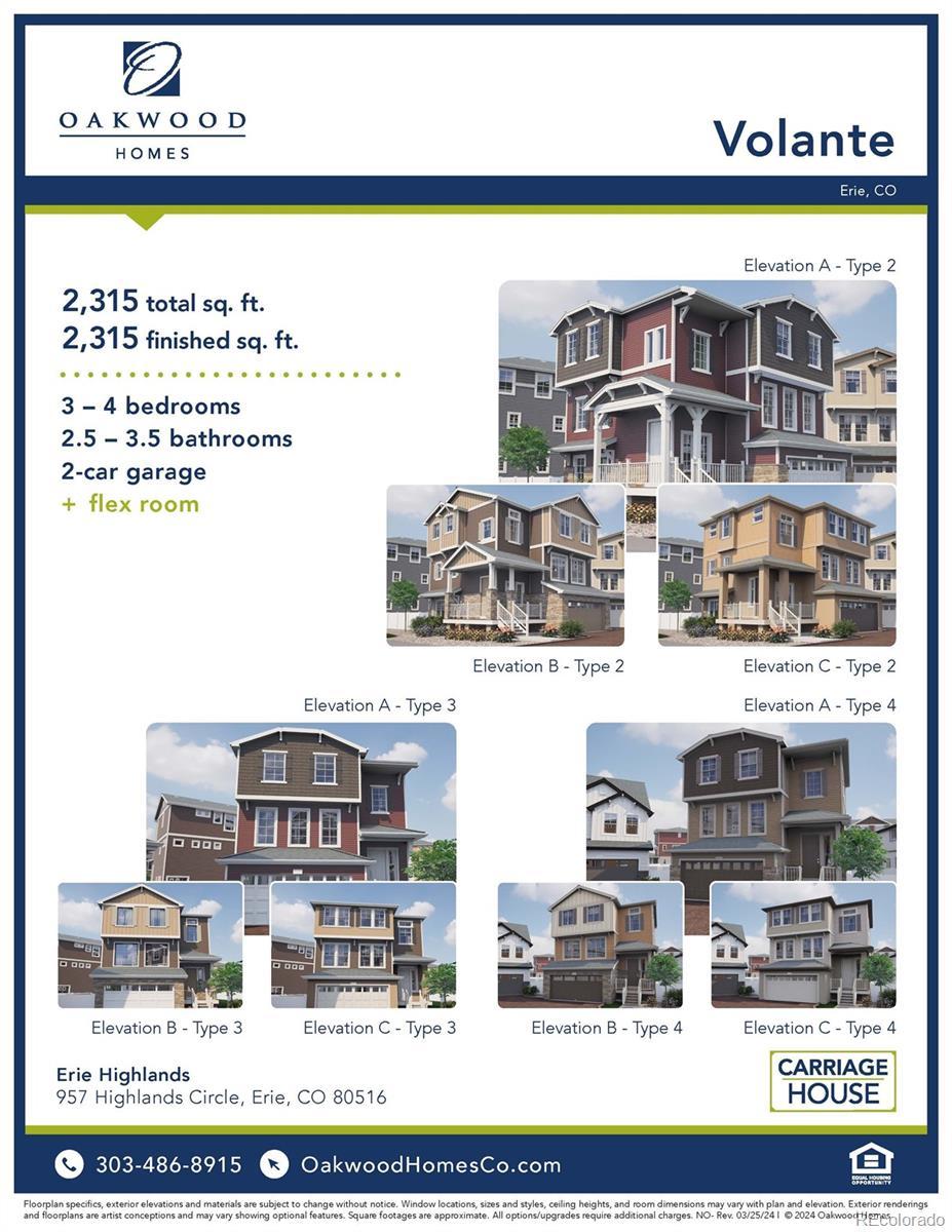 Volante - When entering this home, you immediately say “wow” as it has a new age urban brownstone look and feel. This low maintenance three story home features 2315 sq. ft. of open living space complete with 3 bedrooms and 2.5 bathrooms and options for a fourth bedroom and third full bath. This home has 9-foot ceilings throughout main level with trey ceilings in great room. Modern, contemporary architectural detail makes this home unique. Includes spa shower, double vanity, and California walk-in closet in primary suite, large eat-in island, dining area, popular upstairs laundry room, large windows that provide an abundance of light, balcony off kitchen and great room, professional front-yard landscaping, 6-foot privacy fence, and snow removal. Homes are built in cul-de-sacs with paver driveways.