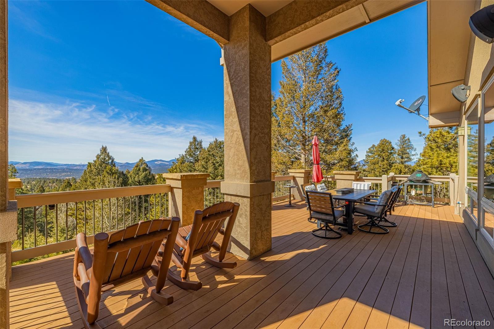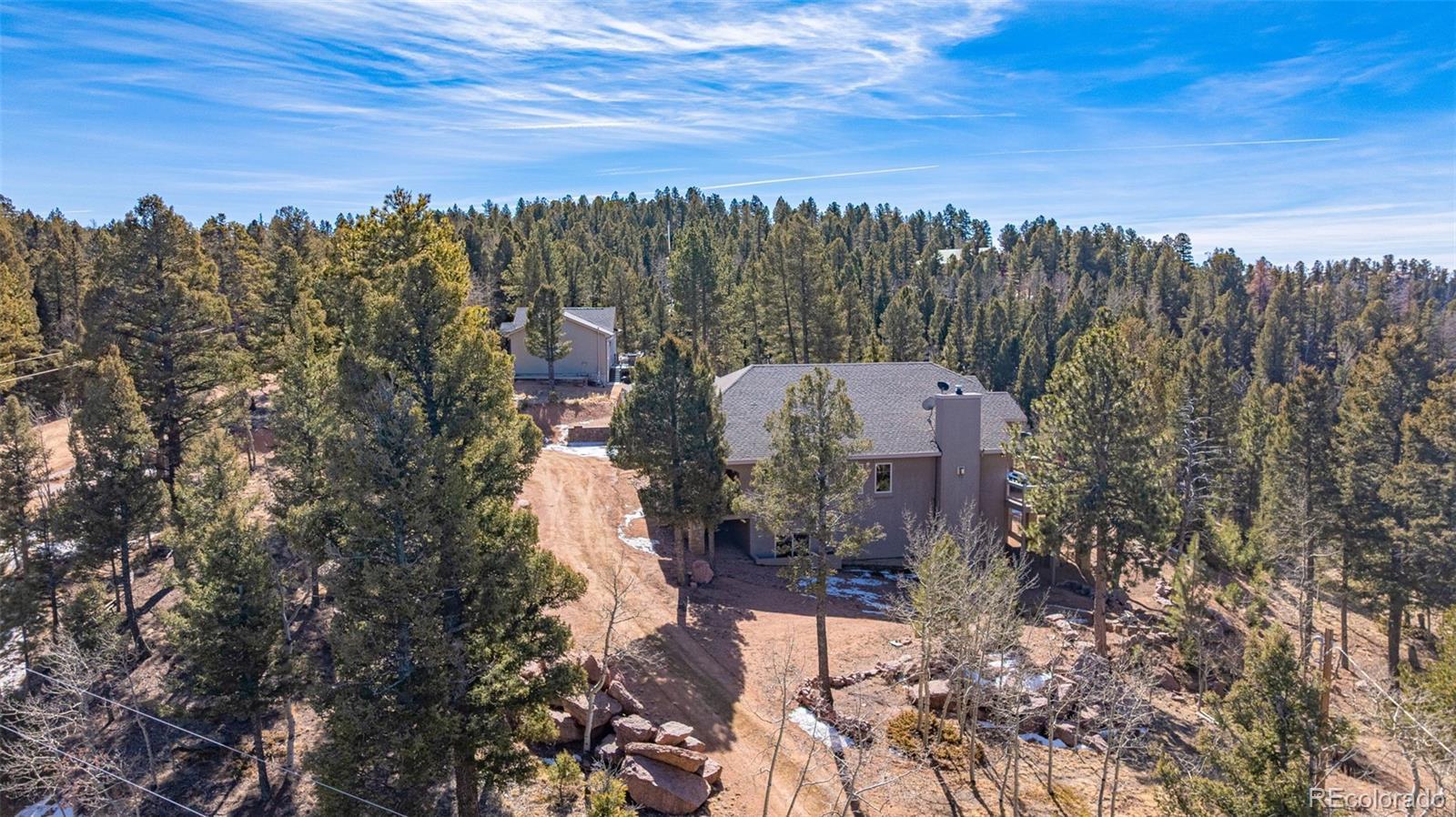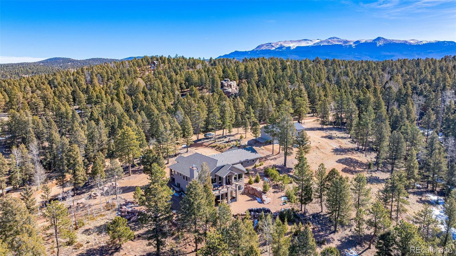 Experience refined mountain living in this stunning custom-built home, where craftsmanship and quality shine throughout. Perfectly positioned to capture sweeping views of the Sangre de Cristo Mountains, this property offers true main-level living on 3.08 acres. From the moment you step through the front door, your eyes are drawn straight through the open floor plan to the breathtaking views beyond the expansive composite deck. The main level features rich hardwood floors, a tongue-and-groove ceiling, and custom log railing details that blend elegance with mountain character. The open-concept living, kitchen, and dining areas are ideal for everyday comfort and entertaining alike. The living room showcases a dramatic floor-to-ceiling rock gas fireplace, while the kitchen is equipped with new stainless steel appliances including a cooktop and dual wall ovens, plus a generous walk-in pantry. The primary suite is a private retreat, complete with deck access, oversized picture windows that feature new electric shades, and a two-sided fireplace shared with the luxurious en-suite bath. Relax in the large soaking tub with the fire going or enjoy the expansive walk-in shower. A spacious walk-in closet completes the suite. A second bedroom is currently used as a home office with glass French doors and great closet space. Also on the main level: a powder room and an oversized laundry room with utility sink and abundant cabinetry for storage, which walks out to the 4 car attached garage. The walk-out lower level offers exceptional additional living space, including a large family room with a second gas fireplace and an oversized wet bar perfect for entertaining. Three additional bedrooms are located downstairs, two with attached bathrooms, and all featuring large or walk-in closets. A second laundry/storage room and an enormous utility room provide incredible functionality. This is Colorado mountain living at its finest—privacy, space and views that never get old.