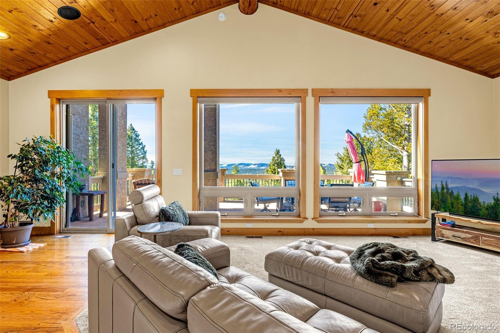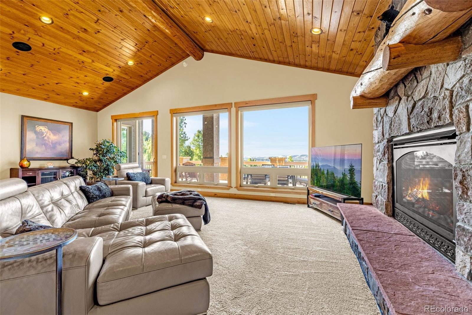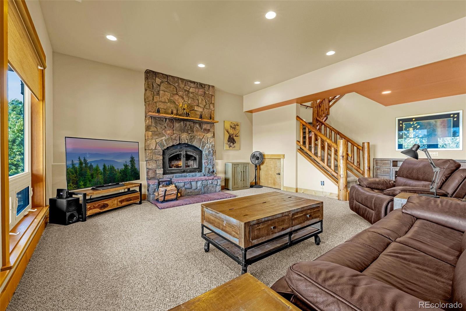 Experience refined mountain living in this stunning custom-built home, where craftsmanship and quality shine throughout. Perfectly positioned to capture sweeping views of the Sangre de Cristo Mountains, this property offers true main-level living on 3.08 acres. From the moment you step through the front door, your eyes are drawn straight through the open floor plan to the breathtaking views beyond the expansive composite deck. The main level features rich hardwood floors, a tongue-and-groove ceiling, and custom log railing details that blend elegance with mountain character. The open-concept living, kitchen, and dining areas are ideal for everyday comfort and entertaining alike. The living room showcases a dramatic floor-to-ceiling rock gas fireplace, while the kitchen is equipped with new stainless steel appliances including a cooktop and dual wall ovens, plus a generous walk-in pantry. The primary suite is a private retreat, complete with deck access, oversized picture windows that feature new electric shades, and a two-sided fireplace shared with the luxurious en-suite bath. Relax in the large soaking tub with the fire going or enjoy the expansive walk-in shower. A spacious walk-in closet completes the suite. A second bedroom is currently used as a home office with glass French doors and great closet space. Also on the main level: a powder room and an oversized laundry room with utility sink and abundant cabinetry for storage, which walks out to the 4 car attached garage. The walk-out lower level offers exceptional additional living space, including a large family room with a second gas fireplace and an oversized wet bar perfect for entertaining. Three additional bedrooms are located downstairs, two with attached bathrooms, and all featuring large or walk-in closets. A second laundry/storage room and an enormous utility room provide incredible functionality. This is Colorado mountain living at its finest—privacy, space and views that never get old.