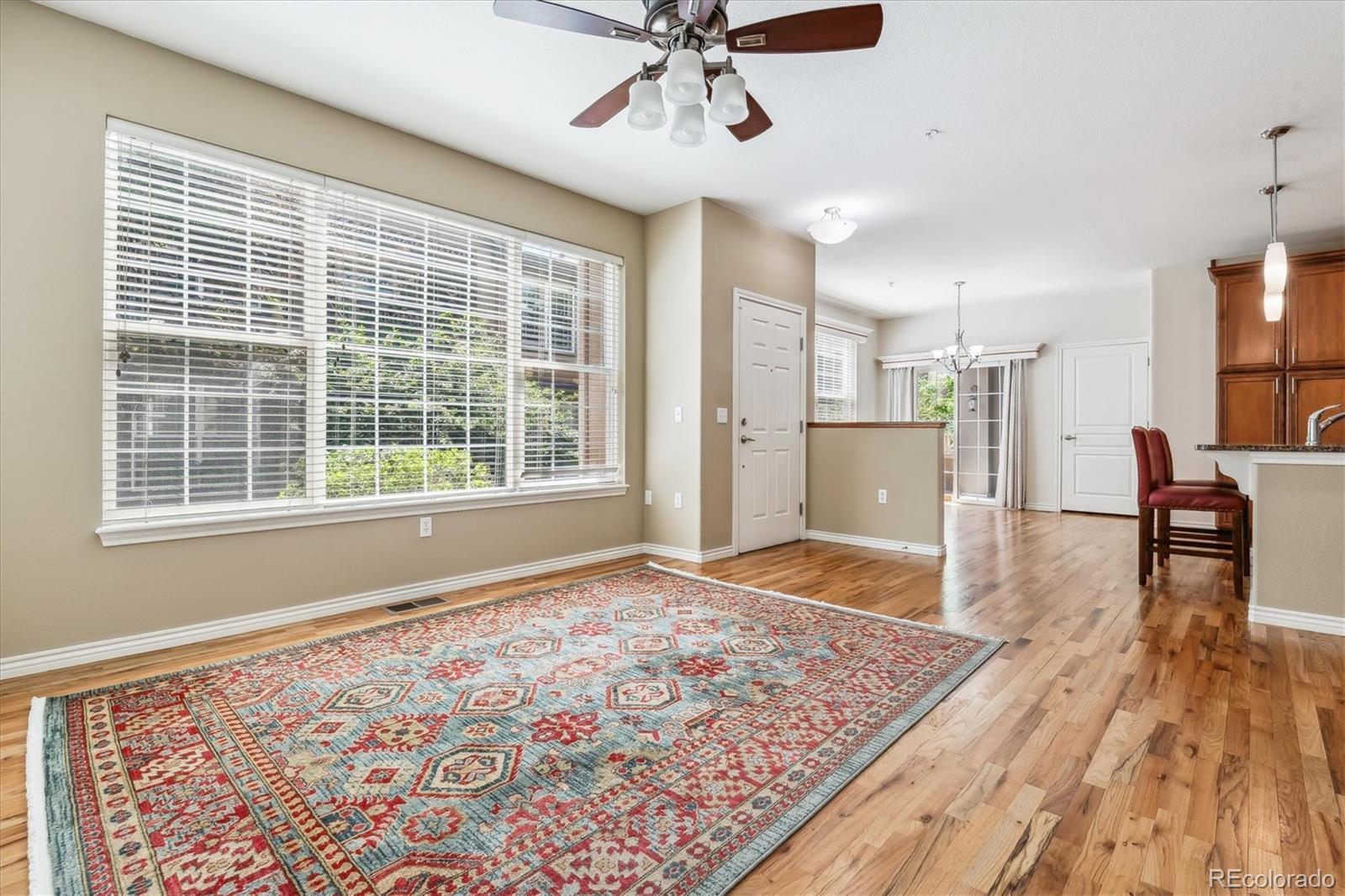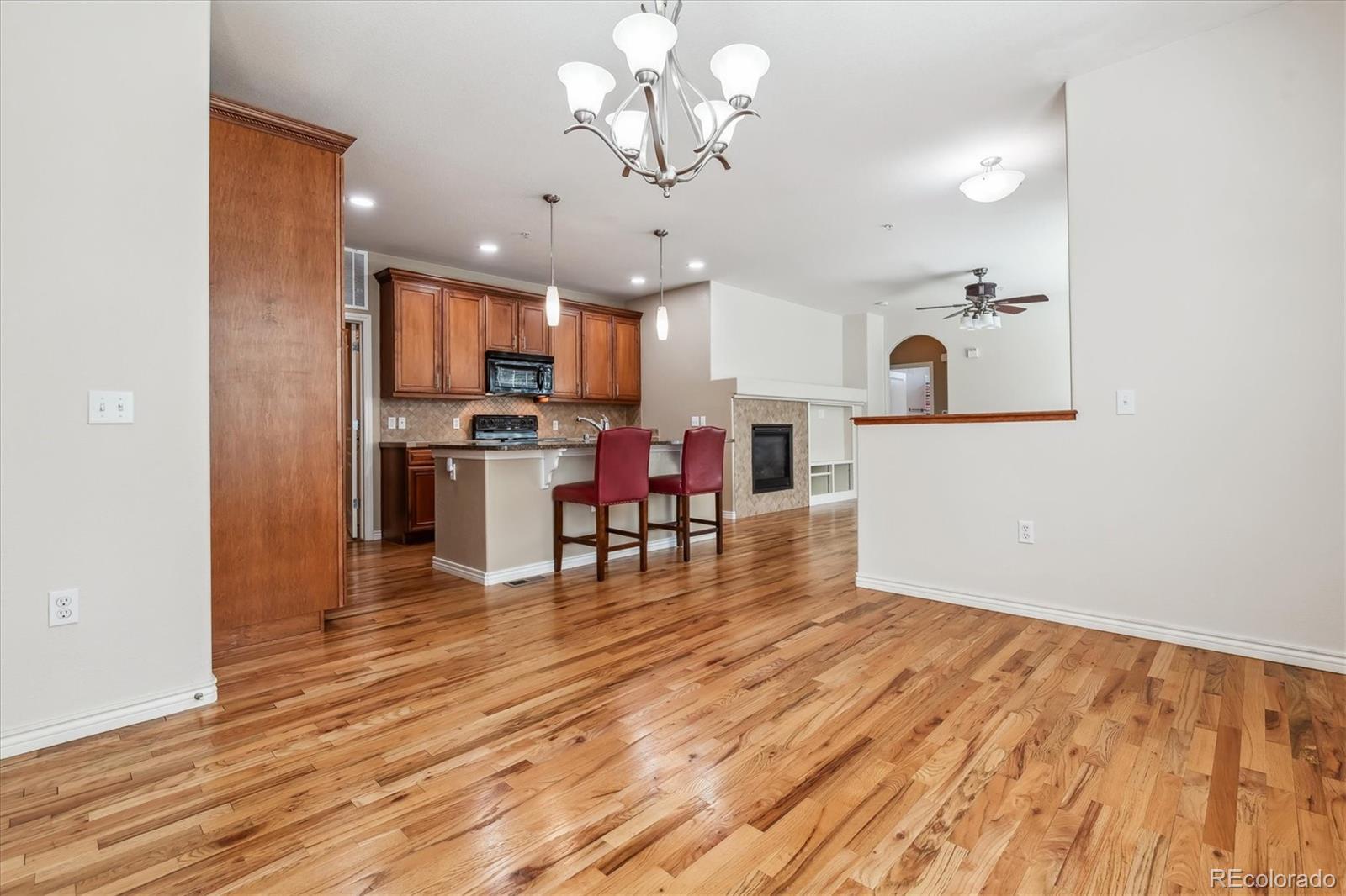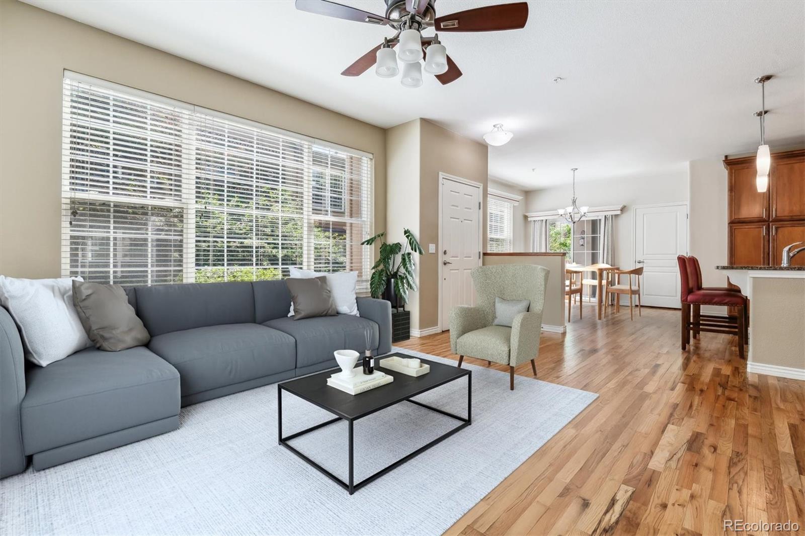 Spectacular turn-key ranch style end unit condo in the highly desirable Dancing Willows subdivision. All main floor living with one of a kind views of a large open space with native meadow plants and trees. Light and bright with lots of windows. Open floor plan, that is set up perfectly for entertaining. Enter thru the private East facing entrance and into a large living room with beautiful site finished hardwood floors, gas log fireplace with blower and custom tile surround built including built in niches. Just off of the living room is the well appointed eat-in kitchen dining/nook area that overlooks the private covered patio with large storage closet thru a large glass sliding door. Large kitchen with custom wood cabinetry including 42" upper cabinets, eat-in island with slab granite countertop, pantry, appliances including french door refrigerator, and custom tiled backsplash. Conveniently, located mud/laundry room (includes washer and dryer) just off of the private entrance to the South facing one car garage and private driveway. Updated main full bathroom. Large guest room with open space views. Primary bedroom with meadow views and large 5 piece primary bathroom with soaking tubc, custom glass shower enclosure, dual vanities, tiled floors, tub and shower surrround. Large walk in closet with custom built ins. Fresh interior paint, new carpet (in bedrooms). Updated plumbing, hardware and lighting (including ceiling fans and LED can lights), window blinds and treatments. Affordable HOA dues that cover most services and include community pool, spa/hot tub, playgound, trails, community pond plus much more. Close to evrything including, restaurants, shopping (SouthWest Plaza), parks, trails, schools, major highways (C-470 I-70, HWY 285) and throughfares plus much more!