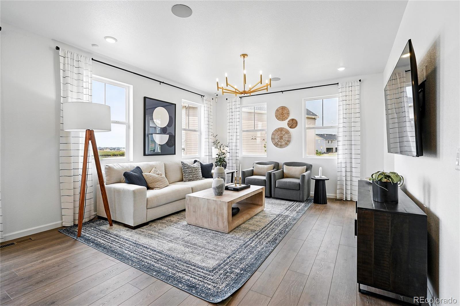 What's Special: Close to Park | 2nd Floor Laundry Room | Understairs Storage | Model Plan | East Facing Lot. New Construction - February Completion! Built by America's Most Trusted Home Builder. Welcome to the Aurora at 321 N Bently Street in Sky Ranch. This inviting floor plan brings together the kitchen, dining, and great room in a bright, open space perfect for everyday living and entertaining. The kitchen features a large island with plenty of room for prep and conversation. Upstairs, you’ll find a private primary suite, convenient laundry, and three bedrooms with generous closets plus a full bath with a separate water closet for added ease. Sky Ranch is an award-winning community offering a neighborhood park, scenic trails, and quick access to E-470, DIA, and downtown Denver. You’ll also enjoy being close to Southlands Mall and endless outdoor recreation with parks, open space, and golf courses just miles away. Additional highlights include: whole house blinds, gas range, additional sink at secondary bath. Photos are for representative purposes only. MLS#6699625