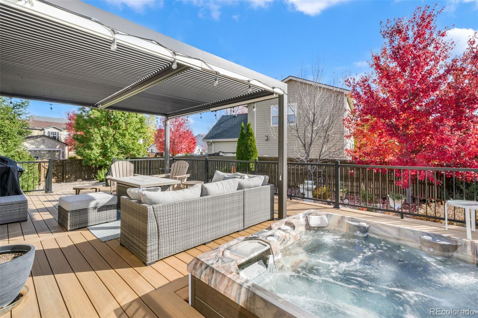 Welcome to this extraordinary residence in High Meadows at Springs Ranch located within District 49 schools, VA Assumable loan! As you enter the impressive two-story foyer, a sweeping staircase and open design set the stage for the elegance that flows throughout this remarkable home. The main level offers a private office, formal living and dining rooms and a spacious family room enhanced by a fireplace and custom built-ins. The expansive kitchen is designed for both entertaining and everyday living, featuring a generous island, abundant custom cabinetry, a decorative backsplash, a dedicated coffee bar, bar seating and a bright eat-in area that opens to the outdoor patio. A convenient laundry room with a window and sink completes the main floor. Upstairs, the luxurious primary suite is a peaceful retreat with a comfortable sitting area showcasing Pikes Peak views. The fully renovated primary bathroom provides a spa-like experience with a freestanding soaking tub, dual vanities, and a large tiled shower. The adjoining walk-in closet offers exceptional storage with custom cabinetry. The second bedroom enjoys its own private en suite bath, while bedrooms three and four share a Jack-and-Jill full bath with dual vanities for convenience and style. The finished lower level is an entertainer’s dream, offering a second family room, wet bar and a private home theater with tiered seating. A guest bedroom and spa inspired bath featuring a steam shower and sauna complete this level, providing the ultimate space for relaxation and hosting. Step outside to a stunning outdoor oasis designed for both beauty and leisure. The expansive 30 by 25 patio is accented with a charming pergola, a saltwater hot tub, and surrounded by lush, mature landscaping. Additional highlights include a 3 car garage, central a/c, greenhouse, storage shed and elegant custom plantation shutters throughout the main and upper levels. Every detail of this home reflects luxury, comfort, and craftsmanship.