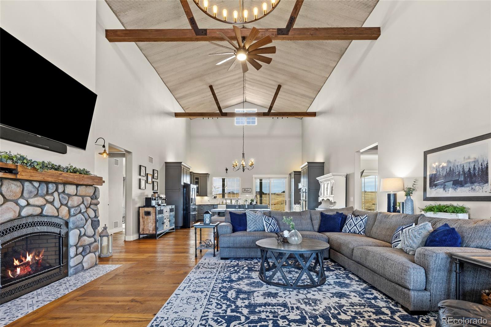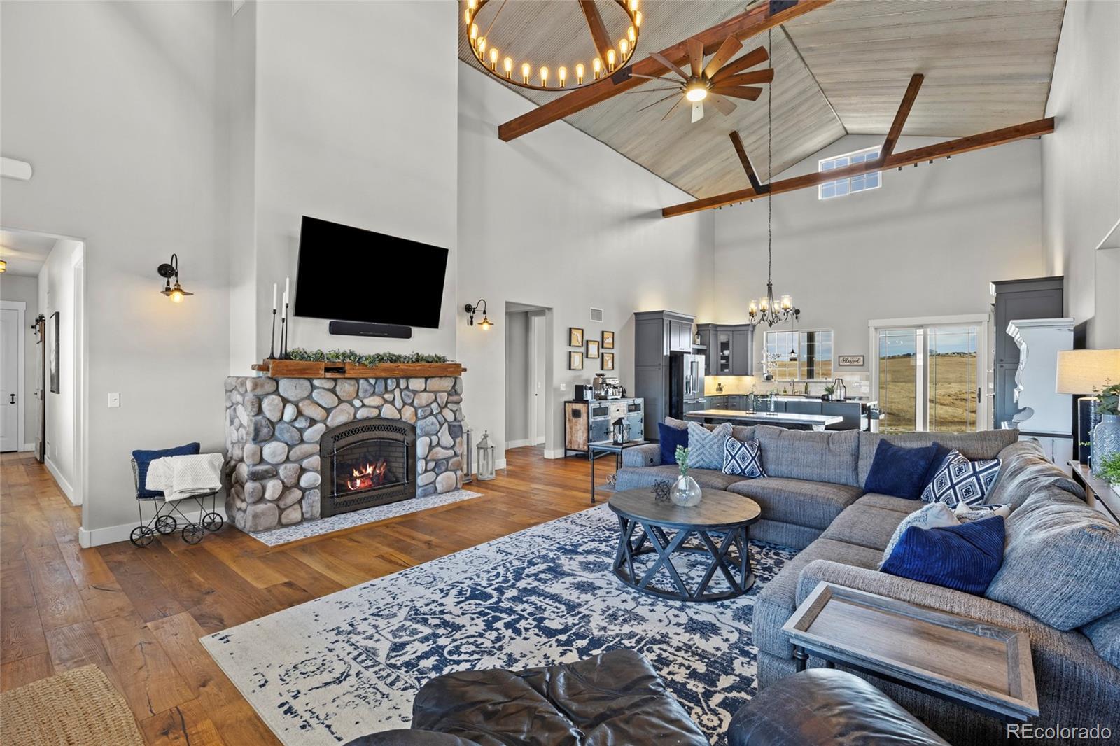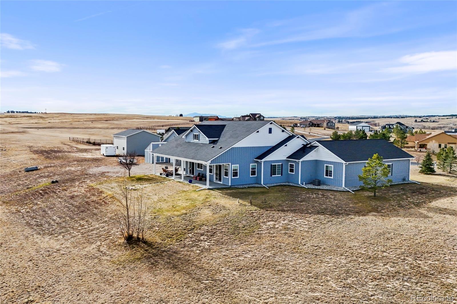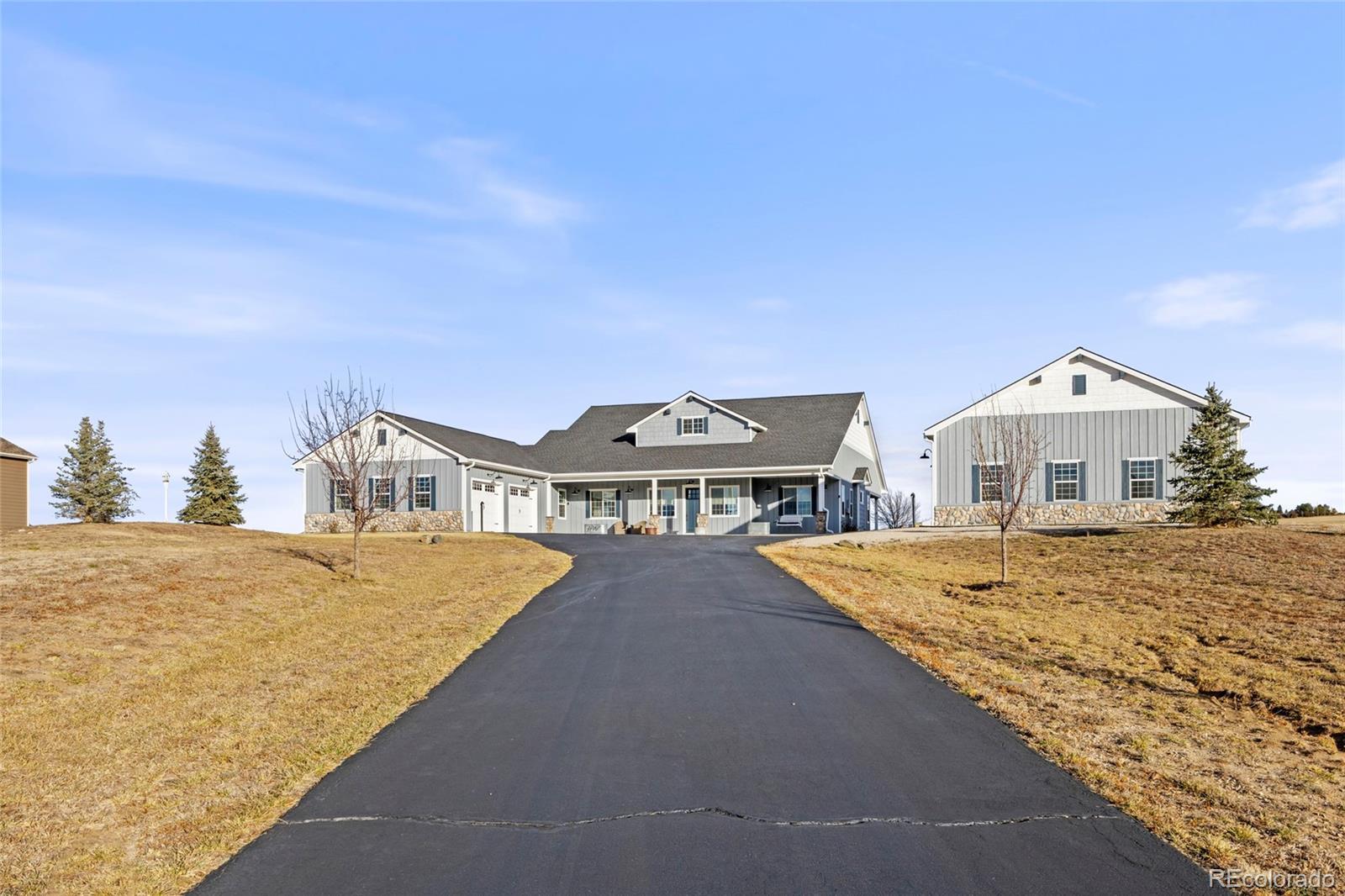 Meticulously maintained, this stunning ranch-style home sits on 2.86 acres backing to open space in the highly sought-after Spring Valley Ranch golf course community. Designed for effortless one-level living with no stairs, the property offers exceptional privacy, thoughtful functionality, and breathtaking mountain views. Set deep within the lot for enhanced privacy, the home welcomes you with an expansive front porch and charming porch swing—perfect for enjoying panoramic views. Inside, vaulted ceilings, wide-plank hardwood floors, exposed wood beams, and a striking river rock fireplace create a warm and inviting atmosphere. The chef’s kitchen is thoughtfully designed with stainless steel appliances, a gas cooktop with pot filler, double ovens, quartz countertops, custom cabinetry with pullouts, an automated mixer lift, and a movable island with a wood top—ideal for both everyday living and entertaining. The primary suite opens to a covered back porch and features a spa-like ensuite bath with a copper clawfoot tub, dual-head shower, dual-sided closets, and direct access to the laundry room. Two additional bedrooms share a Jack-and-Jill bath, while a fourth non-conforming bedroom (no closet) offers flexibility as a guest room or private office, complemented by a beautifully updated ¾ bath down the hall. A truly standout feature is the expansive 2,296 sq ft fully finished shop located just steps from the home. Complete with a living/office area, ¾ bath, heat, full insulation, epoxy floors, custom cabinetry, utility sink, and an oversized RV door, this versatile space is ideal for hobbies, car enthusiasts, entertaining, or a home-based business. A large additional storage shed provides even more room for tools and equipment. Additional highlights include a new Class 4 roof and fresh exterior paint on both home and shop, making this exceptional property truly move-in ready for buyers seeking acreage, privacy, and luxury ranch country living.