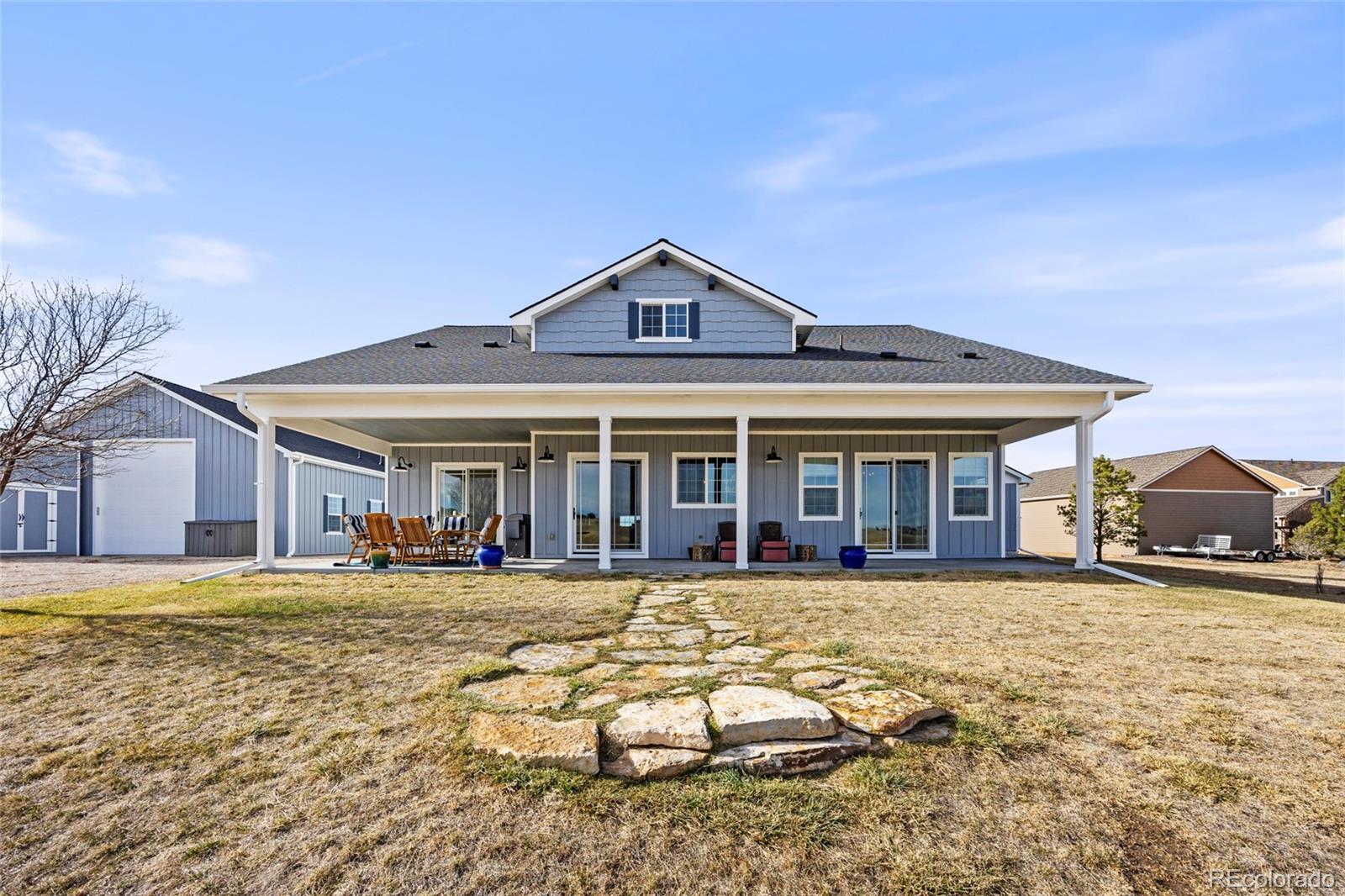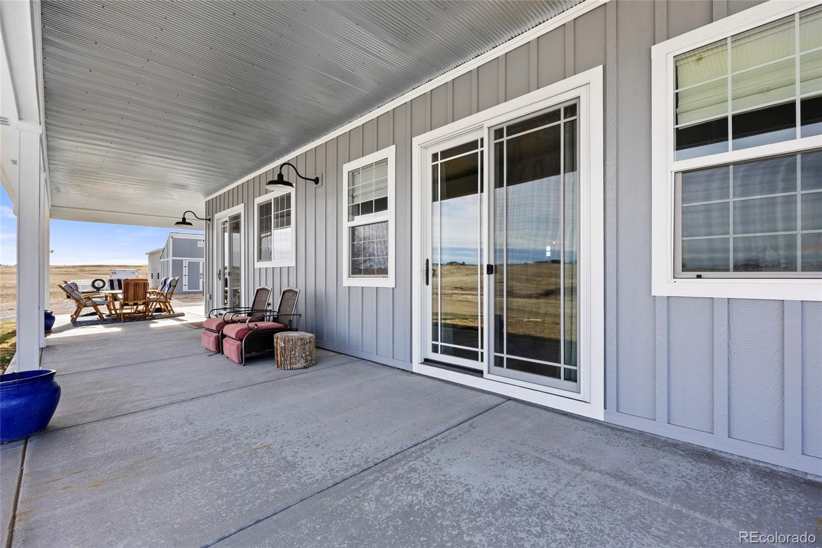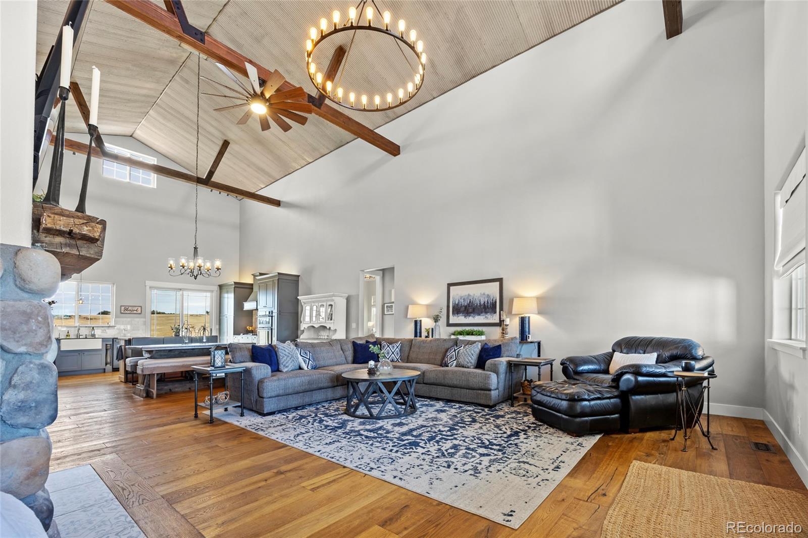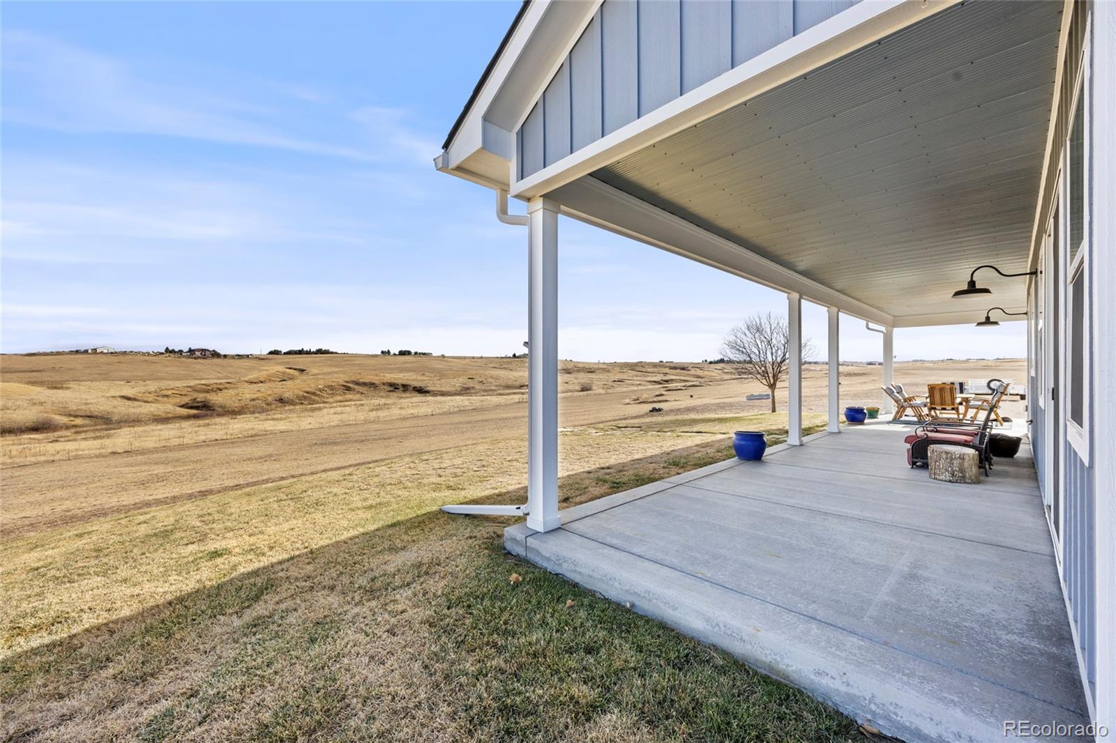 Meticulously maintained, this stunning ranch-style home sits on 2.86 acres backing to open space in the highly sought-after Spring Valley Ranch golf course community. Designed for effortless one-level living with no stairs, the property offers exceptional privacy, thoughtful functionality, and breathtaking mountain views. Set deep within the lot for enhanced privacy, the home welcomes you with an expansive front porch and charming porch swing—perfect for enjoying panoramic views. Inside, vaulted ceilings, wide-plank hardwood floors, exposed wood beams, and a striking river rock fireplace create a warm and inviting atmosphere. The chef’s kitchen is thoughtfully designed with stainless steel appliances, a gas cooktop with pot filler, double ovens, quartz countertops, custom cabinetry with pullouts, an automated mixer lift, and a movable island with a wood top—ideal for both everyday living and entertaining. The primary suite opens to a covered back porch and features a spa-like ensuite bath with a copper clawfoot tub, dual-head shower, dual-sided closets, and direct access to the laundry room. Two additional bedrooms share a Jack-and-Jill bath, while a fourth non-conforming bedroom (no closet) offers flexibility as a guest room or private office, complemented by a beautifully updated ¾ bath down the hall. A truly standout feature is the expansive 2,296 sq ft fully finished shop located just steps from the home. Complete with a living/office area, ¾ bath, heat, full insulation, epoxy floors, custom cabinetry, utility sink, and an oversized RV door, this versatile space is ideal for hobbies, car enthusiasts, entertaining, or a home-based business. A large additional storage shed provides even more room for tools and equipment. Additional highlights include a new Class 4 roof and fresh exterior paint on both home and shop, making this exceptional property truly move-in ready for buyers seeking acreage, privacy, and luxury ranch country living.