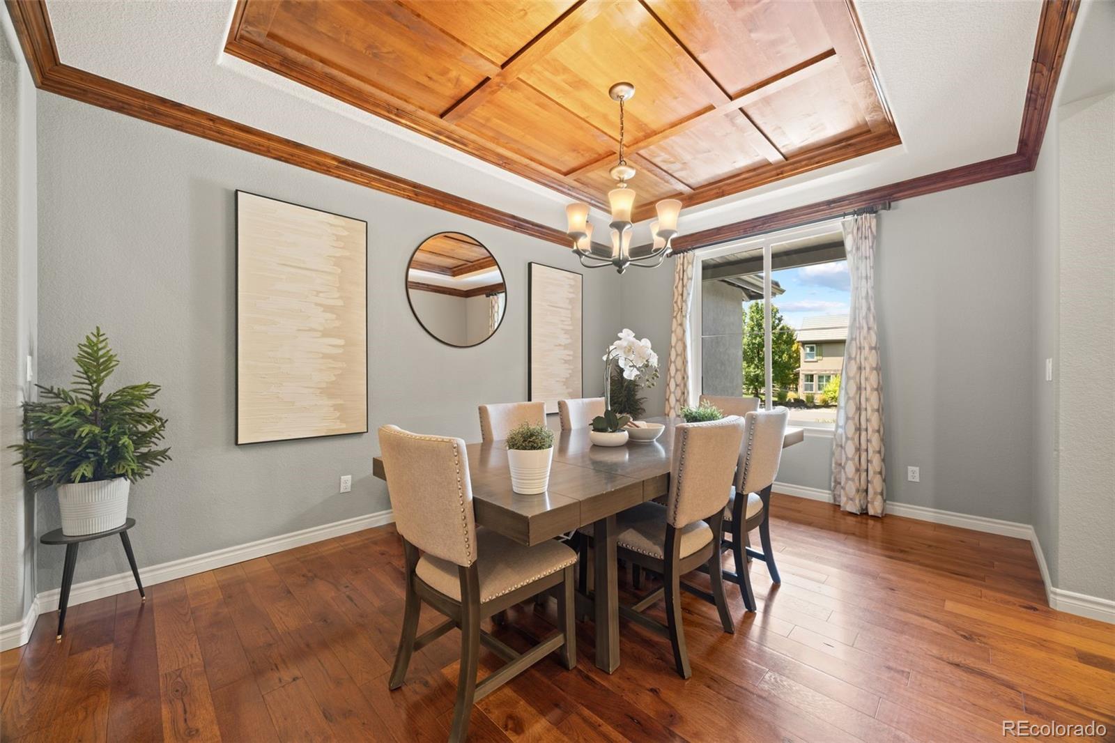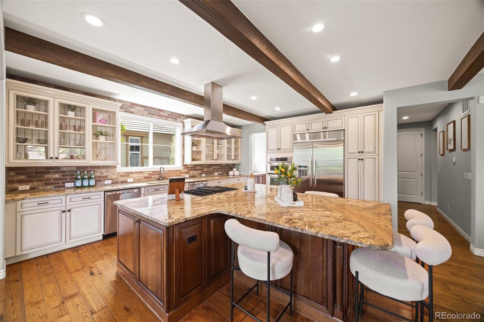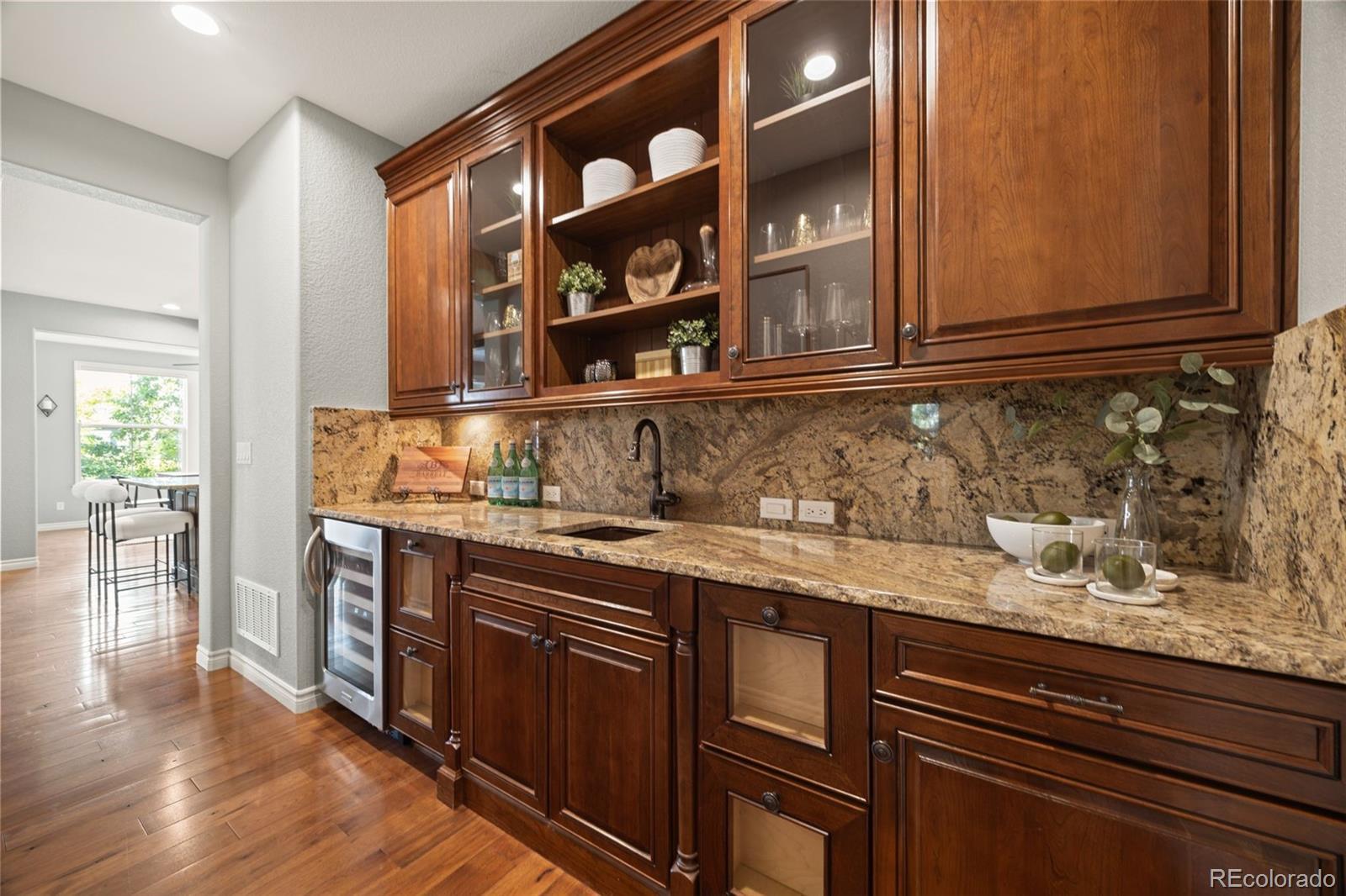 Welcome to this beautifully appointed 5-bedroom, 6-bathroom home nestled in a quiet Highlands Ranch cul-de-sac. Designed with both elegance & functionality in mind, the main level offers a bedroom with en-suite bath & a chef’s kitchen featuring a gas range, warming drawer, double ovens, two dishwashers, a spacious walk-in pantry, extra island storage, & a generous butler’s pantry with appliance closet. The formal dining room is enhanced by a wood-beamed ceiling & a striking two-story brick accent wall, leading upstairs to 4 additional bedrooms. The primary suite boasts dual walk-in closets, a spa-style shower with dual shower heads. Secondary bedrooms include one bedroom with its own en-suite bath & two additional bedrooms sharing a Jack-and-Jill bath & private access to the upper sitting deck with mountain views. The finished basement is perfect for entertaining, complete with a wet bar & a striking double-sided brick fireplace. A tucked-away pocket office adds both convenience and privacy. Throughout the home, plantation shutters, rich wood accents, & premium finishes bring warmth & character. Step outside to enjoy a wraparound patio with a built-in grill, outdoor kitchen, and TV for year-round gatherings. Additional features include dual water heaters, dual-zone heating & cooling, automatic window shades in the main living room and kitchen, a Halo water system, furnace with humidifier, main-level laundry with sink, a three-car garage, newly painted exterior, & custom Jellyfish lighting to create the perfect ambiance in every season. This home seamlessly blends luxury, comfort, & convenience in one perfect package. The Backcountry neighborhood hosts amazing events for residents all year long...the golf cart friendly neighborhood amenities include a clubhouse, Campus Lounge for full service dining, Lost Coffee shop, fitness center, parks and miles of trails for walking, hiking & biking. GOLF CART included in home sale! Live, and love the Backcountry Lifestyle!