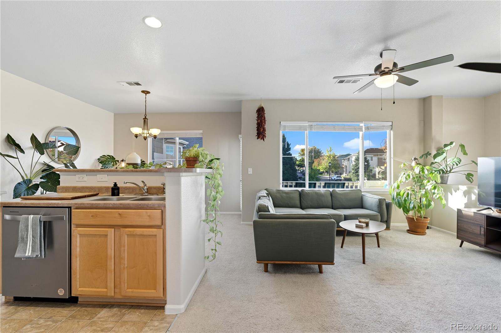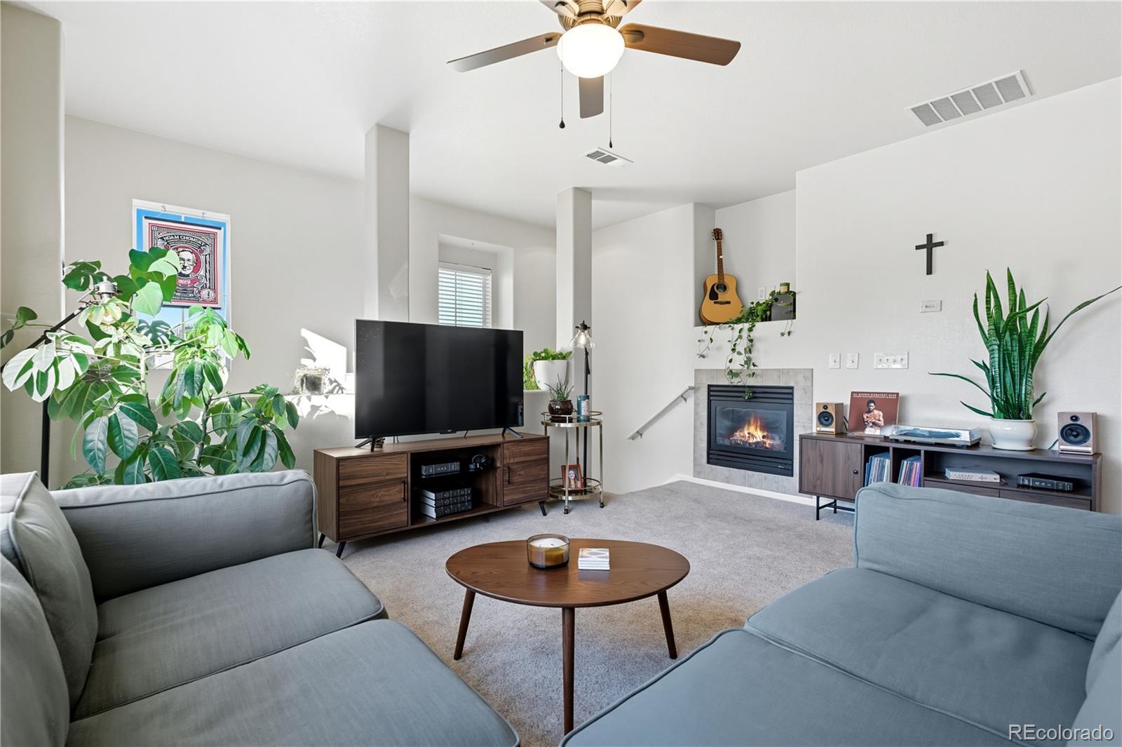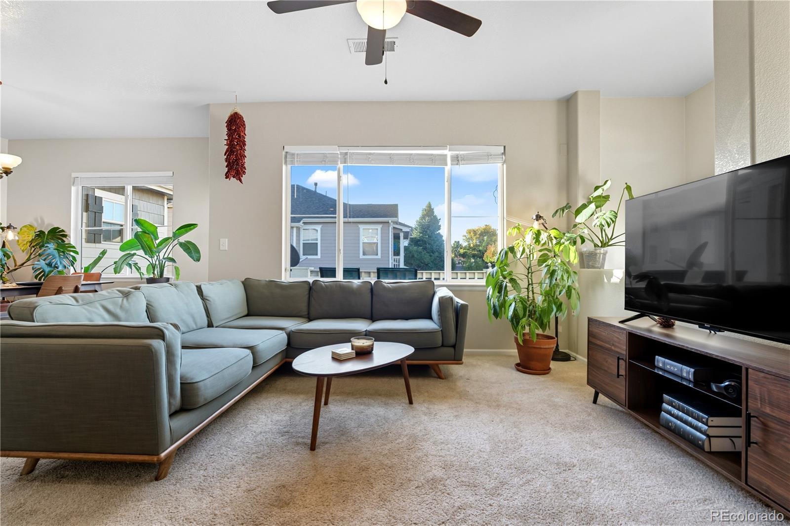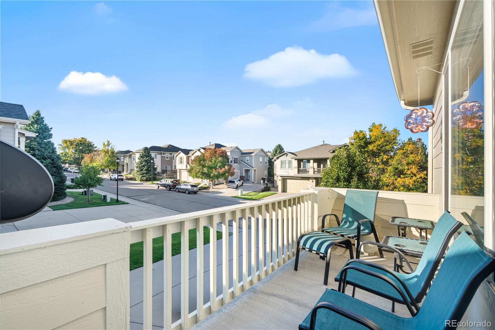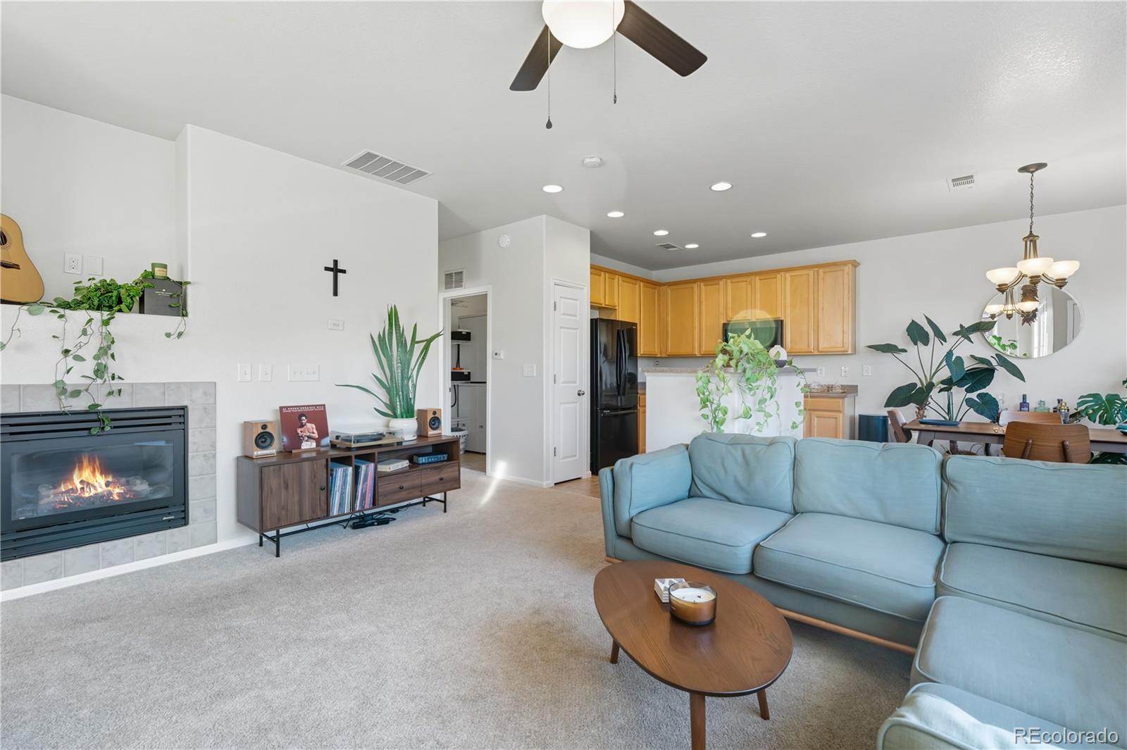 Welcome to Thorncreek Village living! This inviting condo is move-in ready and just waiting for your personal touch. You’ll love the convenience of a 1-car attached garage with private interior access for parking or extra storage. Head upstairs to a spacious, light-filled living room featuring a cozy gas fireplace and expansive south- and west-facing windows that flood the space with sunshine. The open-concept kitchen offers an island with bar seating, ample counter space, and a pantry for all your storage needs. Just off the kitchen, the dining area flows seamlessly to a private balcony, perfect for morning coffee, grilling, or relaxing in the fresh Colorado air. The main level includes a full bathroom, a secondary bedroom with a ceiling fan, and the primary suite. The primary retreat features dual exposures, a ceiling fan, a large walk-in closet, and a private en-suite with a soaking tub and extra-wide vanity. For added convenience, the washer and dryer are included in the unit. Enjoy access to the community pool and clubhouse just down the road, with neighborhood paths offering mountain and Thorncreek Golf Course views. Commuters will appreciate easy highway access, and the location puts you minutes from shopping, dining, and entertainment. Denver Premium Outlets, Top Golf, Costco, and Larkridge Retail Center are all just a short drive away. The perfect blend of comfort, convenience, and Colorado lifestyle, welcome home!