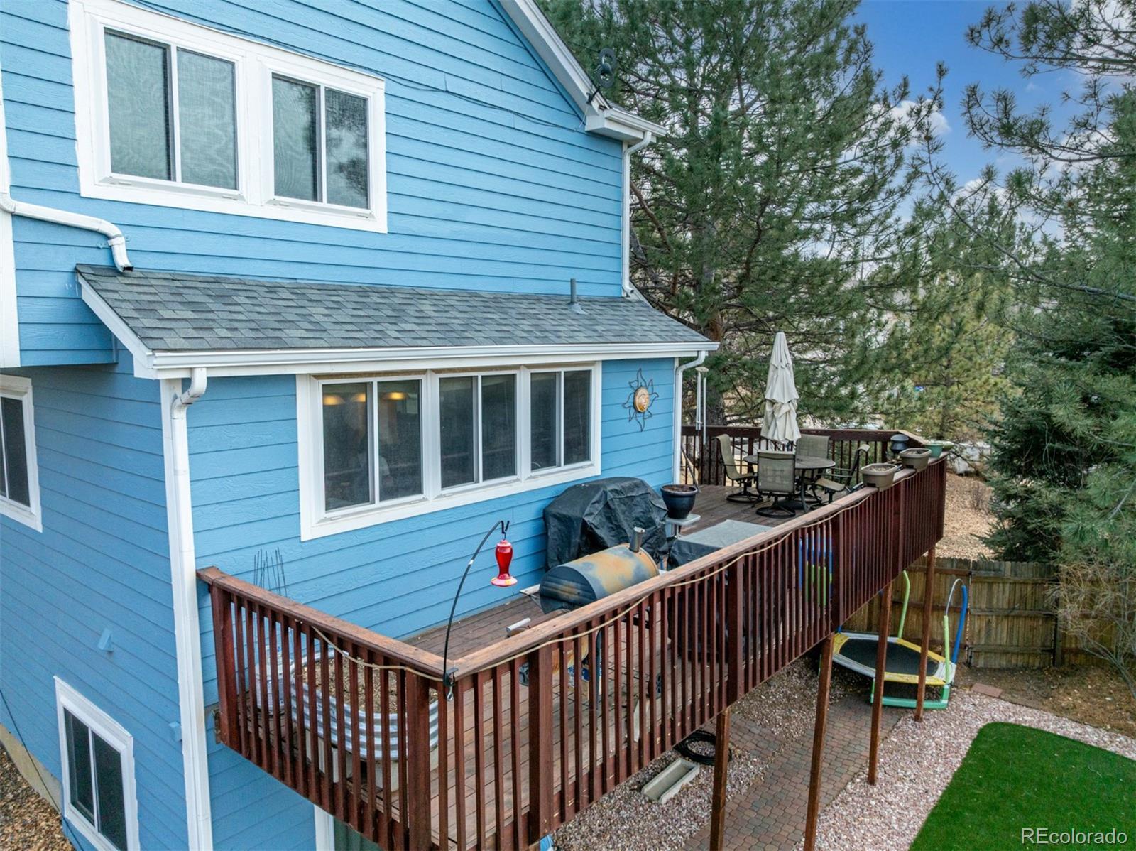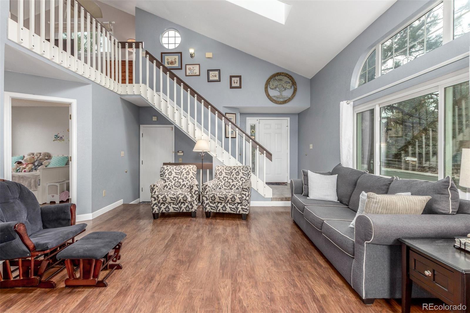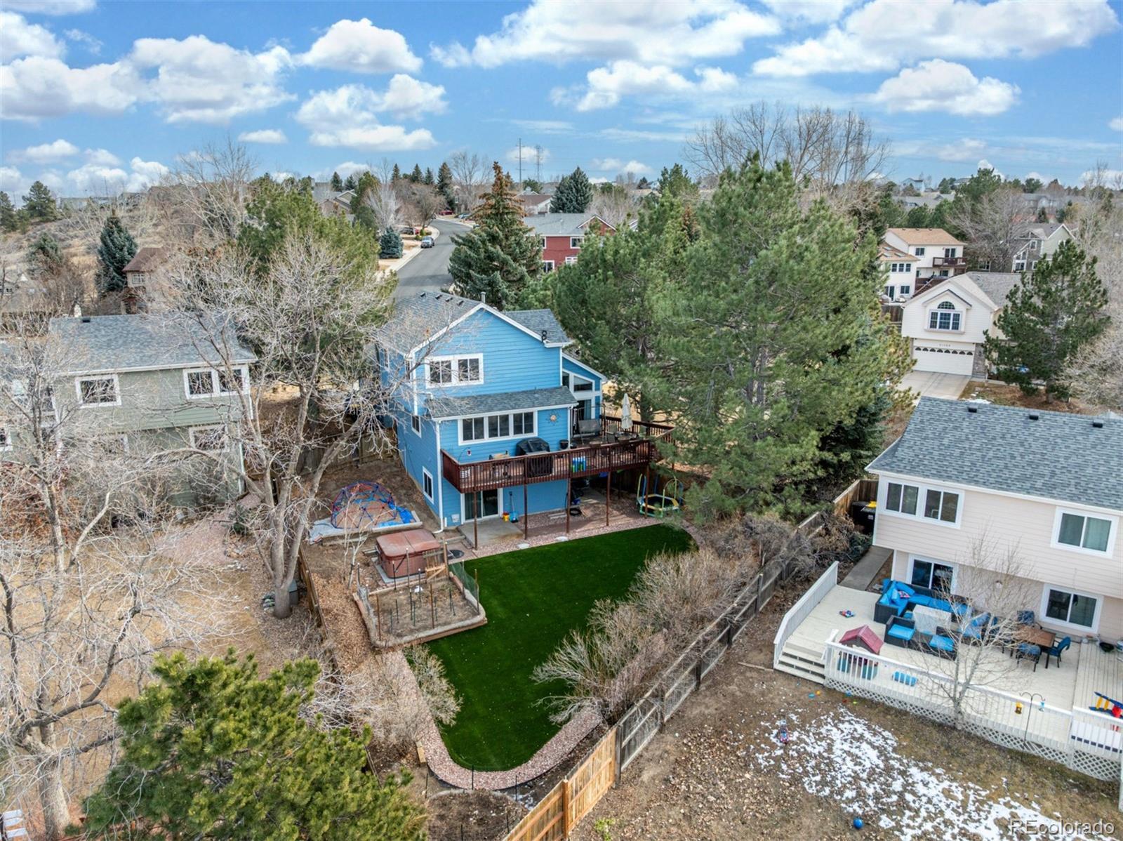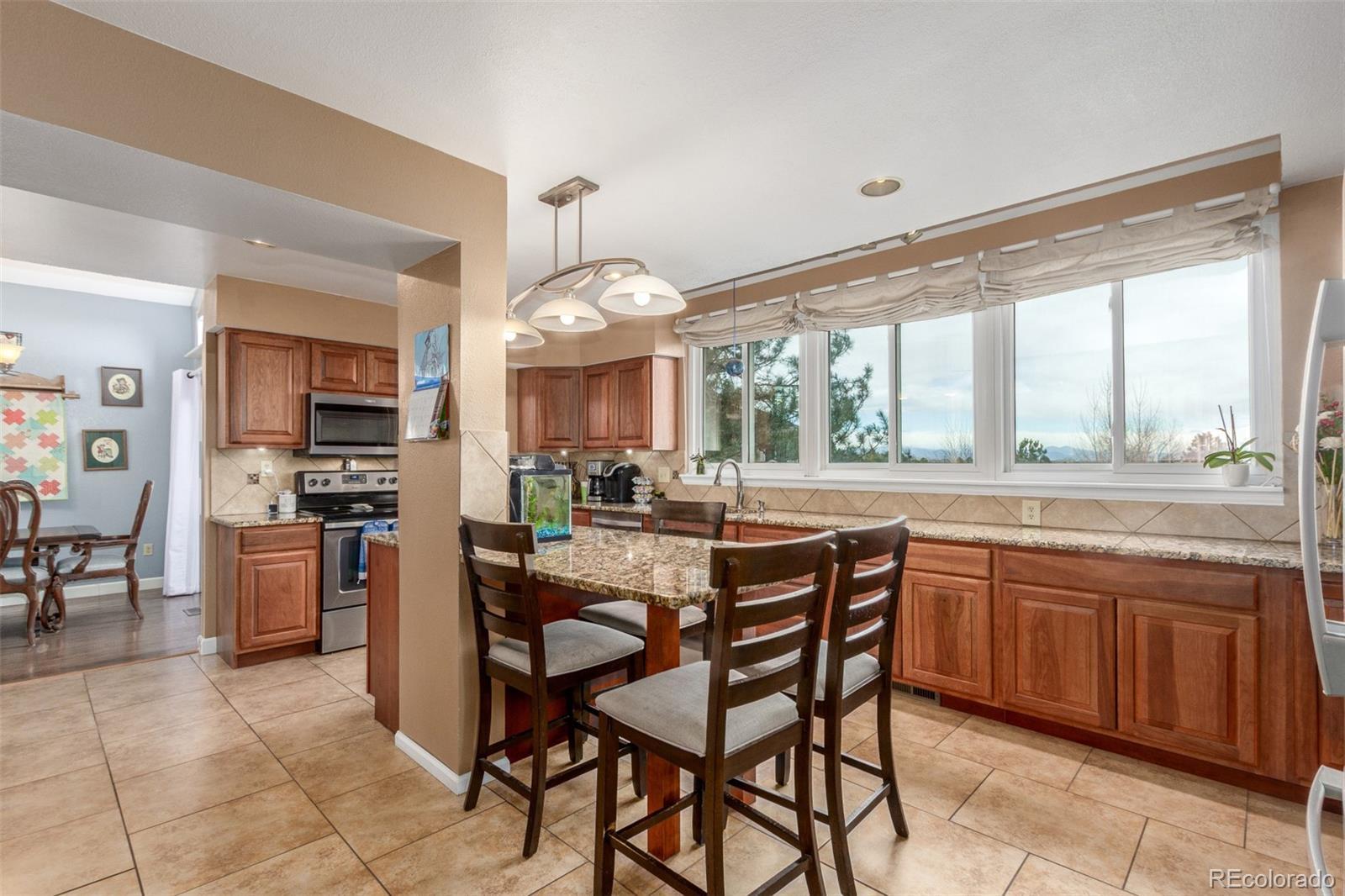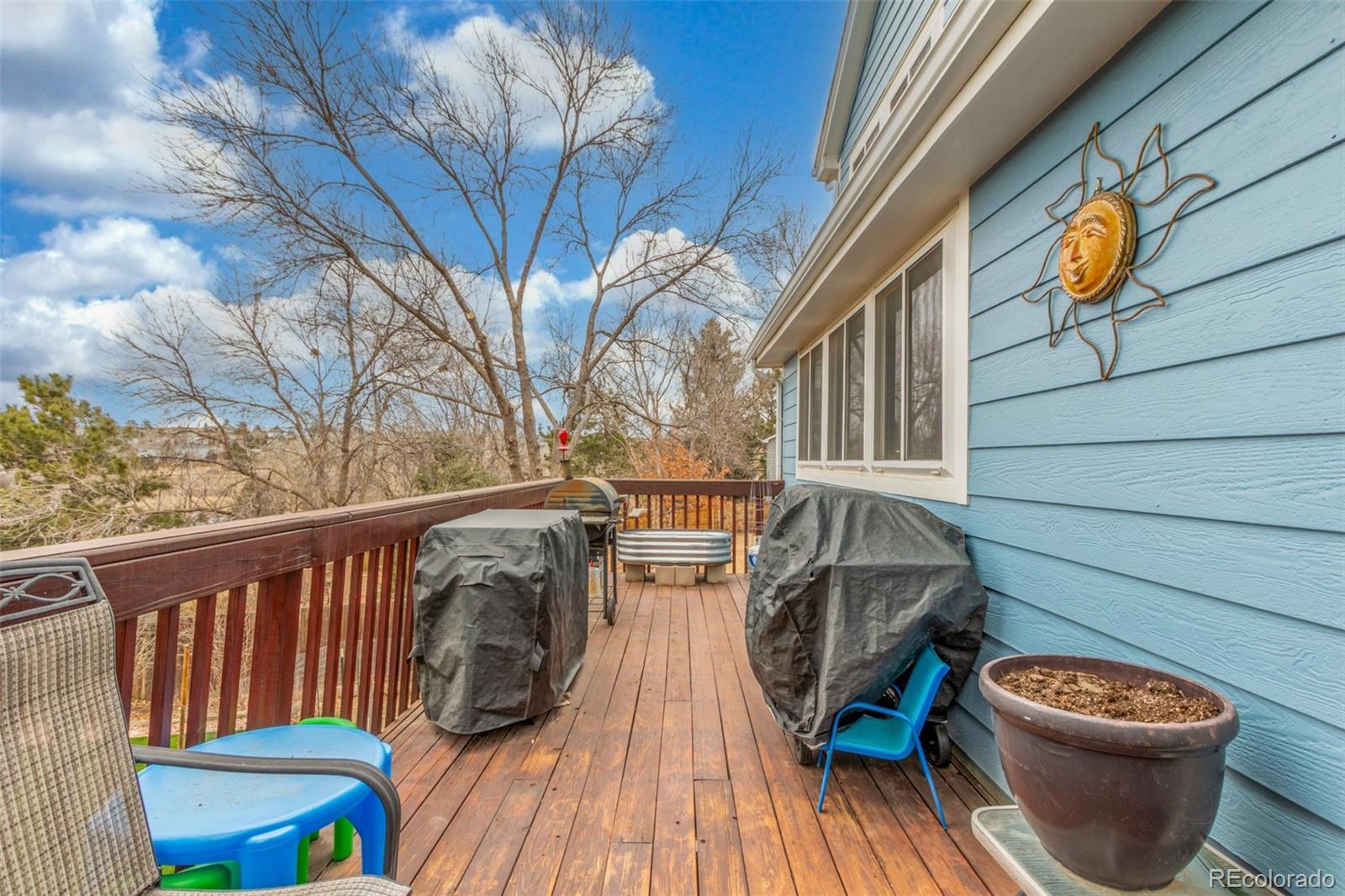 Set on a desirable corner lot with sweeping, unobstructed mountain views, this beautifully maintained Parker home offers a flexible layout, thoughtful updates, and exceptional indoor-outdoor living. The main floor features an updated kitchen with copious hickory cabinetry, granite counters, generous island seating, and stunning west-facing mountain views that carry into the dining room. The living room features a gas fireplace that creates a warm, inviting gathering space. A main-floor bedroom and full bathroom provide ideal flexibility for any need. Step outside to the wraparound deck—perfect for barbecuing, entertaining, or simply taking in Colorado sunsets and mountain vistas. Upstairs, the primary suite is a true retreat, complete with a loft space, expansive bedroom with mountain views, and a large ensuite bathroom. The walkout basement adds incredible functionality, offering a spacious second living area with a fireplace, wet bar, laundry room, additional bedroom, and ¾ bathroom. Outside, the mature landscaping, large corner lot, colorful flower beds, and a xeriscaped backyard create a private oasis, complete with a hot tub. Located within easy walking distance to schools and neighborhood trails, this home combines everyday convenience with the beauty of Colorado living.