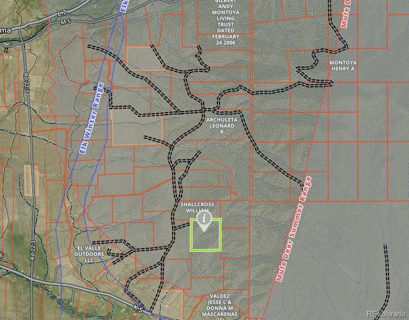 Sitting at about 8700 ft in elevation, you'll feel on top of the world here. It's just .16 mile from from the main dirt road in an area the rest of the world doesn't even know about! As you can see in the topo map from the OnX Hunt app, this is a beautifully adventurous property. There are a lot of hooved animal droppings here! There are no build time requirements at here. However, if the buyer chooses to build, you would be looking at the installation of a septic system, a solar energy system and either the installation of a well or cistern to haul water in. Costilla County building codes apply. Bring your camera along with the directions!