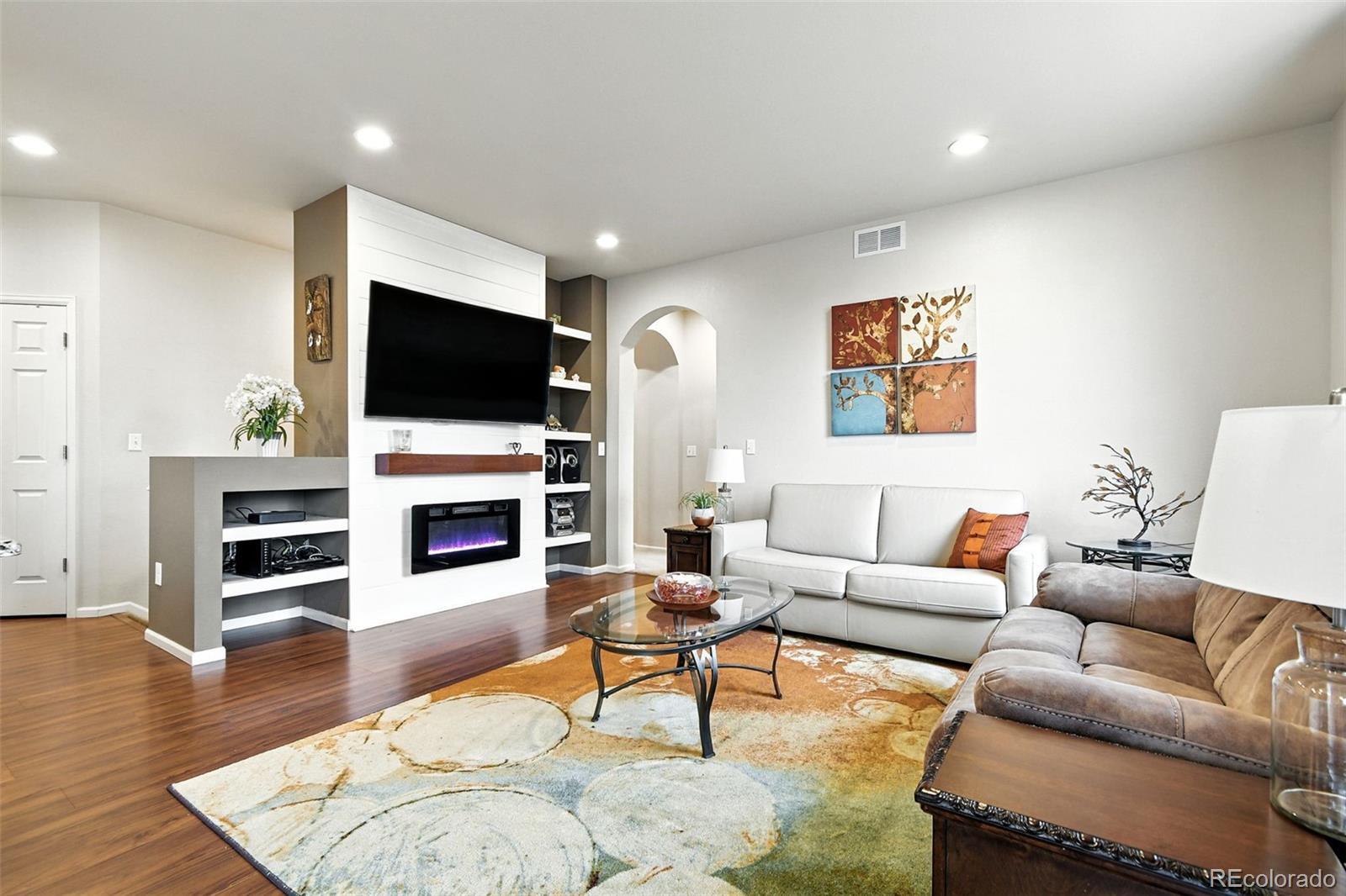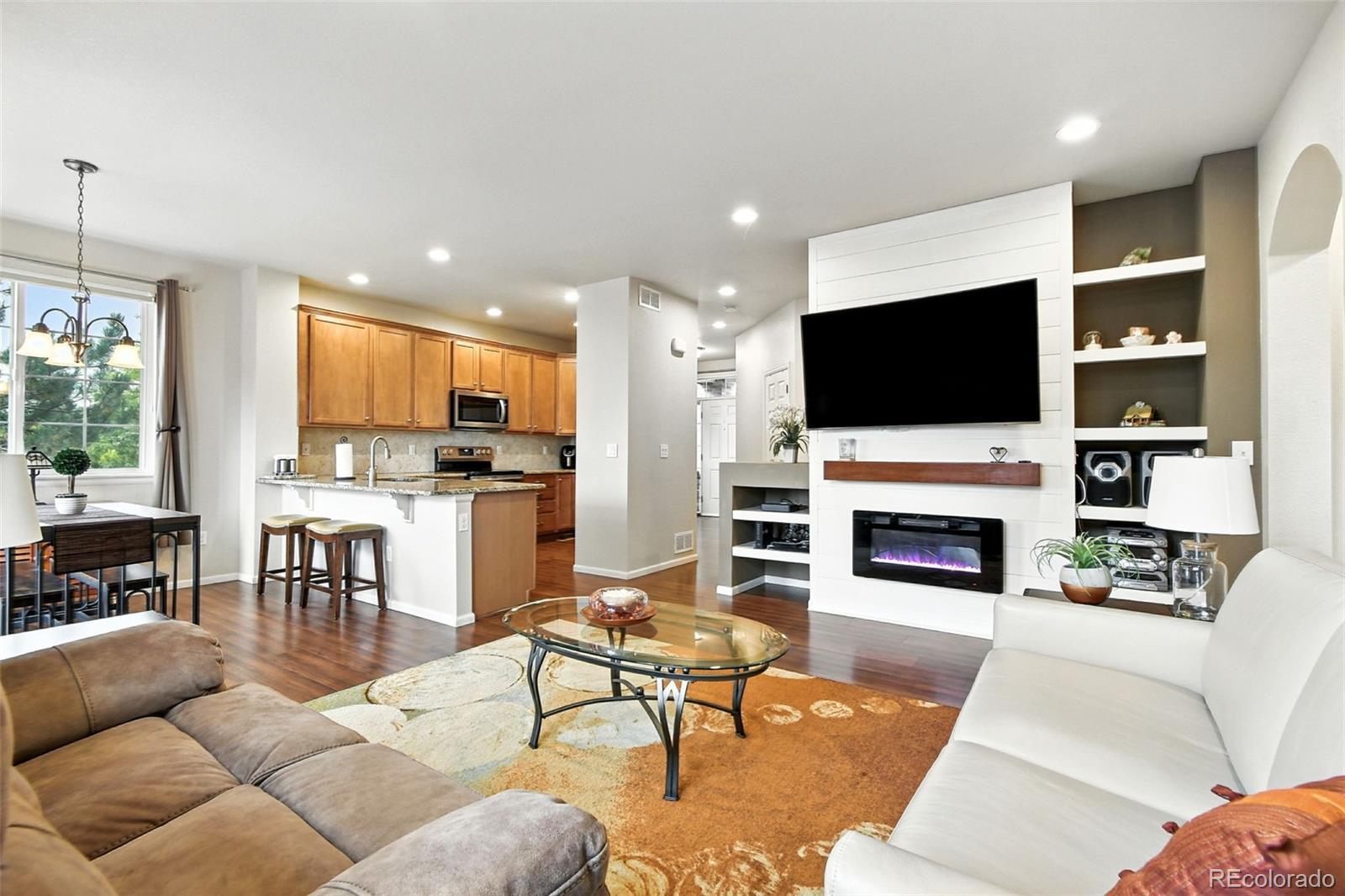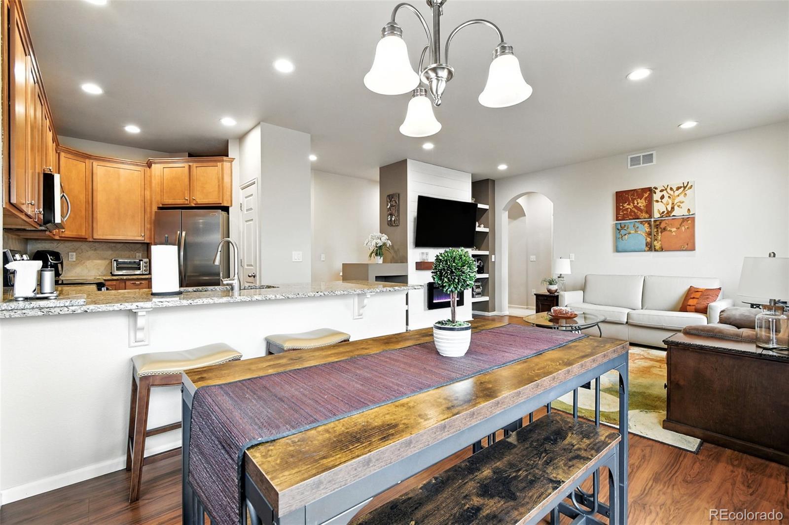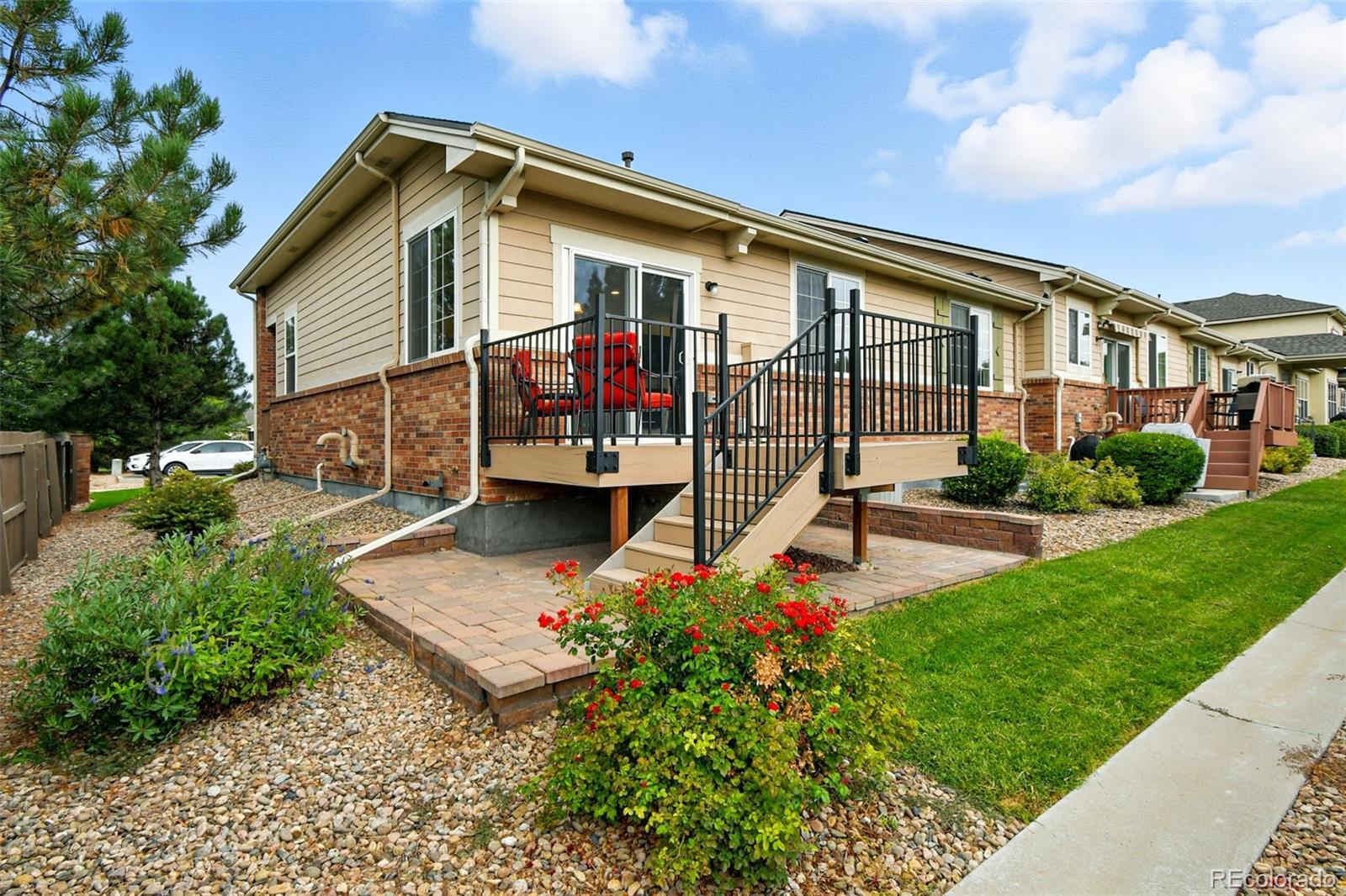 Welcome to this beautifully maintained and thoughtfully upgraded ranch-style townhome in the highly sought-after Veranda community, where natural light fills an expansive single-level layout designed for comfort and elegance. This rare two-bedroom, two-bath residence showcases hardwood vinyl flooring, granite countertops, and a stylish kitchen with 42" cabinets and newer 2023 stainless steel appliances. The open-concept living and dining areas are centered around an electric fireplace and framed by sunlit windows, while the primary suite offers a five-piece bath with dual sinks, soaking tub, oversized tiled shower, and walk-in closet. Additional highlights include a spacious laundry room, oversized two-car attached garage with utility sink and tool rack, and an insulated unfinished basement with soaring ceilings-perfect for storage, a gym, or future expansion. Enjoy the new Trex deck with the flexibility to add additional fencing if desired, plus the privacy of owning the land between the patio and the neighboring home. With thoughtful upgrades such as a 2023 water tank, new windows dressed in custom Hunter Douglas blinds, and a brand-new 2025 roof covered by the HOA, this "Lock and Walk" home delivers a turnkey, low-maintenance lifestyle only minutes from Adams 12 Five Star Schools, the N Line Light Rail, parks, trails, shopping, and dining. Tour this home online! Virtual tour and floorplan available through the listing links attached.