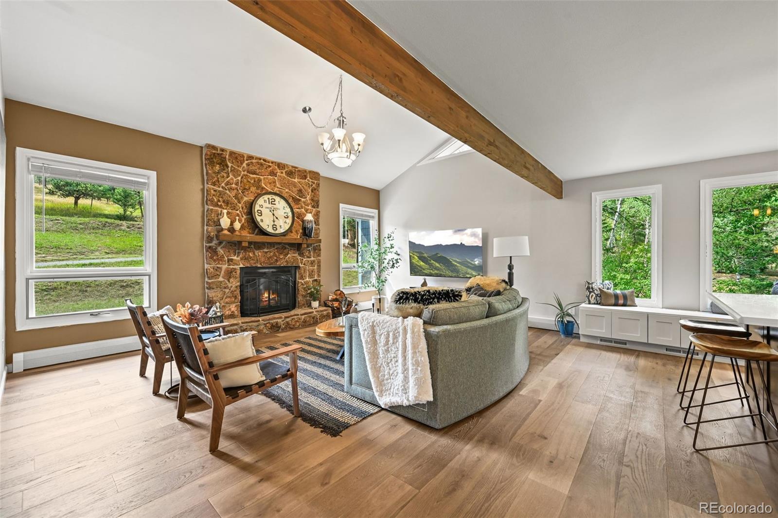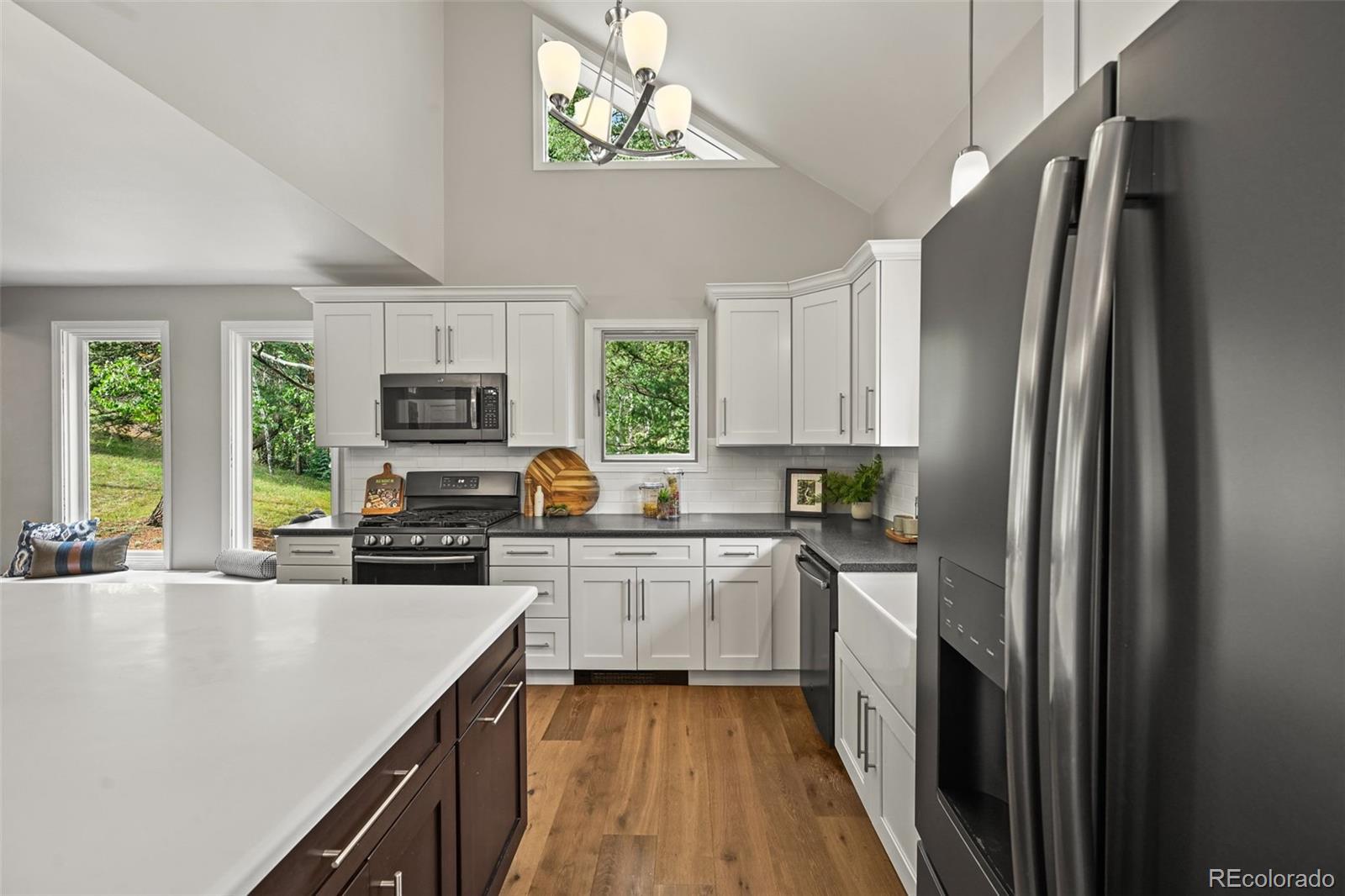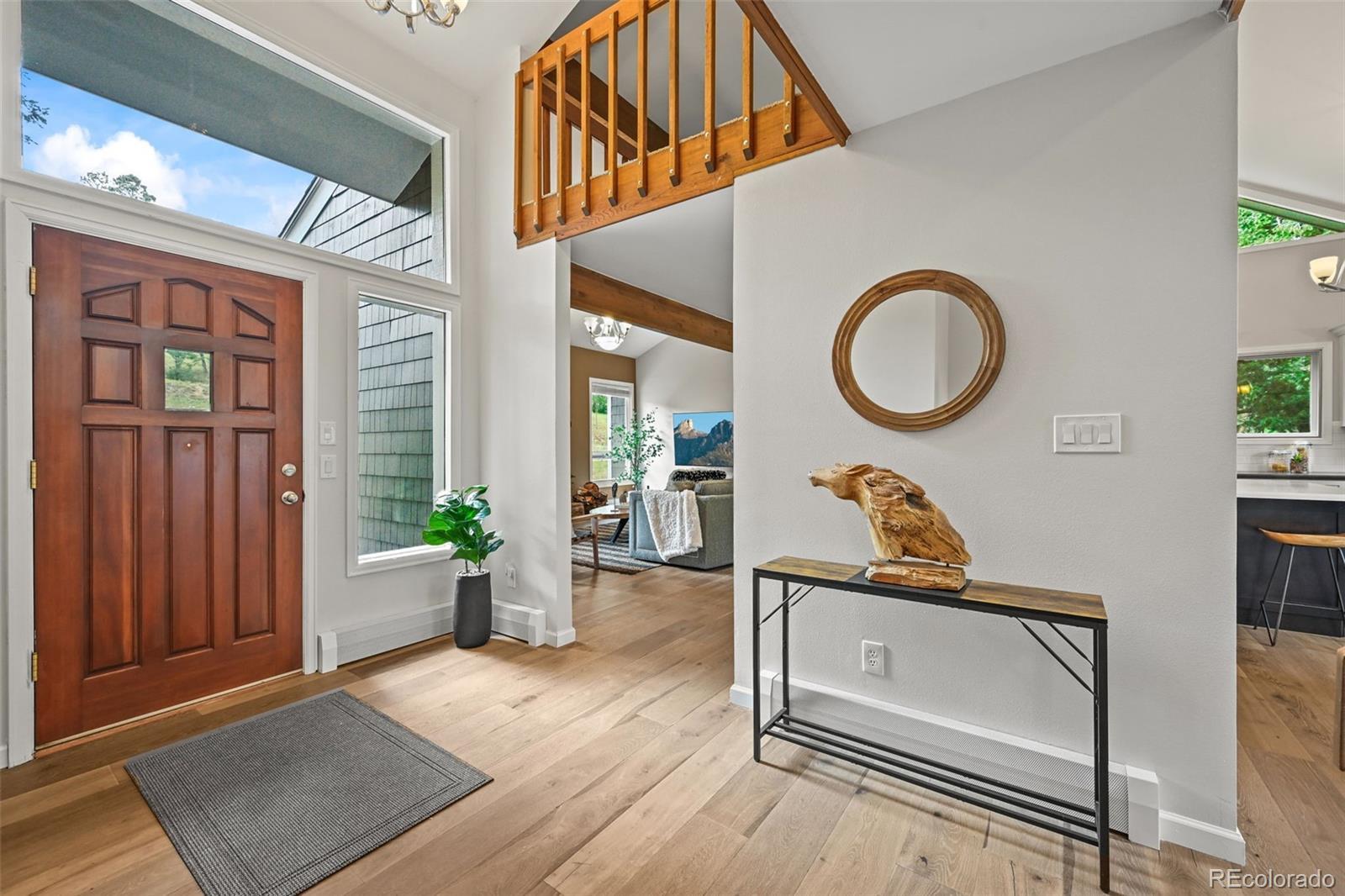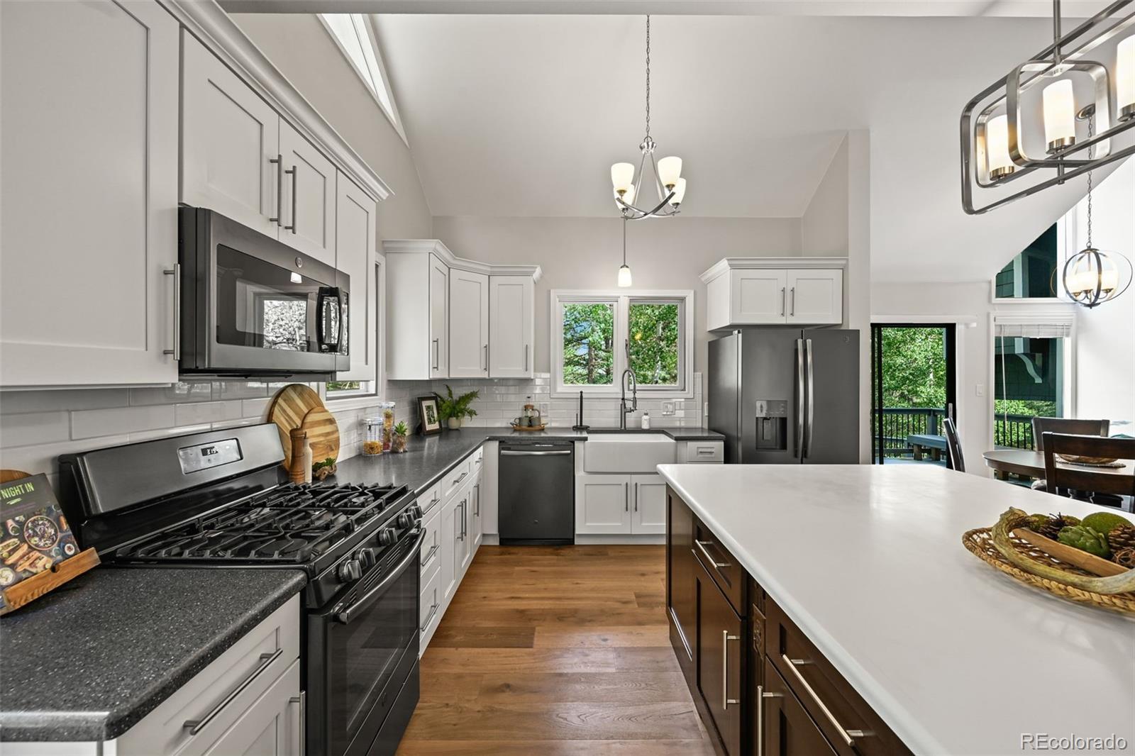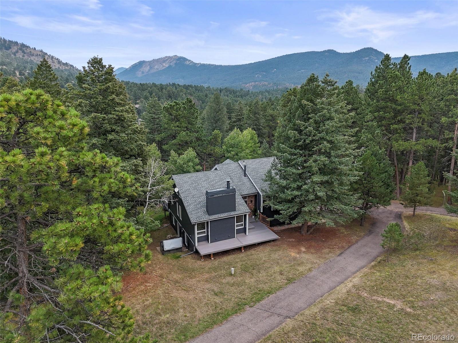 Beautifully remodeled 4-bedroom, 4-bath tri-level with finished walk-out basement, perfectly set on a walkable, wooded 1+ acre lot in Evergreen West. This home blends timeless mid-century character with extensive modern updates for comfortable mountain living. Step inside to soaring vaulted ceilings, extensive windows providing natural light, and an inviting moss-rock wood-burning fireplace in the living room. The adjacent dining room flows seamlessly to the stunning new kitchen featuring a massive island, quartz countertops, soft-close cabinetry, farmhouse sink, a gas stove and sleek black stainless-steel appliances. The spacious loft, overlooking the living room, offers flexibility for a home office or artist studio. Extensive interior remodeling has been done on this home including new flooring, new outlets & switches, new light fixtures, new door hardware and new interior paint! The luxurious primary suite is a true retreat with windows overlooking the serene backyard. The spa-style 5-piece bathroom with cathedral ceilings and a wall of windows to the ceiling includes a freestanding tub, glass-enclosed shower and dual vanities. Two additional upper-level bedrooms share a full bathroom. The lower level offers a convenient mudroom/laundry area with a new half bath. The finished walk-out basement includes a spacious family room with a 2nd moss-rock fireplace, non-conforming 4th bedroom, and walk-out access to the hot tub—ideal for a guest suite, teenager’s retreat, or potential ADU or mother-in-law apartment. Outdoor living shines with a brand-new front deck, expansive multi-level back deck, and plenty of space to enjoy the natural surroundings. A circular driveway adds curb appeal and easy access year-round. This home has a brand new roof, new gutters & exterior painting has just been completed too. New finishes-inside and out! All this with lower property taxes in Clear Creek County, plus the peace and beauty of Evergreen’s mountain setting.
