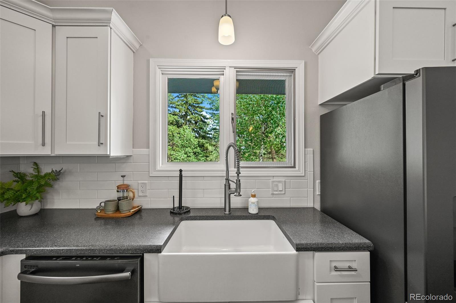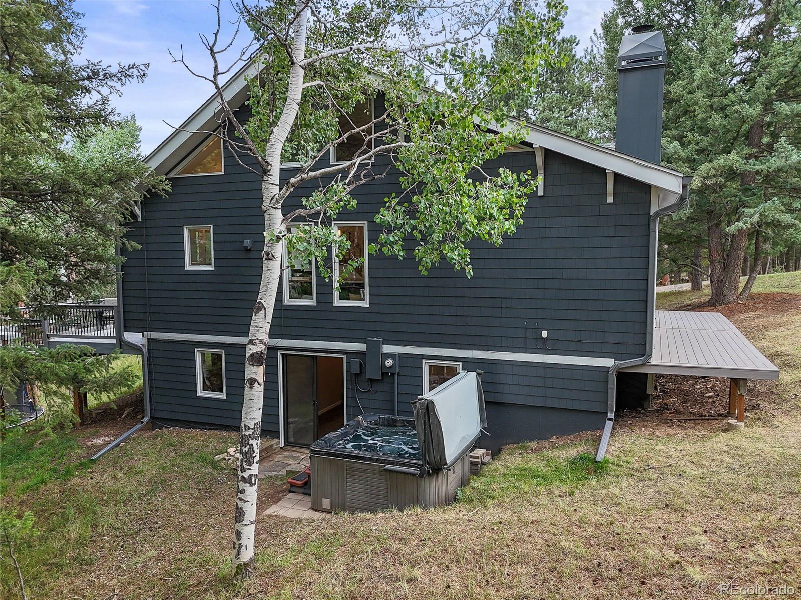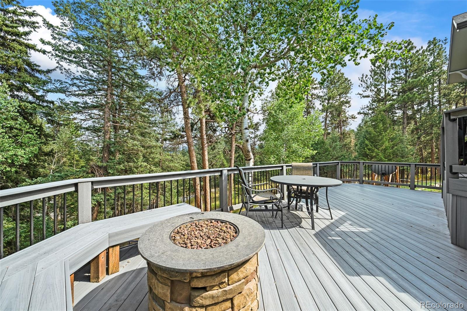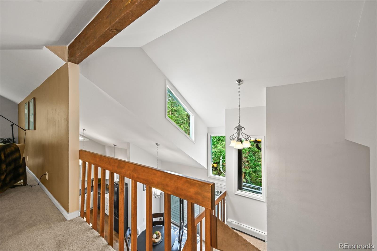Beautifully remodeled 4-bedroom, 4-bath tri-level with finished walk-out basement, perfectly set on a walkable, wooded 1+ acre lot in Evergreen West. This home blends timeless mid-century character with extensive modern updates for comfortable mountain living. Step inside to soaring vaulted ceilings, extensive windows providing natural light, and an inviting moss-rock wood-burning fireplace in the living room. The adjacent dining room flows seamlessly to the stunning new kitchen featuring a massive island, quartz countertops, soft-close cabinetry, farmhouse sink, a gas stove and sleek black stainless-steel appliances. The spacious loft, overlooking the living room, offers flexibility for a home office or artist studio. Extensive interior remodeling has been done on this home including new flooring, new outlets & switches, new light fixtures, new door hardware and new interior paint! The luxurious primary suite is a true retreat with windows overlooking the serene backyard. The spa-style 5-piece bathroom with cathedral ceilings and a wall of windows to the ceiling includes a freestanding tub, glass-enclosed shower and dual vanities. Two additional upper-level bedrooms share a full bathroom. The lower level offers a convenient mudroom/laundry area with a new half bath. The finished walk-out basement includes a spacious family room with a 2nd moss-rock fireplace, non-conforming 4th bedroom, and walk-out access to the hot tub—ideal for a guest suite, teenager’s retreat, or potential ADU or mother-in-law apartment. Outdoor living shines with a brand-new front deck, expansive multi-level back deck, and plenty of space to enjoy the natural surroundings. A circular driveway adds curb appeal and easy access year-round. This home has a brand new roof, new gutters & exterior painting has just been completed too. New finishes-inside and out! All this with lower property taxes in Clear Creek County, plus the peace and beauty of Evergreen’s mountain setting.