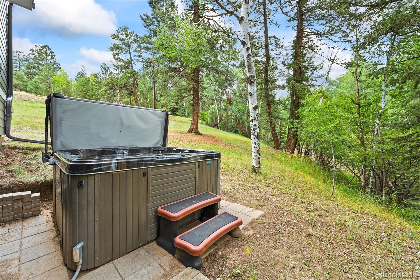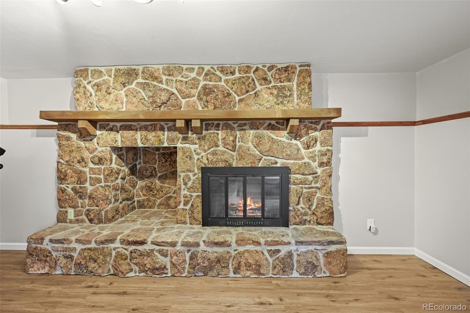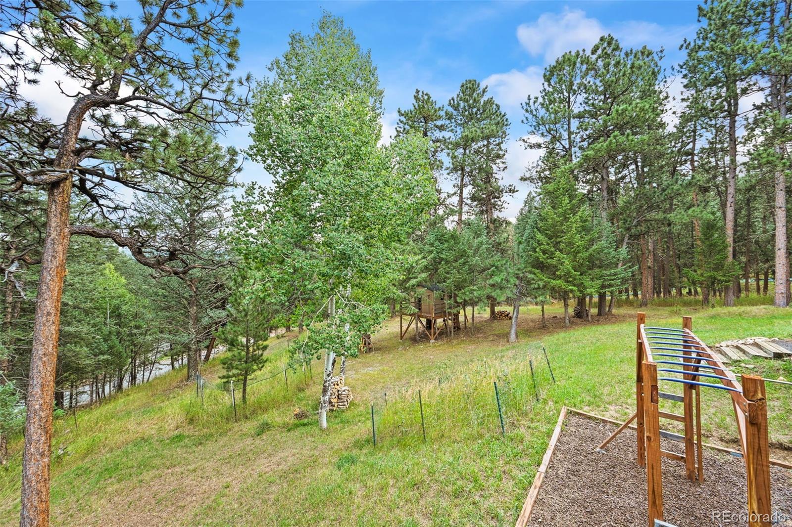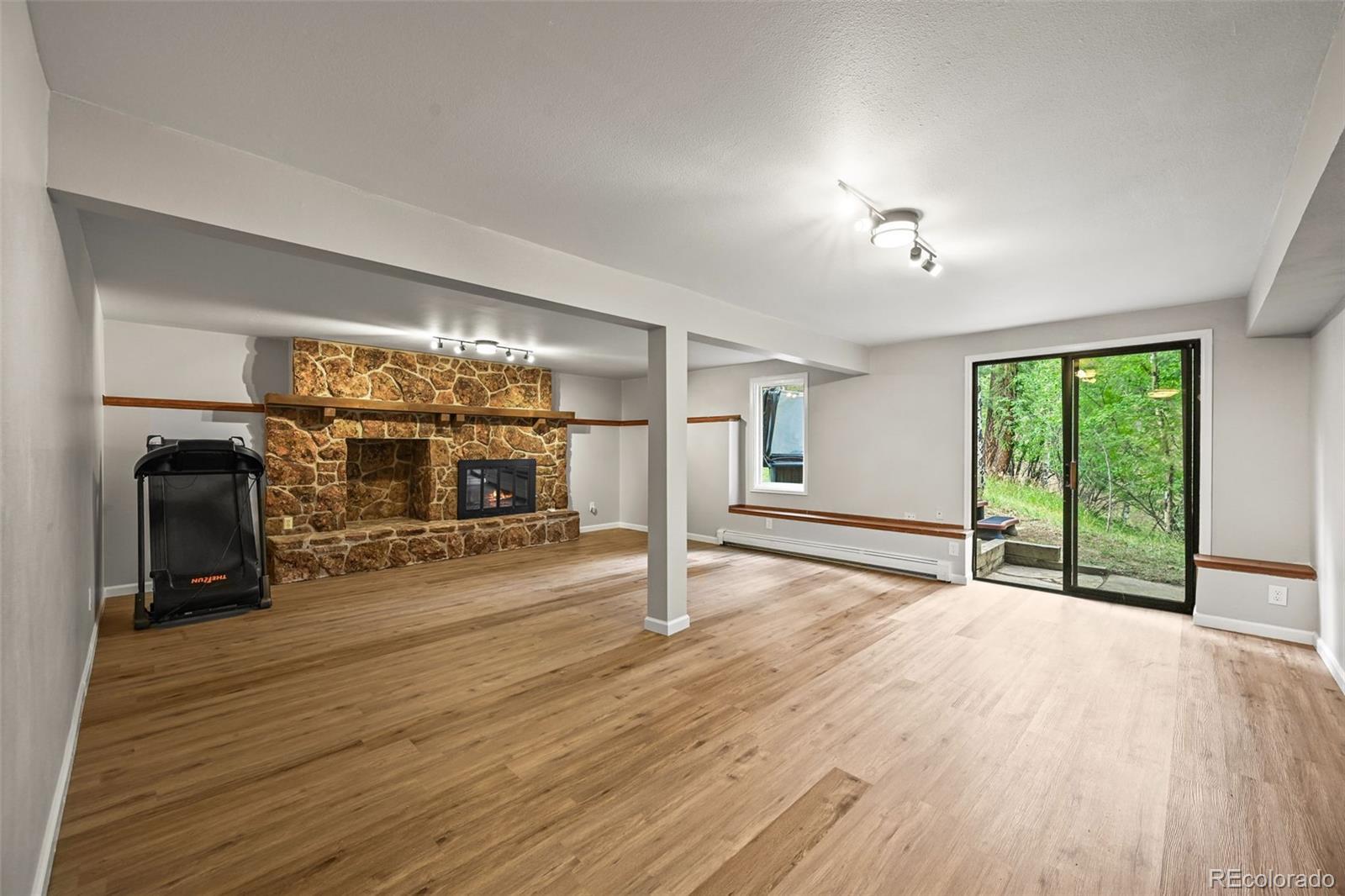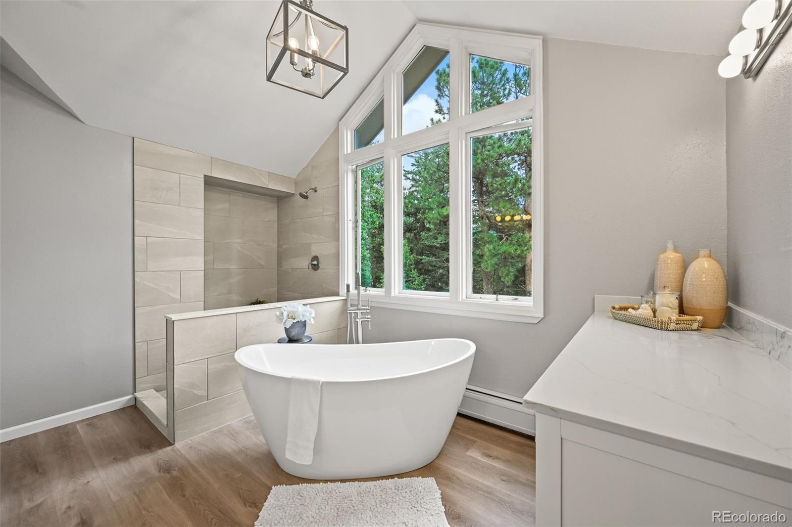 Beautifully remodeled 4-bedroom, 4-bath tri-level with finished walk-out basement, perfectly set on a walkable, wooded 1+ acre lot in Evergreen West. This home blends timeless mid-century character with extensive modern updates for comfortable mountain living. Step inside to soaring vaulted ceilings, extensive windows providing natural light, and an inviting moss-rock wood-burning fireplace in the living room. The adjacent dining room flows seamlessly to the stunning new kitchen featuring a massive island, quartz countertops, soft-close cabinetry, farmhouse sink, a gas stove and sleek black stainless-steel appliances. The spacious loft, overlooking the living room, offers flexibility for a home office or artist studio. Extensive interior remodeling has been done on this home including new flooring, new outlets & switches, new light fixtures, new door hardware and new interior paint! The luxurious primary suite is a true retreat with windows overlooking the serene backyard. The spa-style 5-piece bathroom with cathedral ceilings and a wall of windows to the ceiling includes a freestanding tub, glass-enclosed shower and dual vanities. Two additional upper-level bedrooms share a full bathroom. The lower level offers a convenient mudroom/laundry area with a new half bath. The finished walk-out basement includes a spacious family room with a 2nd moss-rock fireplace, non-conforming 4th bedroom, and walk-out access to the hot tub—ideal for a guest suite, teenager’s retreat, or potential ADU or mother-in-law apartment. Outdoor living shines with a brand-new front deck, expansive multi-level back deck, and plenty of space to enjoy the natural surroundings. A circular driveway adds curb appeal and easy access year-round. This home has a brand new roof, new gutters & exterior painting has just been completed too. New finishes-inside and out! All this with lower property taxes in Clear Creek County, plus the peace and beauty of Evergreen’s mountain setting.
