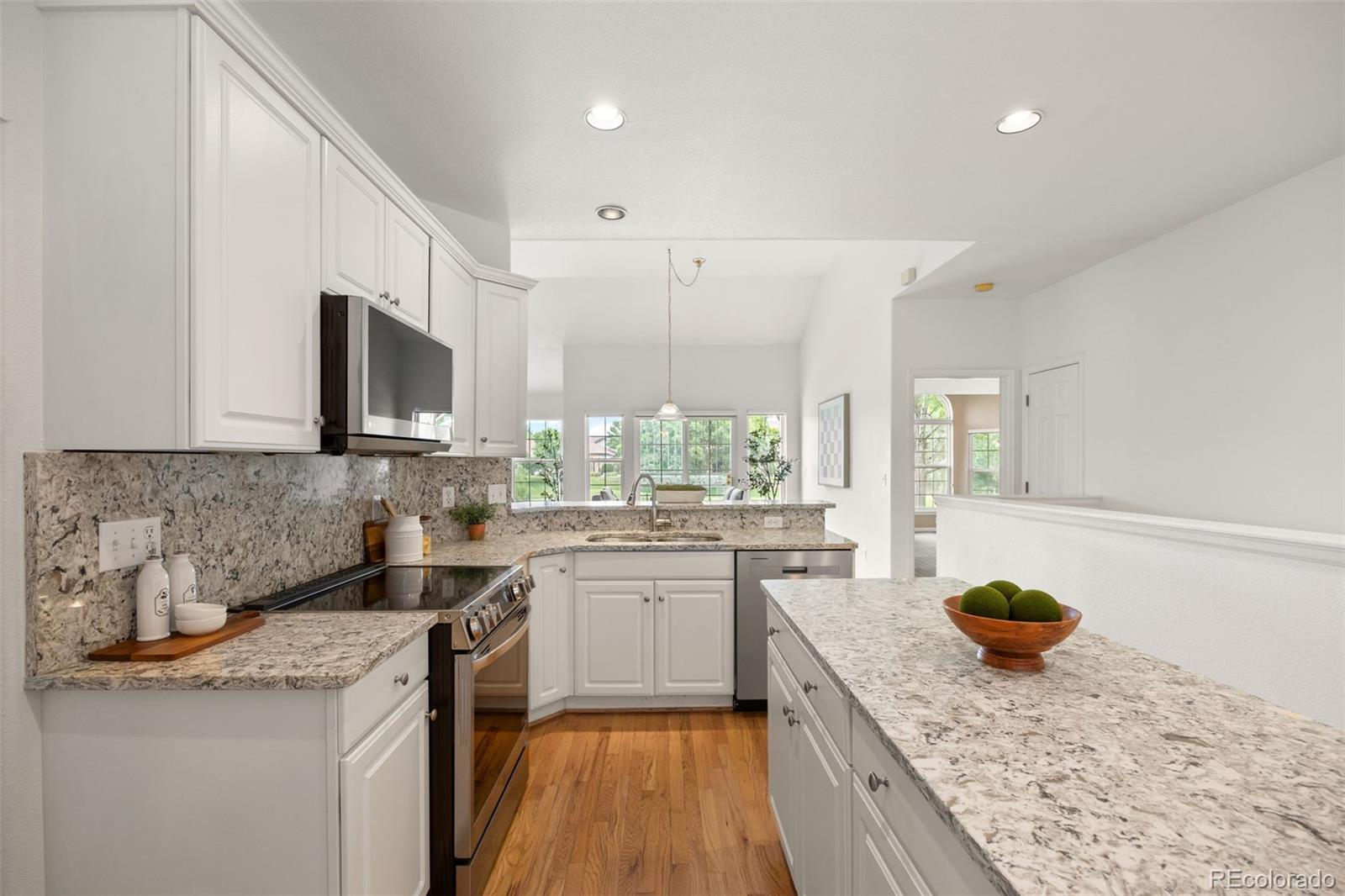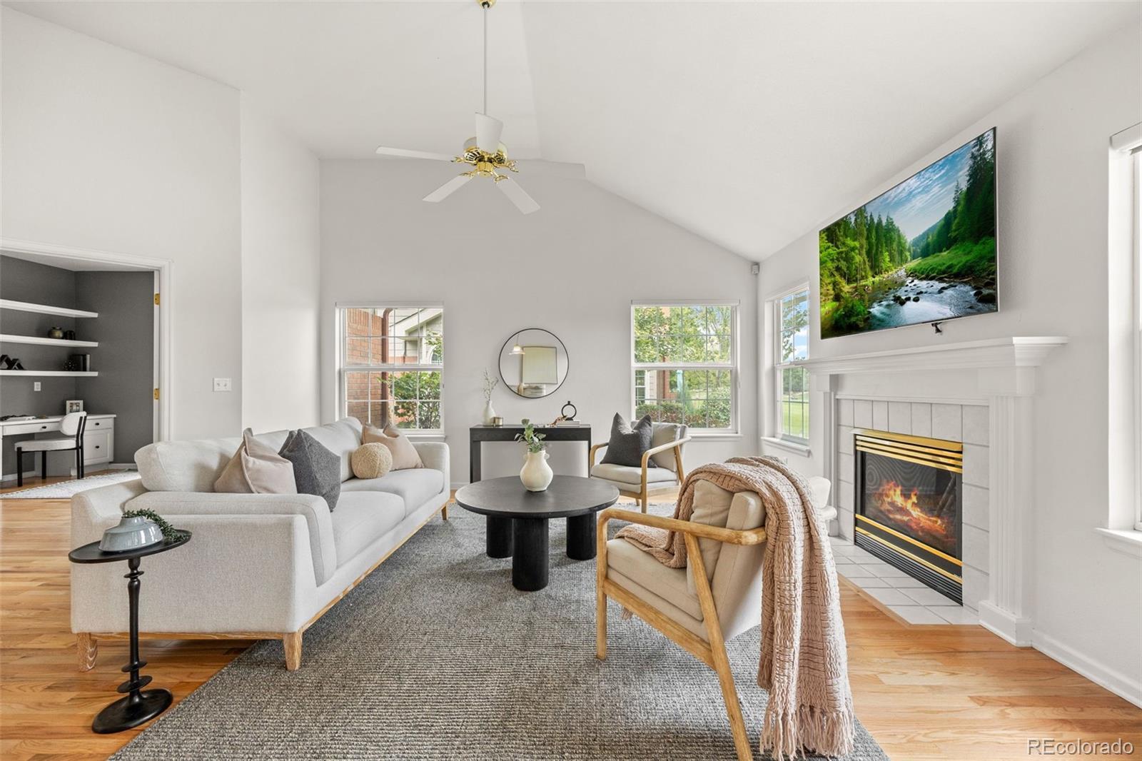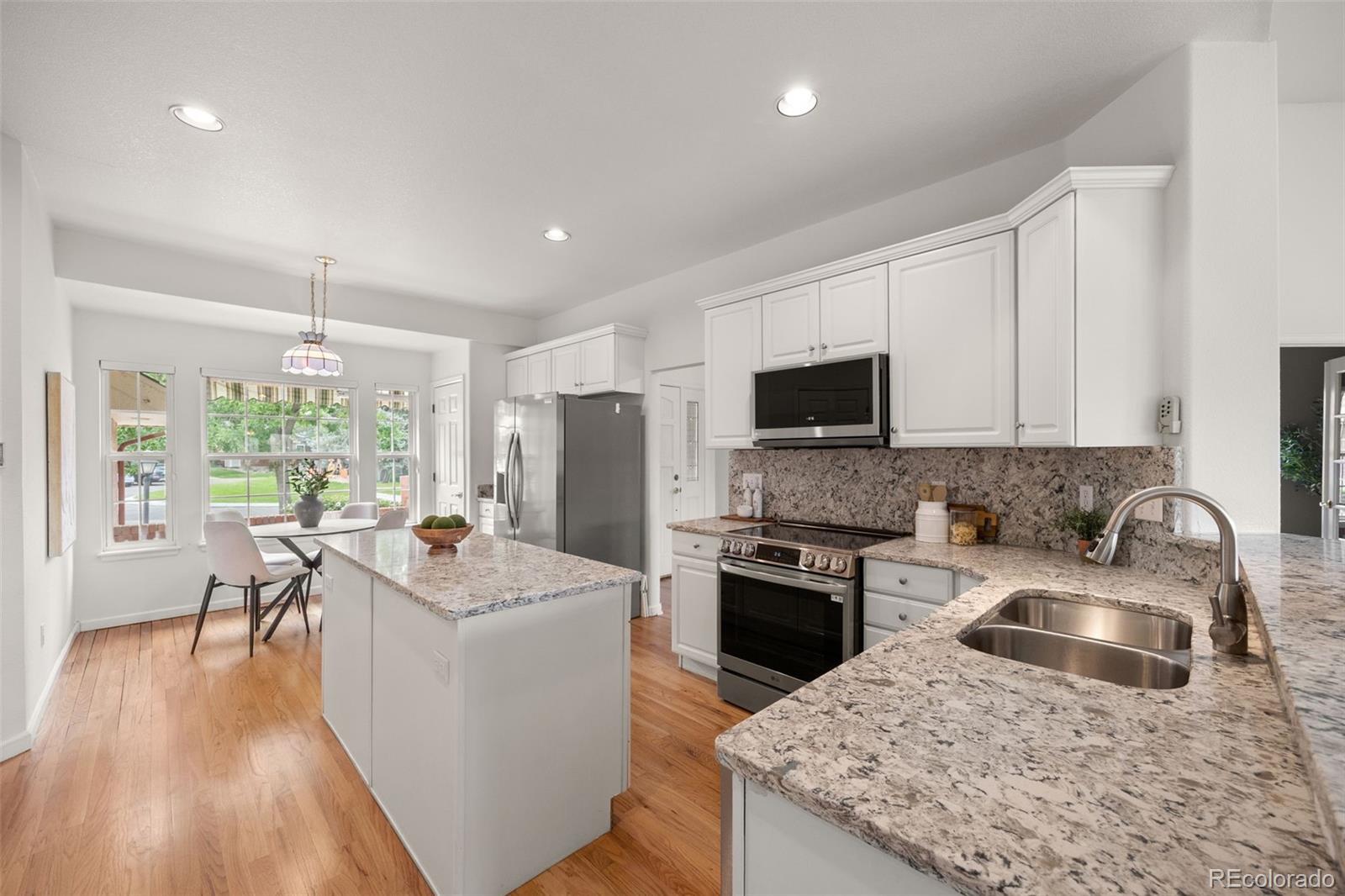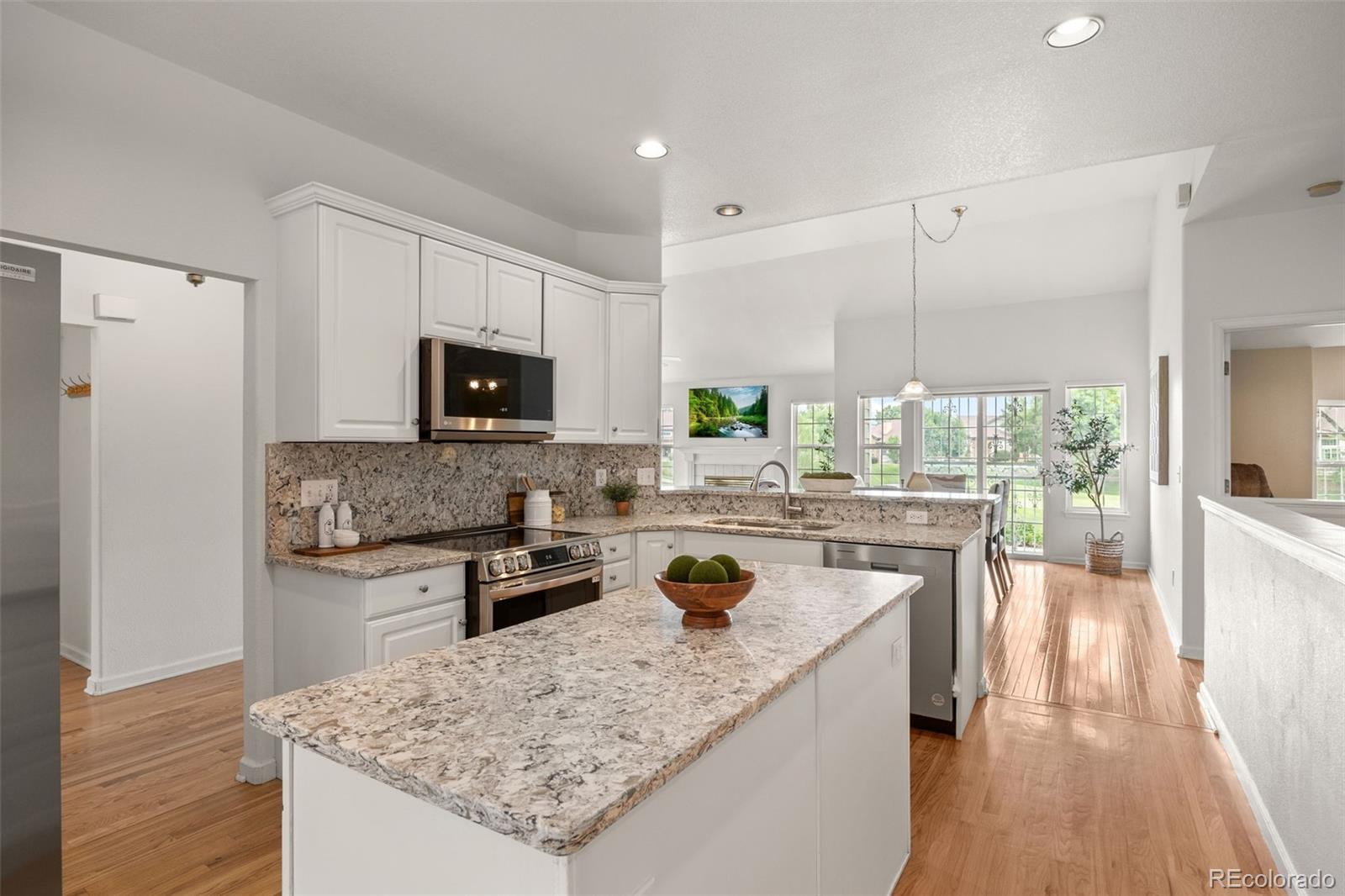 BACK ON MARKET! Beautiful ranch-style home in Littleton's highly sought after Riverwalk Community! This charming home backs directly onto the Littleton Golf Course, perfect for the golf and outdoor enthusiasts. Walk inside to discover beautiful hardwood floors, vaulted ceilings, and an abundance of natural light that fills the open-concept living space. On chilly Colorado days, cozy up next to the gas fireplace and enjoy the peaceful ambiance. The kitchen is a chef’s dream, featuring granite countertops, a brand-new smart induction stove, new Frigidaire refrigerator, and new microwave, and dishwasher. With an open layout and a dining area that overlooks the golf course, this home is ideal for entertaining family and friends. The spacious primary suite offers a walk-in closet and a luxurious five-piece en-suite bathroom complete with a jacuzzi tub. A dedicated home office features french doors, built-in shelving, and a functional desk space—perfect for remote work or creative pursuits. The second bedroom includes newer carpeting and a private full bath, making it an ideal guest retreat. Downstairs, the finished basement provides a flexible space that can be customized to suit your needs—whether it’s a second living area, craft room, or potential expansion into the unfinished portion. Enjoy LOW-maintenance living in a community that features a stunning clubhouse with a spa, outdoor pool, sauna, and hot tub. All of this, and just a short walk or bike ride to downtown Littleton, the Platte River Trail, and a wide variety of restaurants and shops. Come see this one of a kind home for yourself.