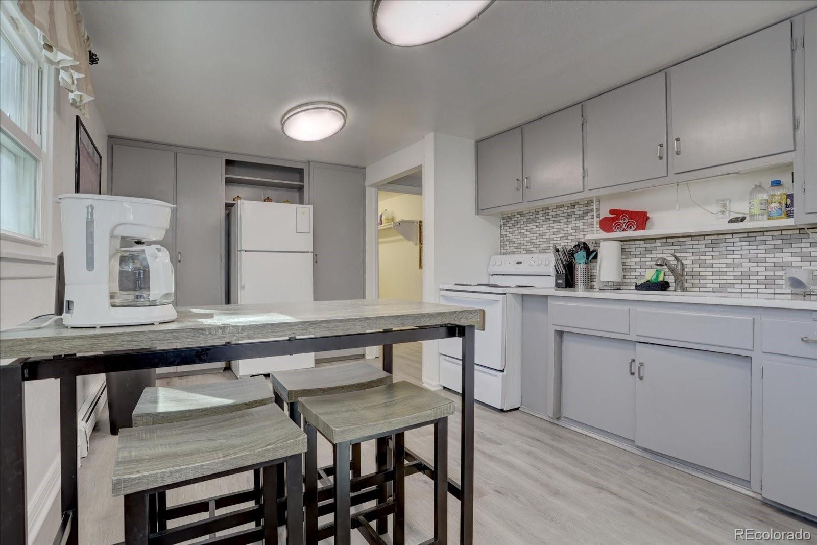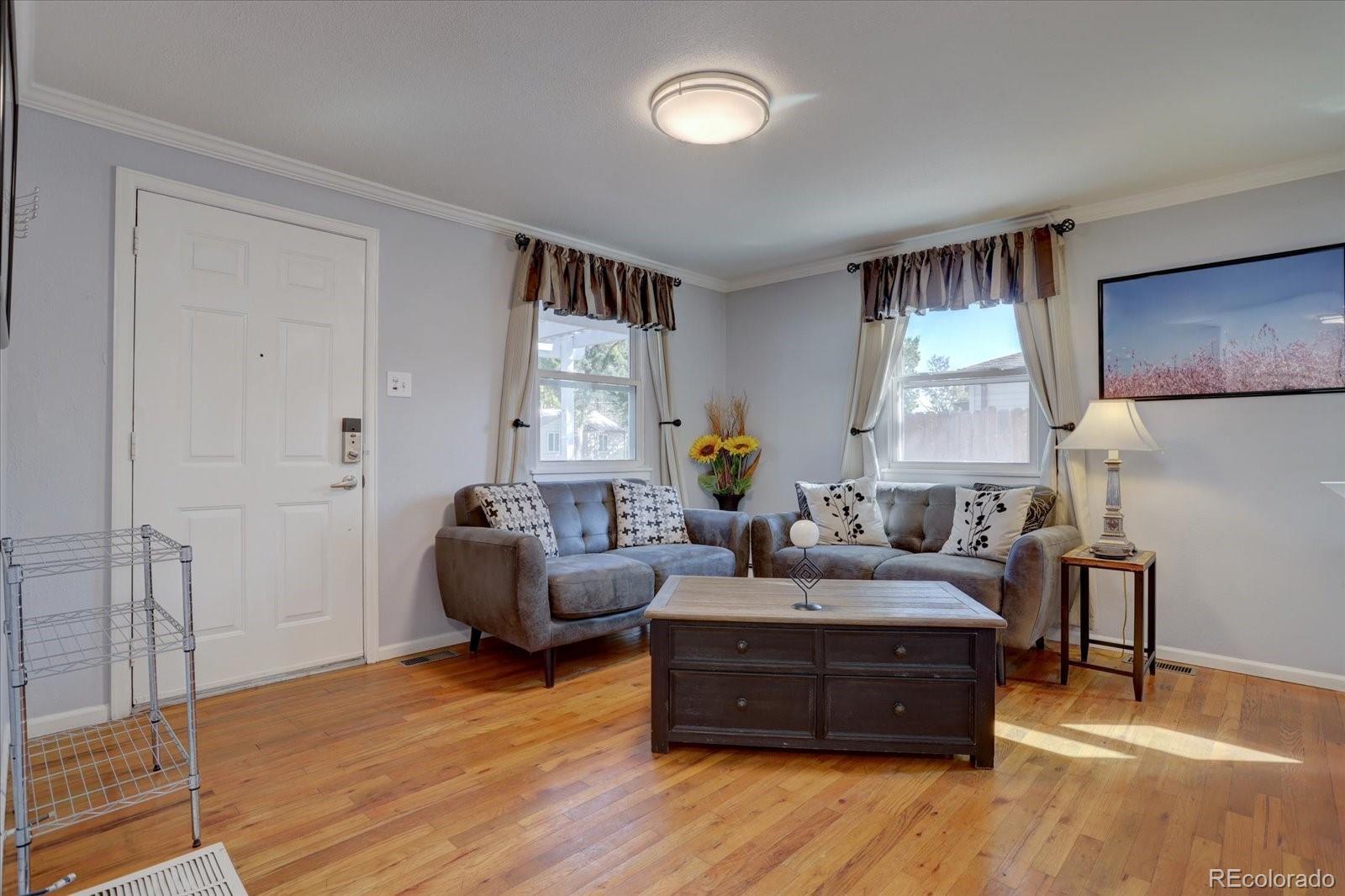 Welcome to 6940 West 55th Place - Move-In Ready Perfection in Arvada! Discover single-level living at its finest in this beautifully renovated 2-bedroom, 1-bath gem offering 1,006 square feet of thoughtfully designed living space. This turnkey home has been meticulously updated throughout and comes fully furnished with all kitchenware and cookware - simply bring your suitcase and start living! Interior Highlights: Step inside to an open, free-flowing floor plan featuring gleaming hardwood floors that flow through the living room, dining room, and both spacious bedrooms. The modern kitchen is a chef's delight with a breakfast bar, stunning quartz countertops, generous pantry storage, and all appliances included. Luxury vinyl plank flooring extends into the expansive family room, creating a perfect space for relaxation and entertaining.The gorgeously updated bathroom showcases custom tile work, designer tile floors, a pedestal sink, and a full bath/shower/tub combo. Throughout the home, you'll appreciate the modern custom light fixtures, sophisticated gray and white paint palette, and the classic touch of crown molding in the bedrooms and living room. Energy-efficient double-pane windows are dressed with higher-end window coverings and stylish drapery. Practical Features: Both bedrooms are generously sized with ample closet space, and one bedroom features convenient built-ins. A separate laundry room adds functionality to this well-designed home. Prime Arvada Location: Enjoy the perfect blend of suburban tranquility and urban accessibility! Located just 15 minutes from the G Line light rail station in Old Town Arvada, you're only five stops from downtown Denver. Big-box shopping and diverse restaurants are nearby, and easy I-70 access opens the door to downtown Denver or weekend adventures in the Rocky Mountains. Don't miss this rare opportunity to own a completely updated, move-in ready home in one of Arvada's most convenient locations!