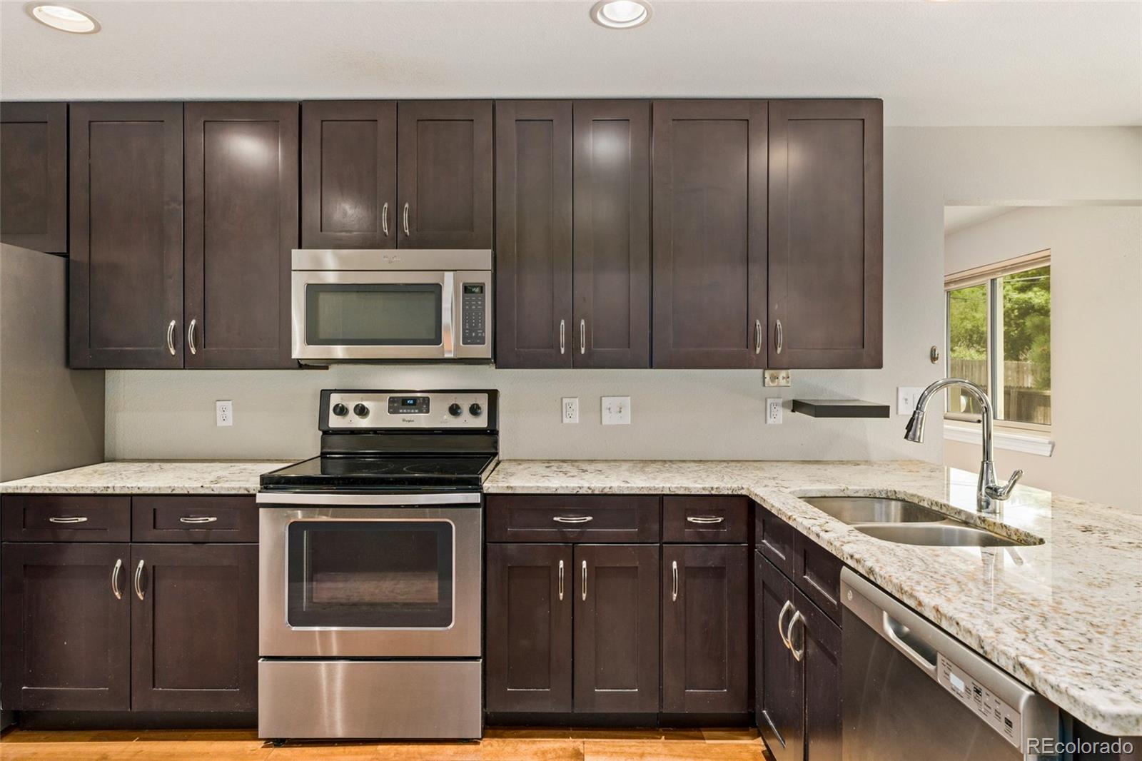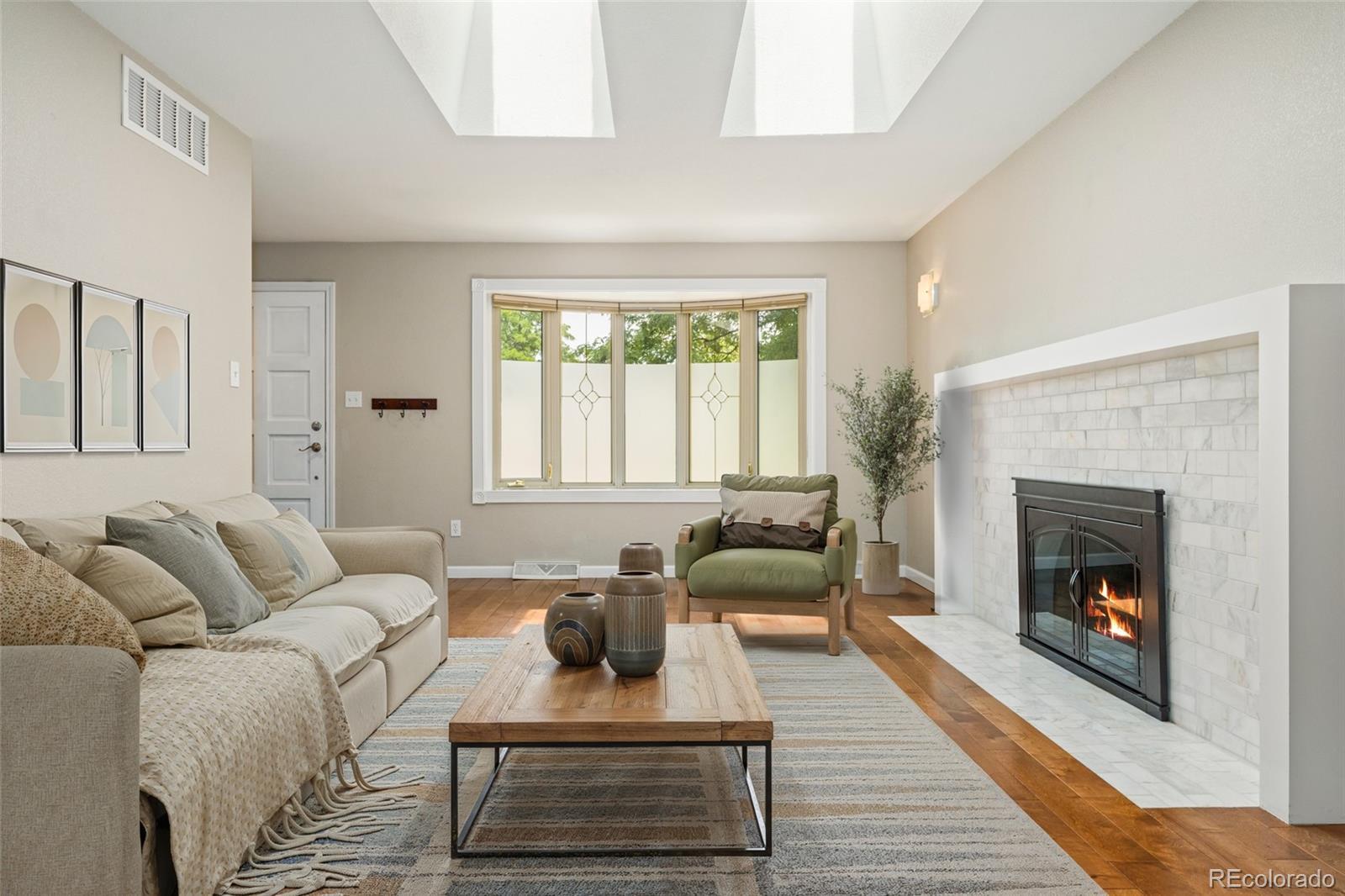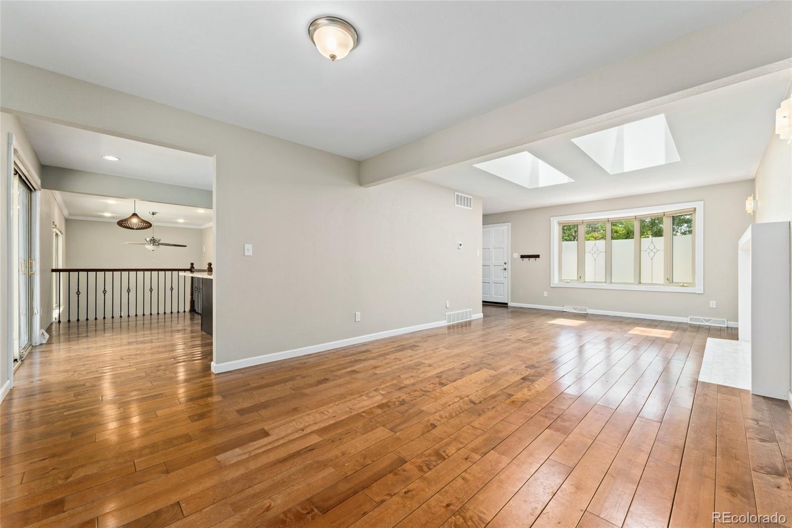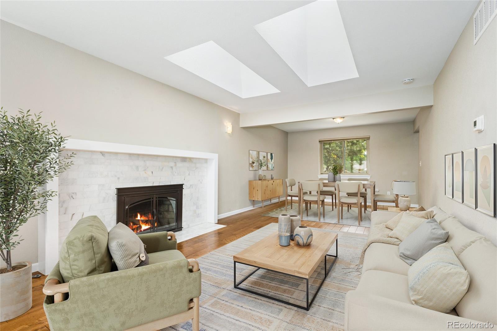 Welcome to this move-in-ready gem in the heart of Walnut Hills, nestled on a quiet street with no HOA and located within the award-winning Cherry Creek High Schools. This spacious home sits on a generously sized lot for the area, offering a fully fenced backyard, a large covered patio for year-round outdoor enjoyment, and an oversized garage with an additional concrete pad perfect for small RV or extra vehicle parking. The neighborhood is peaceful and walkable, with mature trees, friendly neighbors, and easy access to highways, top-rated schools, grocery stores, the library, restaurants, shopping, and Fiddler’s Green Amphitheater. Sidewalks and pathways wind through the community, and mountain getaways are just a short drive away. Inside, the home features both formal and informal living spaces, including a formal living and dining area accented by rich hardwood floors, a cozy fireplace, and skylights that flood the space with natural light. The modern eat-in kitchen is a chef’s delight with granite countertops, stainless appliances, a walk-in pantry, and a peninsula island with extra seating. The lower-level family room is ideal for movie nights or casual lounging. Upstairs, you'll find three generously sized bedrooms with new LVP flooring, an updated shared bathroom, and a primary suite complete with en-suite bath and dual closets. The backyard is perfect for summer gatherings, featuring raised garden beds, a matching storage shed, and plenty of room to play or relax. Energy-efficient solar panels and a long list of recent updates add even more value: Ring security lighting and video doorbell (2020), LVP flooring (2020), updated electrical panel (2020), central air (2020), utility sink and washer plumbing (2021), new patio roofing (2021), concrete pad addition (2022), new refrigerator (2022), garden beds (2022), new furnace (2023), sprinkler manifold (2023), and new dishwasher, faucet, and garbage disposal (2025).
