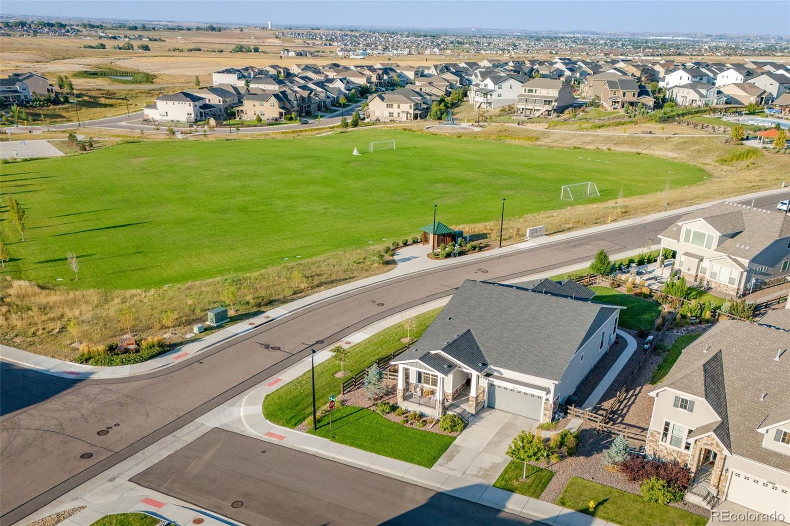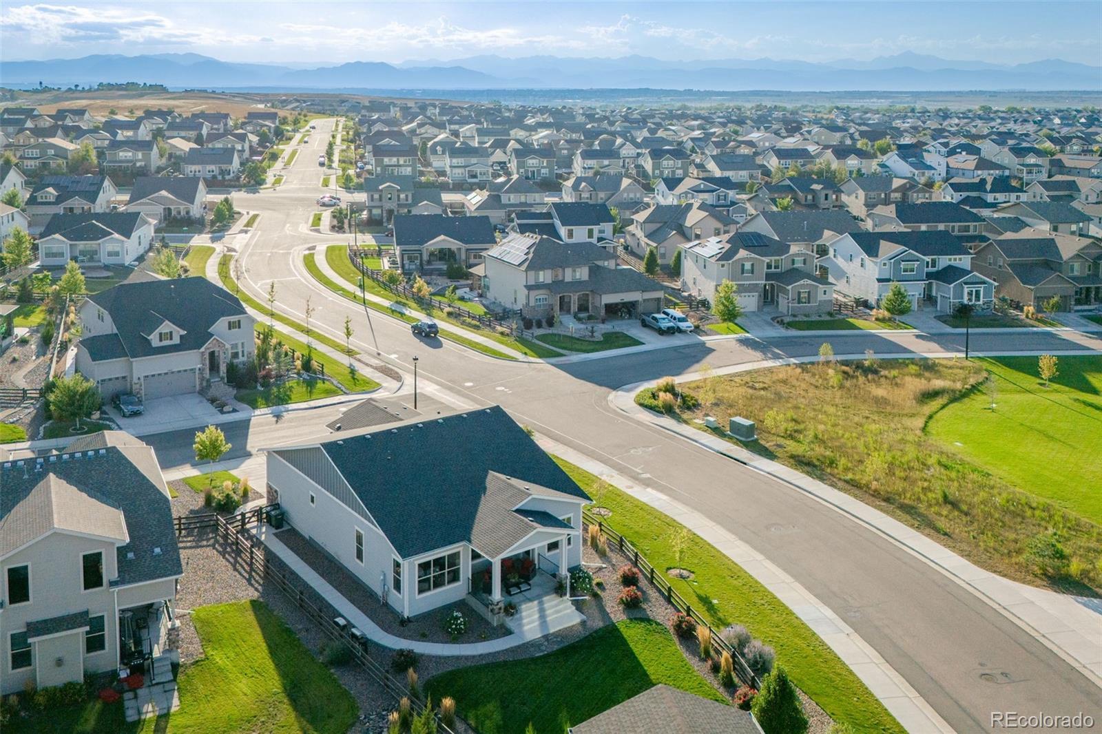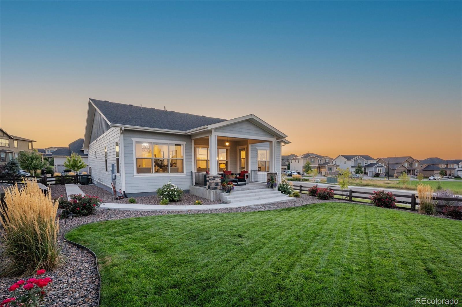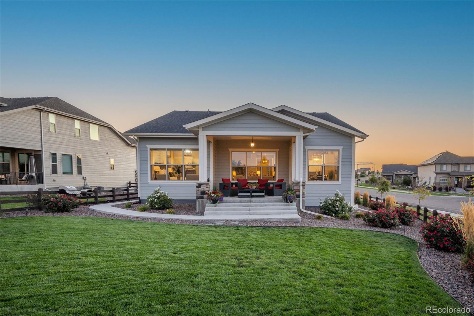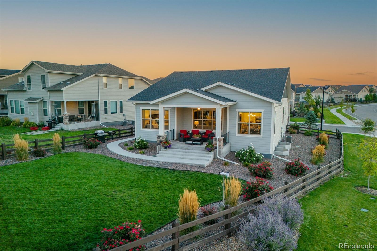 **2-1 RATE BUY DOWN AVAILABLE with CrossCountry Mortgage** HUGE SAVINGS FOR BUYERS! Ask for more details! Across from the park on a beautifully landscaped corner lot, this ranch-style home is perfectly positioned for both beauty and convenience. Every detail reflects care and intention, creating a property that feels as warm as it does refined. Natural light streams throughout, filling the open layout and creating a bright, welcoming atmosphere for everyday living and entertaining alike. In the heart of the home, the gourmet kitchen blends beauty and function—quartz countertops, marble backsplash, shaker cabinetry with crown molding, roll-out shelves, and stainless steel appliances. The oversized primary suite offers a retreat of its own with a spa-inspired design and a spacious frameless shower. With three additional bedrooms and a finished basement featuring a theater setup, there’s room for every moment of life—from quiet evenings to lively gatherings. Outside, the extended covered patio overlooks a manicured yard, the perfect setting for enjoying any hour and every season of Colorado. With a 2-car garage that includes custom shelving, thoughtful upgrades throughout, and community trails, parks, a clubhouse, pool, and fitness center nearby, this is a home that makes daily living feel extraordinary.