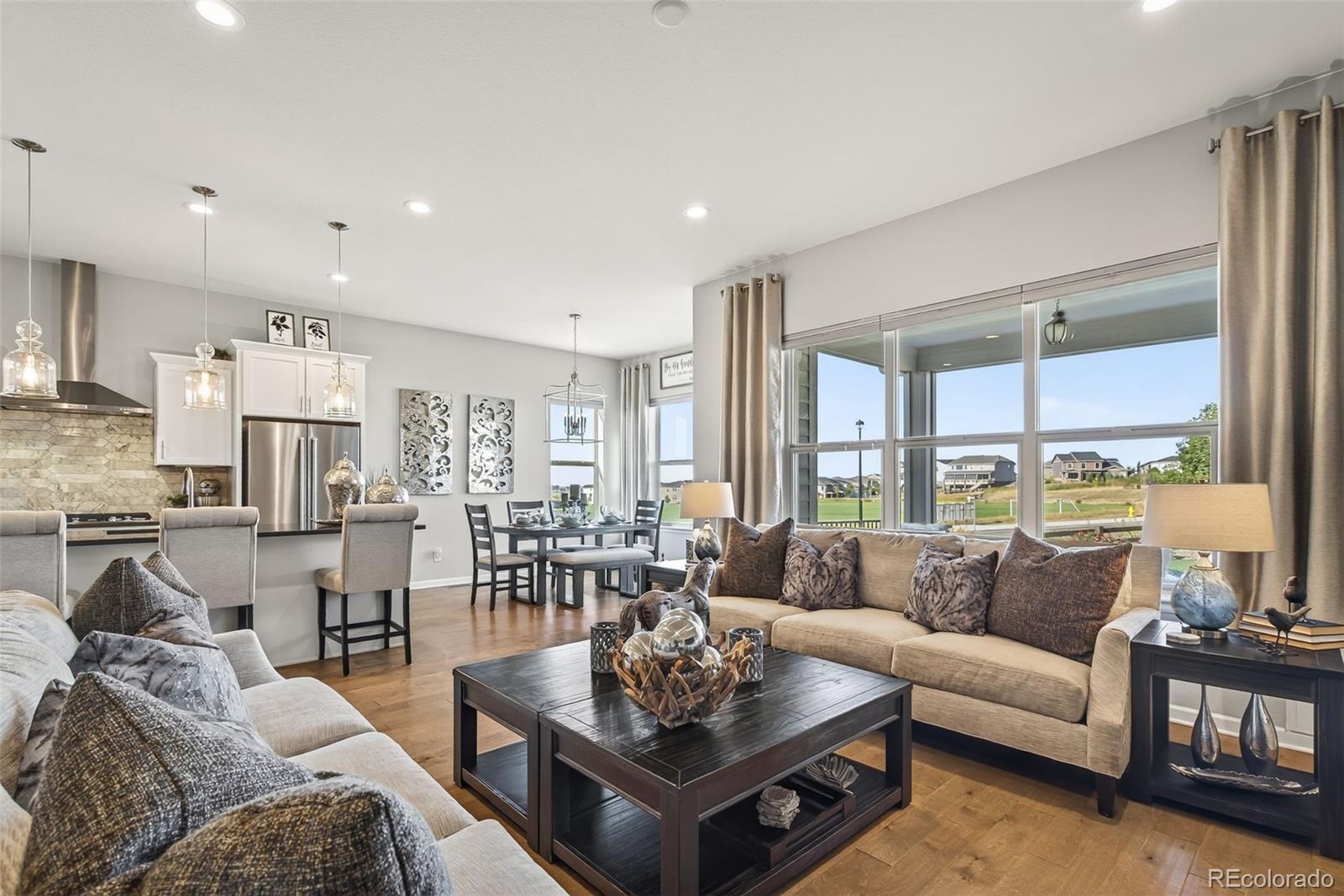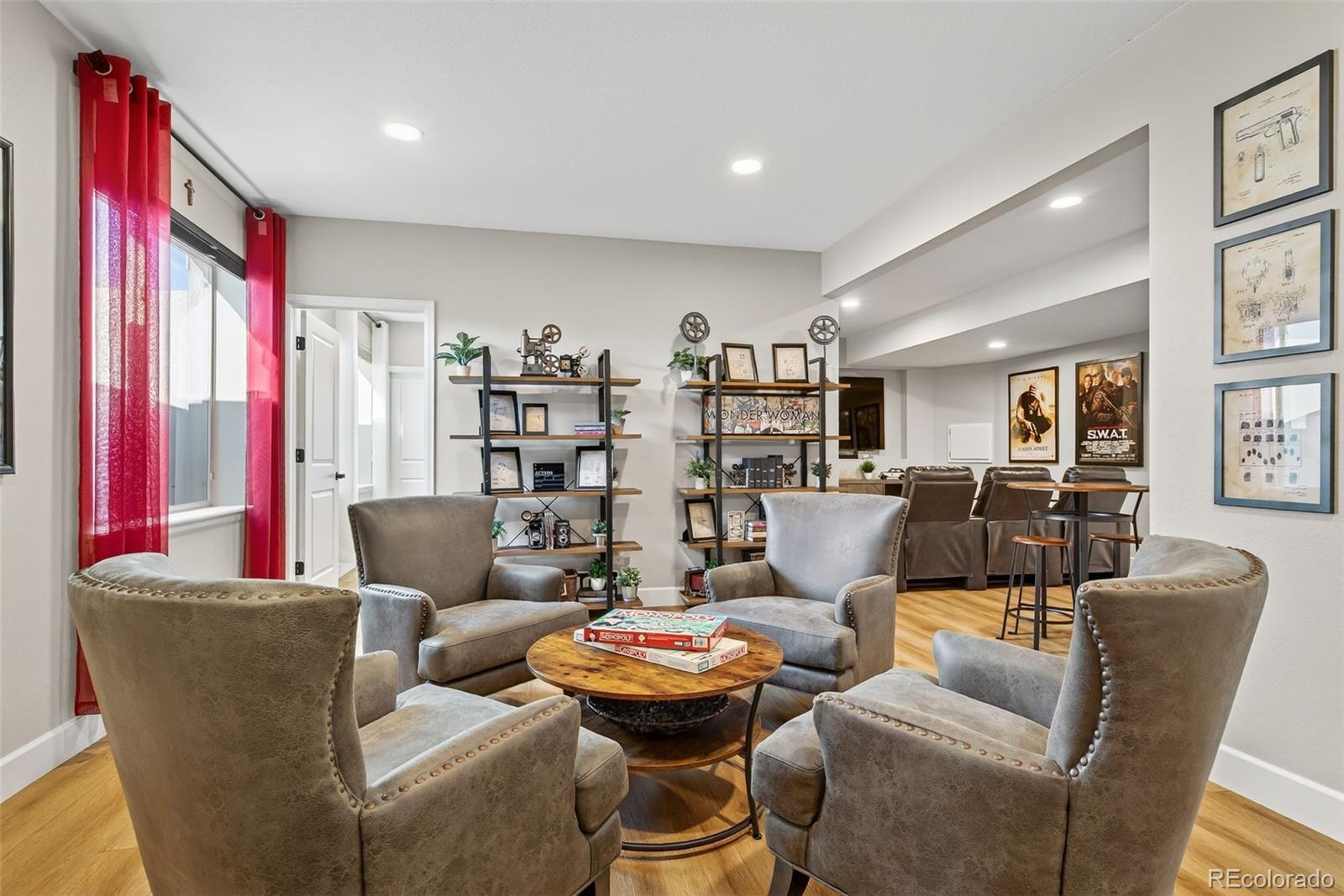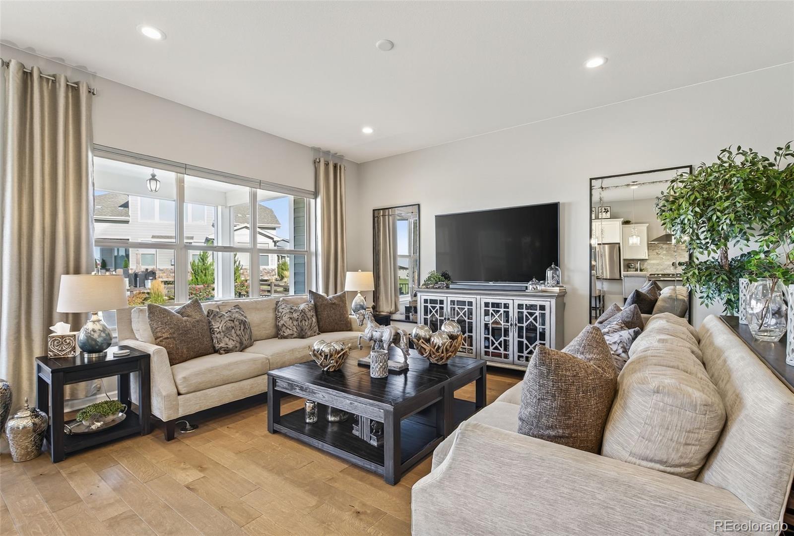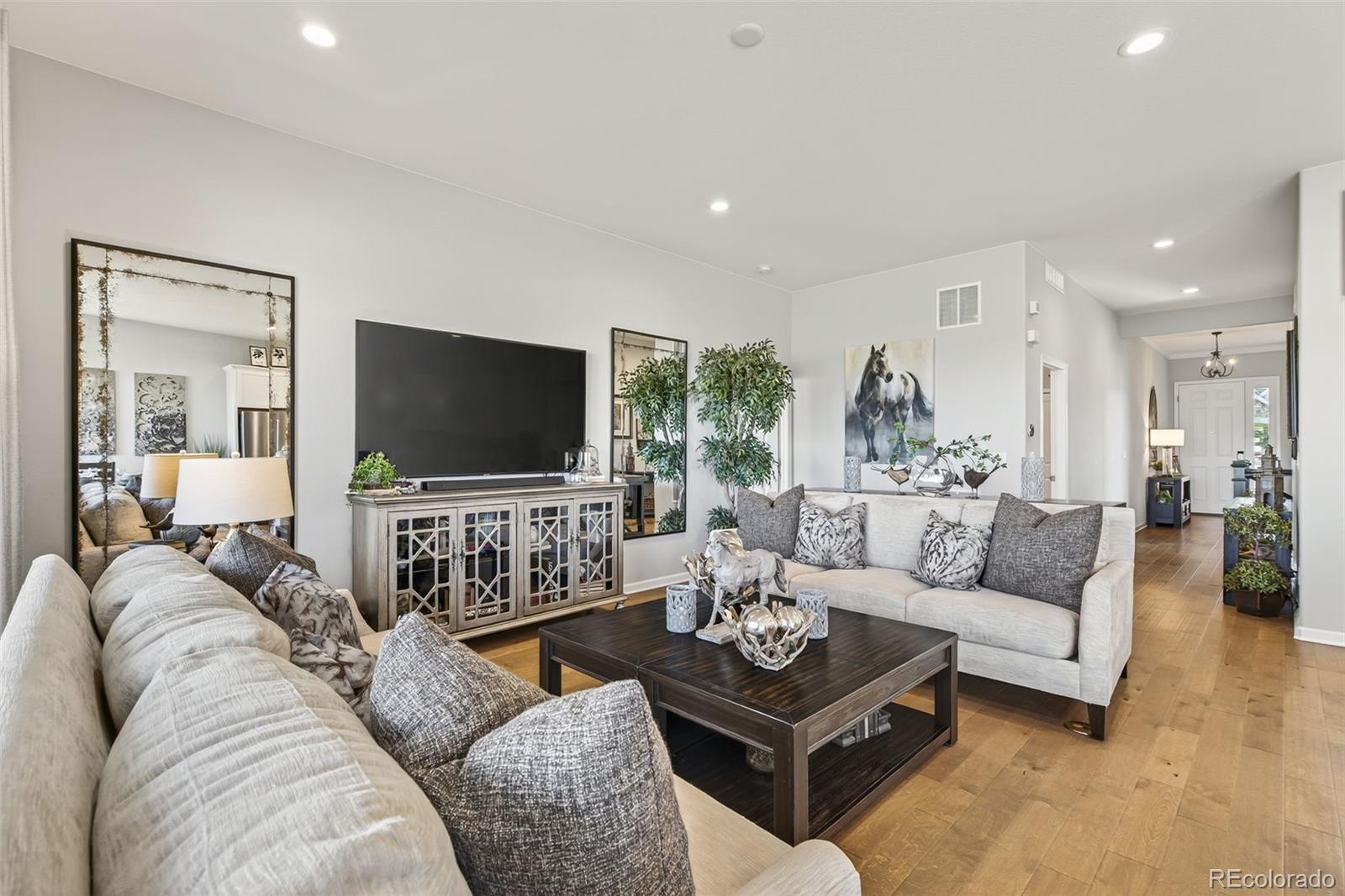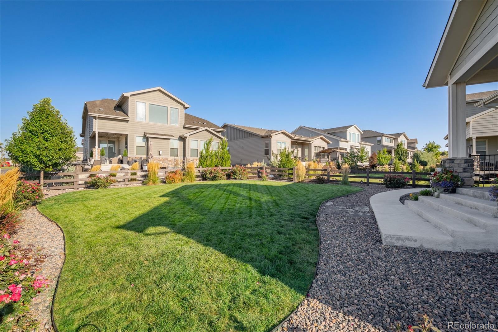 **2-1 RATE BUY DOWN AVAILABLE with CrossCountry Mortgage** HUGE SAVINGS FOR BUYERS! Ask for more details! Across from the park on a beautifully landscaped corner lot, this ranch-style home is perfectly positioned for both beauty and convenience. Every detail reflects care and intention, creating a property that feels as warm as it does refined. Natural light streams throughout, filling the open layout and creating a bright, welcoming atmosphere for everyday living and entertaining alike. In the heart of the home, the gourmet kitchen blends beauty and function—quartz countertops, marble backsplash, shaker cabinetry with crown molding, roll-out shelves, and stainless steel appliances. The oversized primary suite offers a retreat of its own with a spa-inspired design and a spacious frameless shower. With three additional bedrooms and a finished basement featuring a theater setup, there’s room for every moment of life—from quiet evenings to lively gatherings. Outside, the extended covered patio overlooks a manicured yard, the perfect setting for enjoying any hour and every season of Colorado. With a 2-car garage that includes custom shelving, thoughtful upgrades throughout, and community trails, parks, a clubhouse, pool, and fitness center nearby, this is a home that makes daily living feel extraordinary.