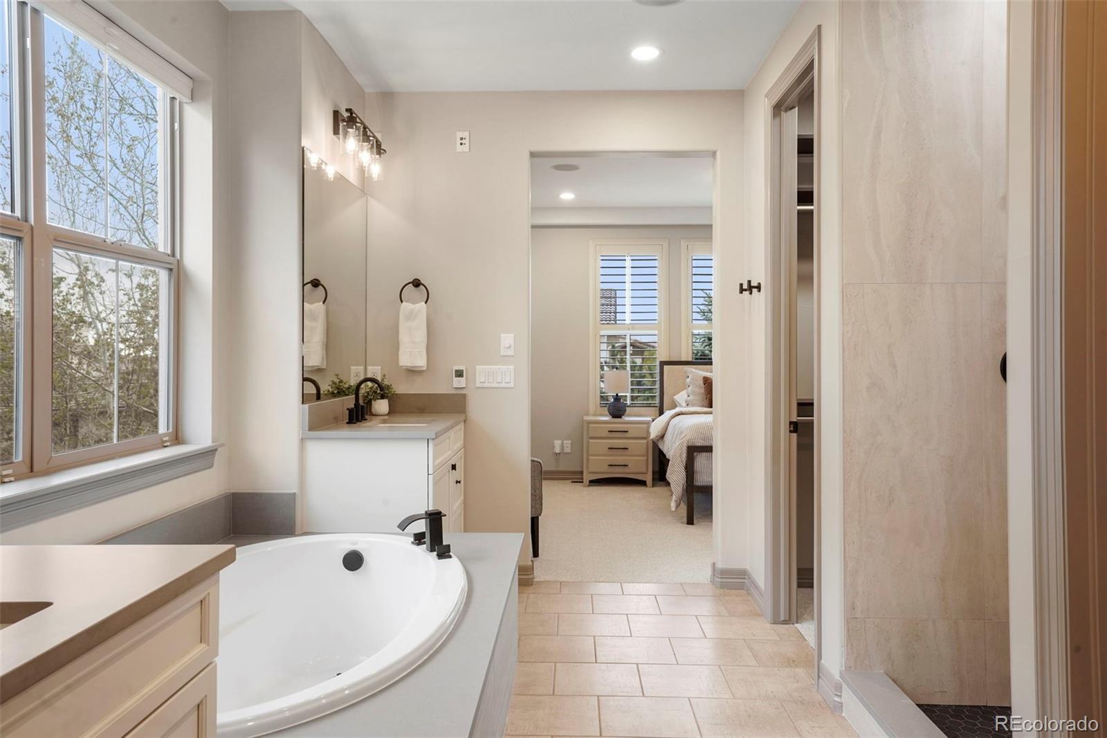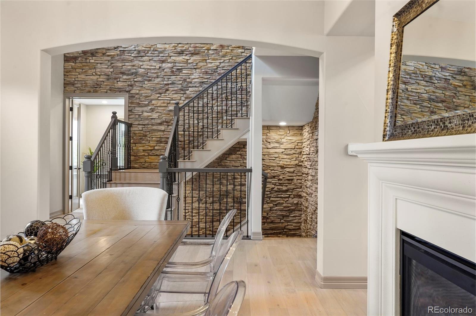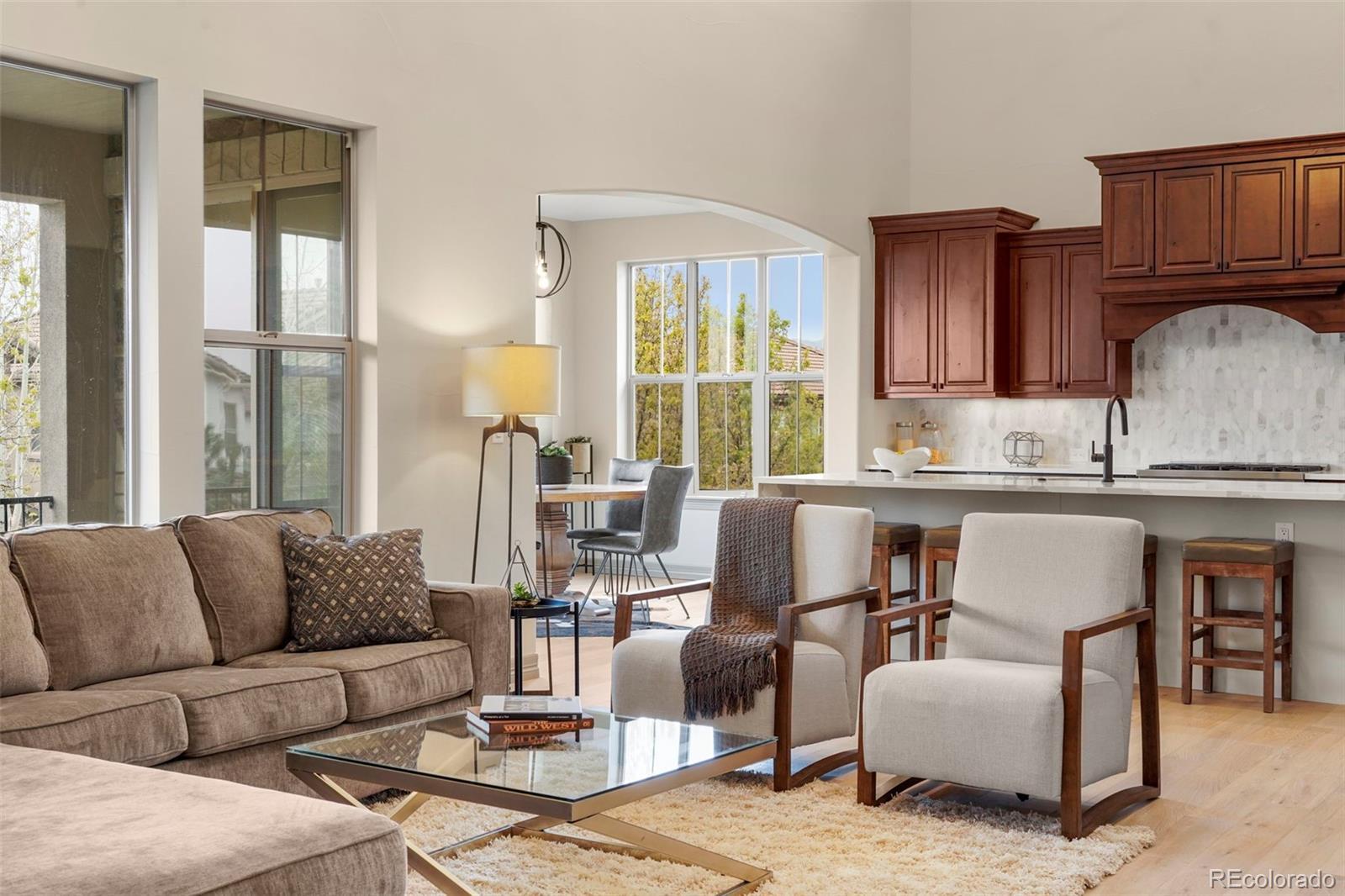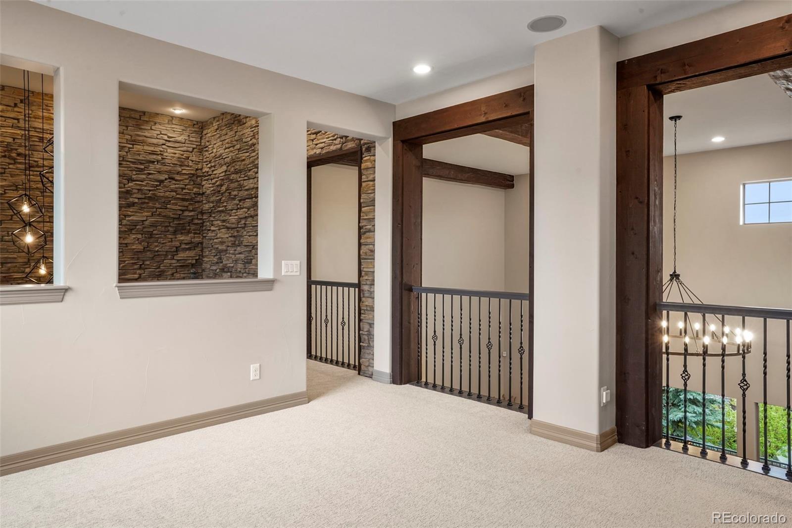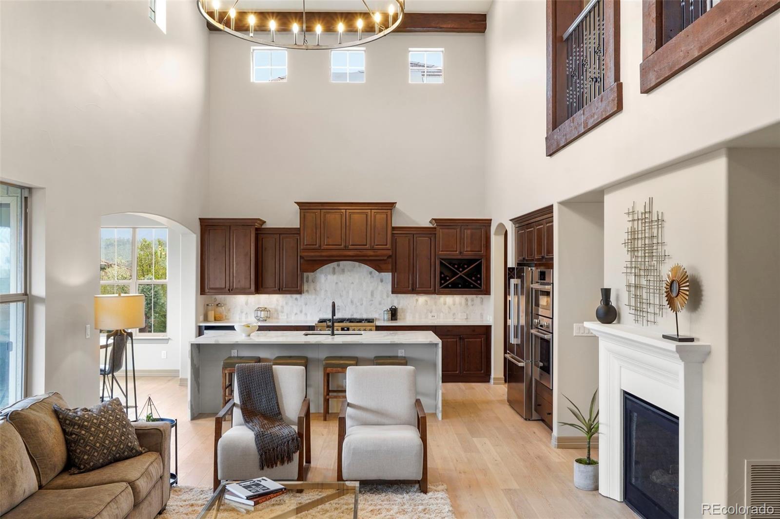 Experience the ultimate in Solterra living in this remodeled Infinity home. With a walkout basement, Grand Great Room, and high-end finishes, you'll feel like your living in a five-star resort. It is located on Solterra's best cul-de-sac - a quiet and private street with some of Solterra's finest homes framed by larger-than-life Red Rocks views. Enter the home through a courtyard and notice the attention to detail – new wide plank hardwood floors and a dramatic staircase surrounded by ledger stone. The home is built around a great room with soaring 19-foot ceilings adorned by hand-hewn timber beams and windows that kiss the room with natural light. This home is the perfect blend of rustic and modern. With custom woodwork, timeless updates, and plenty of natural light, you'll love entertaining guests in this space. The kitchen shows new Bosch appliances, a light grey kitchen island with waterfall Bianco Calacatta quartz, and a designer tile backsplash. Custom details include wine storage and a wine fridge. Updates include new hardwood floors, carpeting, quartz counters, new sinks and plumbing fixtures, and all new lights, including flush mount LED cans, exterior paint, interior paint, new hardware, and more. Finished walkout basement features a fitness room, wet bar, and fireplace. The backyard is an entertainer's delight with a built-in grill/bar, fireplace, tiki gas lamps, pergola, large patio, and hot tub. Nestled in a postcard-perfect world between urban Denver and the surrounding Green Mountains, Solterra offers residents a four-season wonderland for active living. This award-winning community is draped in breathtaking views and an inspired architectural vision that takes cues from the Tuscan countryside. From its spectacular natural surroundings to its centerpiece clubhouse, Solterra has left no detail overlooked.