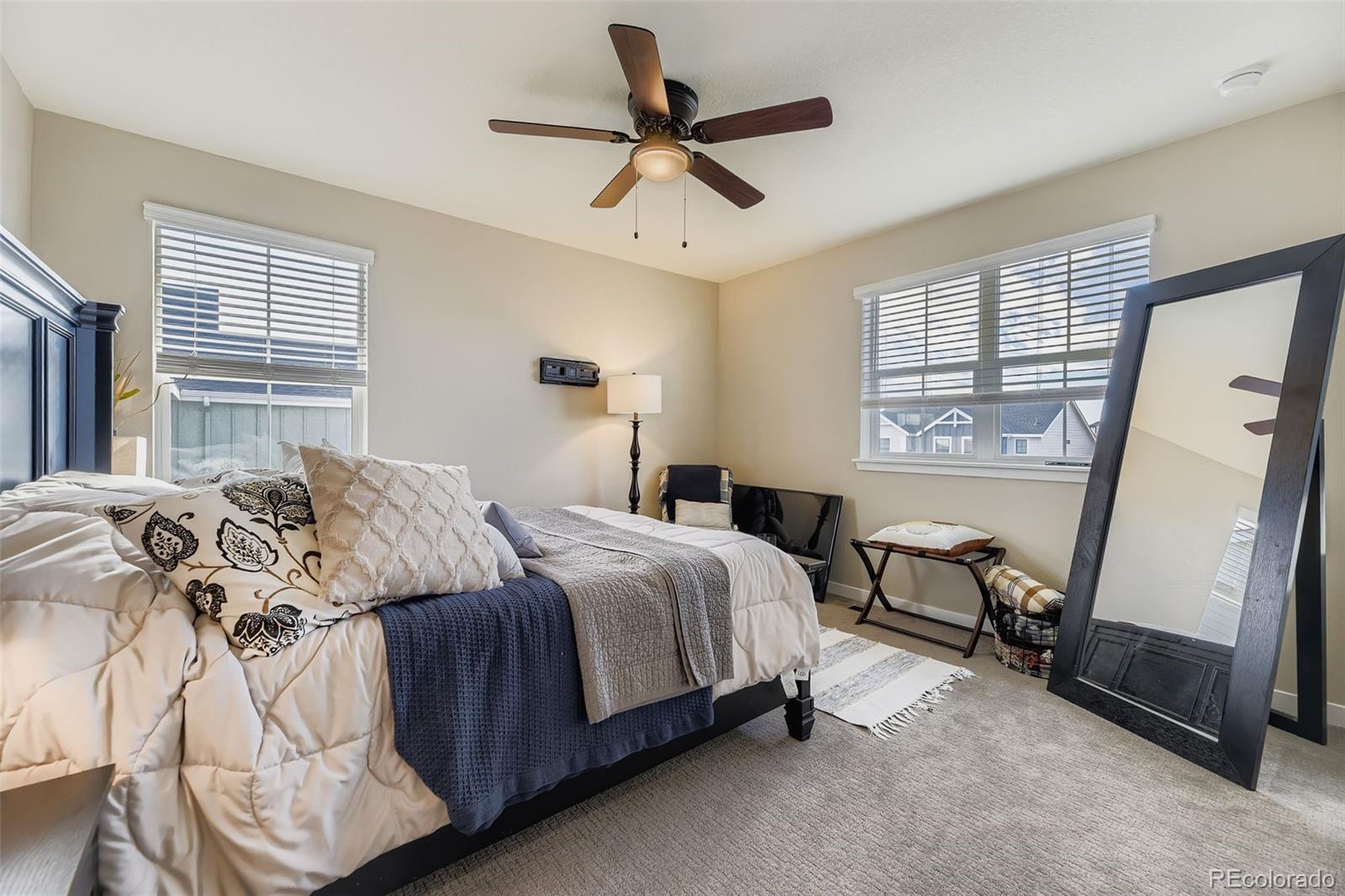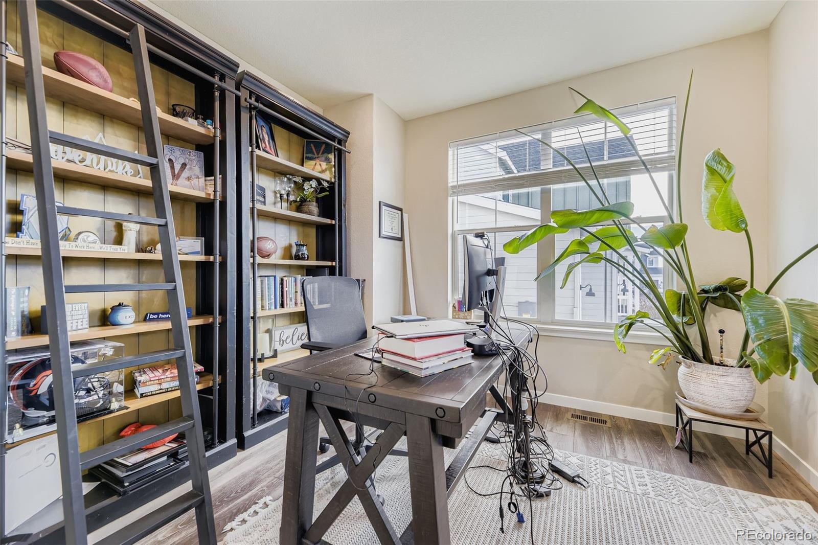 This stunning 5-bedroom, 3-bath Lennar home boasts a partially finished basement and modern upgrades throughout. The bright, spacious kitchen features a large island with ample seating, white cabinetry, granite countertops, a subway tile backsplash, a gas range, and stainless steel appliances, all complemented by laminate vinyl plank flooring on the main level. A main-floor office, outfitted with custom doors and wood blinds, provides the perfect work-from-home space. The large family room showcases designer paint and a wood accent wall, offering a cozy yet stylish atmosphere. Upstairs, the expansive master suite impresses with its designer paint and wood accents, granite countertops, a walk-in closet, and a beautifully tiled shower and flooring. Three additional bedrooms share a bathroom equipped with dual sinks, granite countertops, and a spa tub for relaxation. The finished basement includes a decorative brick wall feature, an electric fireplace, an extra family room (perfect for a man cave), a non-conforming bedroom or office, and a sizable workout gym or storage area. Outside, enjoy a trek deck, covered patio, and an extended concrete patio ideal for barbecuing or gathering around a fire pit. The low-maintenance backyard features turf grass, saving on water bills and upkeep. The home also has a newer roof and assumable efficient solar plans from ION at $105.00 monthly, making it an eco-friendly and cost-effective choice.