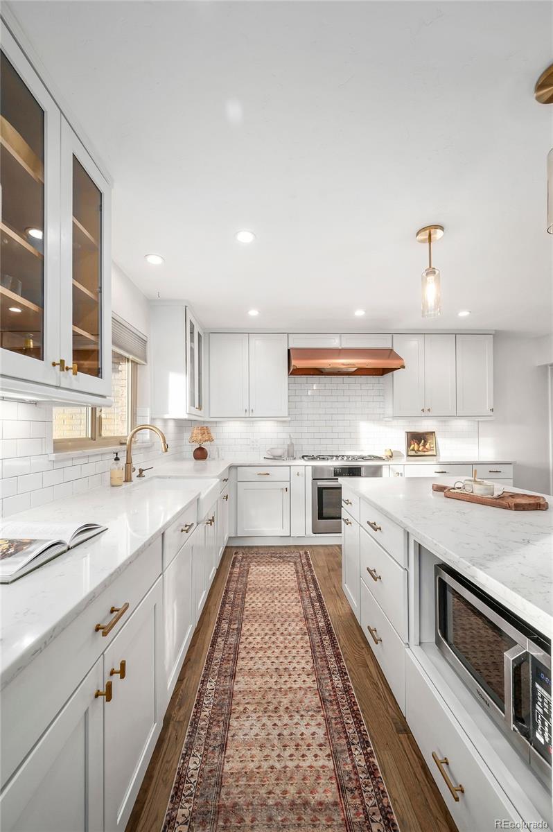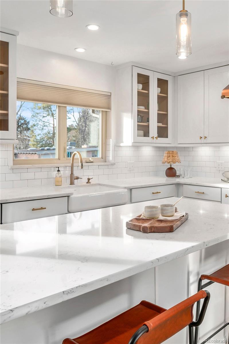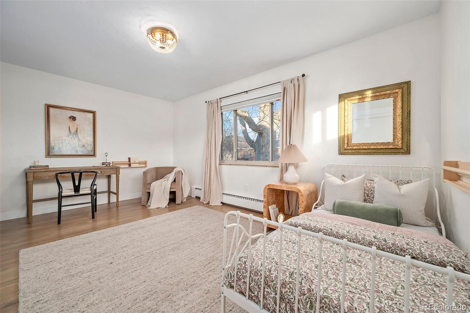 On a spacious 7,800 SF lot feeding into award-winning Slavens K–8, this fully remodeled home offers just under 2,400 SF of thoughtful, design-forward living. Hardwood floors, timeless finishes, and preserved architectural character define the well-designed interior. The main level centers around a beautifully remodeled kitchen featuring a large island, the original copper hood, and a picture-perfect dining area, all flowing into a spacious family room anchored by a striking flagstone fireplace. A mudroom/laundry room and convenient powder room connects to the 2-car garage — complete with extensive storage — for everyday convenience, while direct access leads to the private, tree-filled backyard, ideal for entertaining and enjoying Colorado’s outdoor lifestyle. Up a short flight of stairs are two spacious bedrooms and a large remodeled bath with double vanity, while the home’s bathrooms showcase elegant marble and quartz finishes throughout. The garden-level lower floor is filled with natural light and includes an additional living area with a comfortable TV/lounge space featuring custom built-ins and beautiful shiplap detailing, along with a bedroom and bath, offering excellent flexibility for a variety of uses. Well maintained and move-in ready, this home blends architectural authenticity with comfortable, functional living in a premier location — minutes from Platt Park, Harvard Gulch, and directly across from the iconic Arapahoe Acres mid-century modern neighborhood.