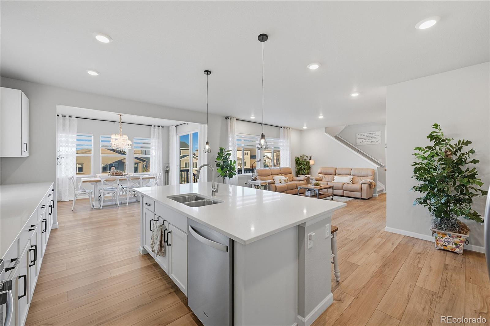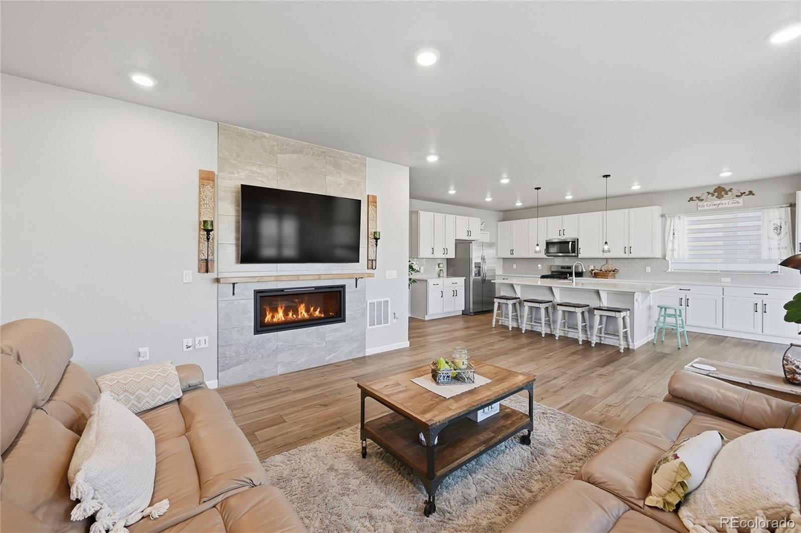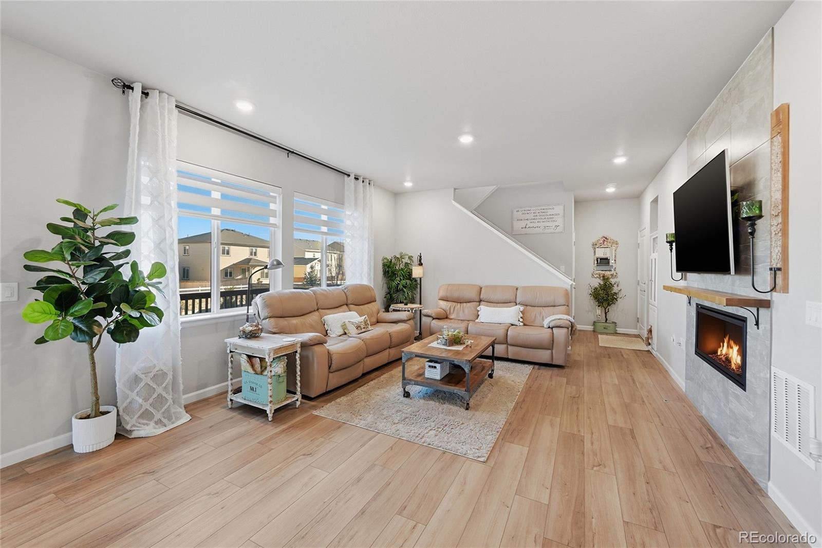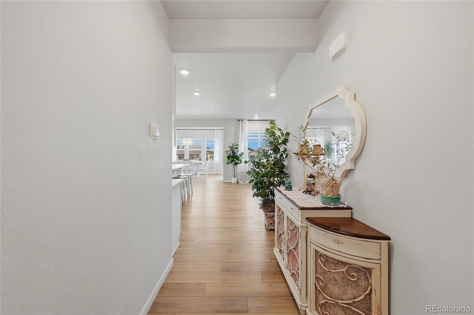 Welcome home to this beautifully upgraded Century Communities residence in the highly desirable Enclave at Pine Grove in Parker. From the moment you step onto the welcoming covered patio, you’ll notice the home’s stylish, contemporary design and thoughtful attention to detail throughout. This gorgeous 4-bed, 3-bath home offers approximately 2,375 sq ft of well-planned living space with premium upgrades at every turn. The heart of the home is the stunning chef’s kitchen featuring an oversized quartz island, tile backsplash, abundant cabinetry, stainless steel appliances.The open-concept layout seamlessly connects the kitchen, dining, and living areas, creating a warm and inviting space ideal for gatherings. The family room is highlighted by a beautiful butcher-block mantle over a modern gas fireplace, complemented by upgraded waterproof LVT flooring, upgraded soft gray color paint pallet and stylish silhouette type window shades throughout the home. A main-level bedroom or office and full bath offer flexible living options for guests or remote work. Upstairs, you’ll find a spacious primary suite with a luxurious ensuite bath featuring a walk-in shower, dual-sink vanity, tile flooring, and a lg walk-in closet with custom shoe storage. The upper level also includes two additional bedrooms, a full bath, an oversized loft ideal for a media room, game area, or home office, and a convenient laundry room with washer and dryer included. The lower level offers a livable, insulated, and painted basement space with LVT flooring throughout — perfect for entertaining, a workout area, or additional living space. Step outside to enjoy a generously sized backyard with a great patio for entertaining, upgraded front and back landscaping, and a serene greenbelt backdrop that gives the feel of a private retreat. This move-in-ready home combines comfort, style, and location. Why buy a new construction home when you can have this 2 yr new home with all the upgrades? Truly a must-see!