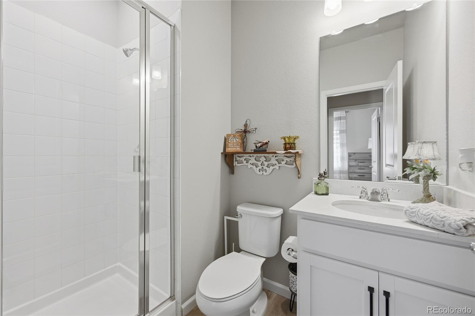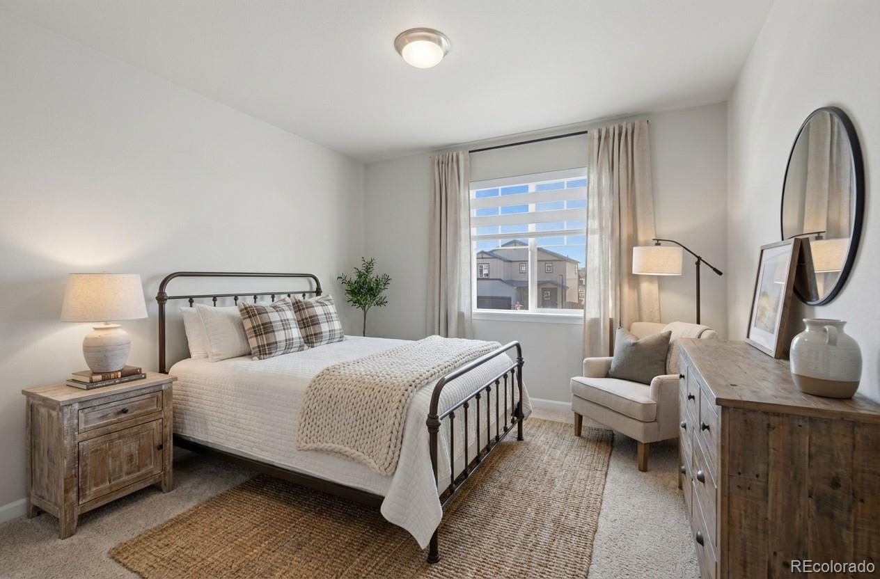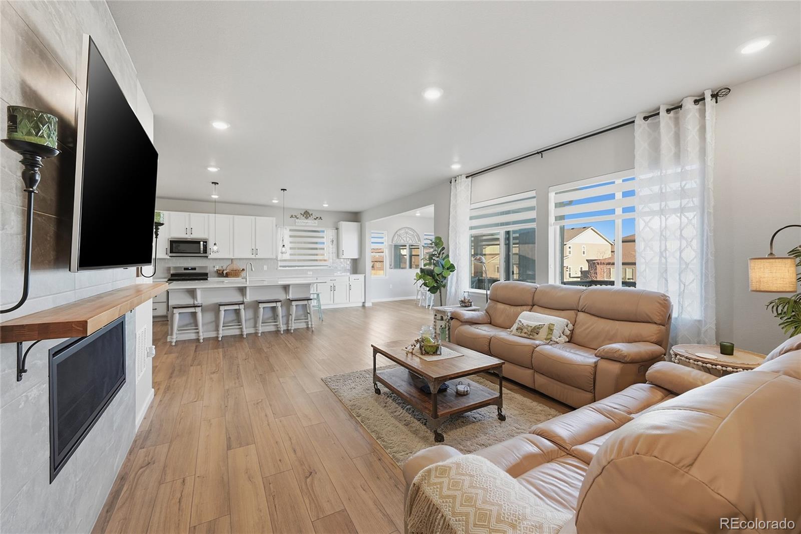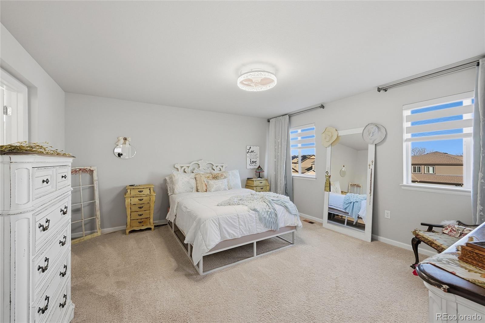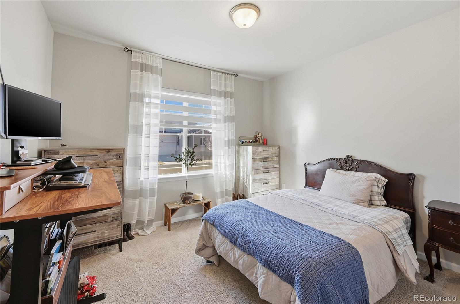 Welcome home to this beautifully upgraded Century Communities residence in the highly desirable Enclave at Pine Grove in Parker. From the moment you step onto the welcoming covered patio, you’ll notice the home’s stylish, contemporary design and thoughtful attention to detail throughout. This gorgeous 4-bed, 3-bath home offers approximately 2,375 sq ft of well-planned living space with premium upgrades at every turn. The heart of the home is the stunning chef’s kitchen featuring an oversized quartz island, tile backsplash, abundant cabinetry, stainless steel appliances.The open-concept layout seamlessly connects the kitchen, dining, and living areas, creating a warm and inviting space ideal for gatherings. The family room is highlighted by a beautiful butcher-block mantle over a modern gas fireplace, complemented by upgraded waterproof LVT flooring, upgraded soft gray color paint pallet and stylish silhouette type window shades throughout the home. A main-level bedroom or office and full bath offer flexible living options for guests or remote work. Upstairs, you’ll find a spacious primary suite with a luxurious ensuite bath featuring a walk-in shower, dual-sink vanity, tile flooring, and a lg walk-in closet with custom shoe storage. The upper level also includes two additional bedrooms, a full bath, an oversized loft ideal for a media room, game area, or home office, and a convenient laundry room with washer and dryer included. The lower level offers a livable, insulated, and painted basement space with LVT flooring throughout — perfect for entertaining, a workout area, or additional living space. Step outside to enjoy a generously sized backyard with a great patio for entertaining, upgraded front and back landscaping, and a serene greenbelt backdrop that gives the feel of a private retreat. This move-in-ready home combines comfort, style, and location. Why buy a new construction home when you can have this 2 yr new home with all the upgrades? Truly a must-see!