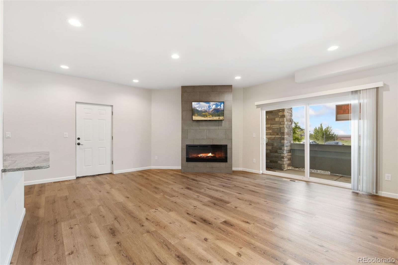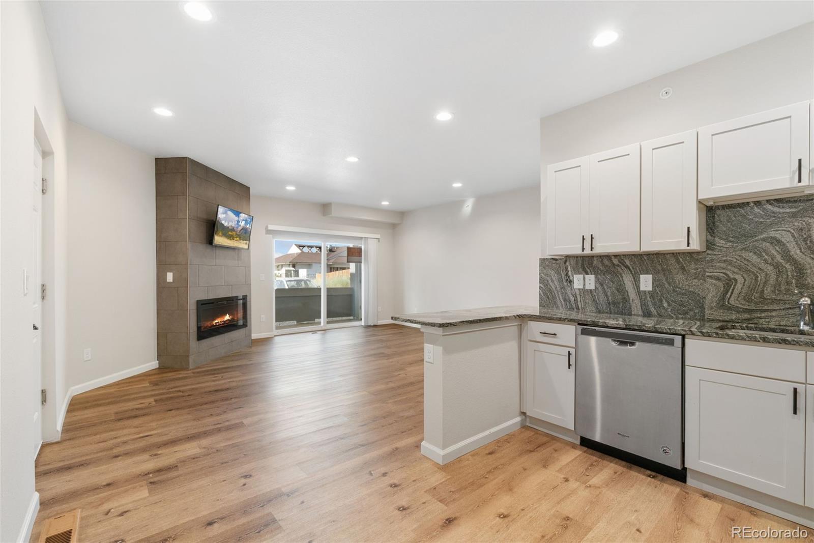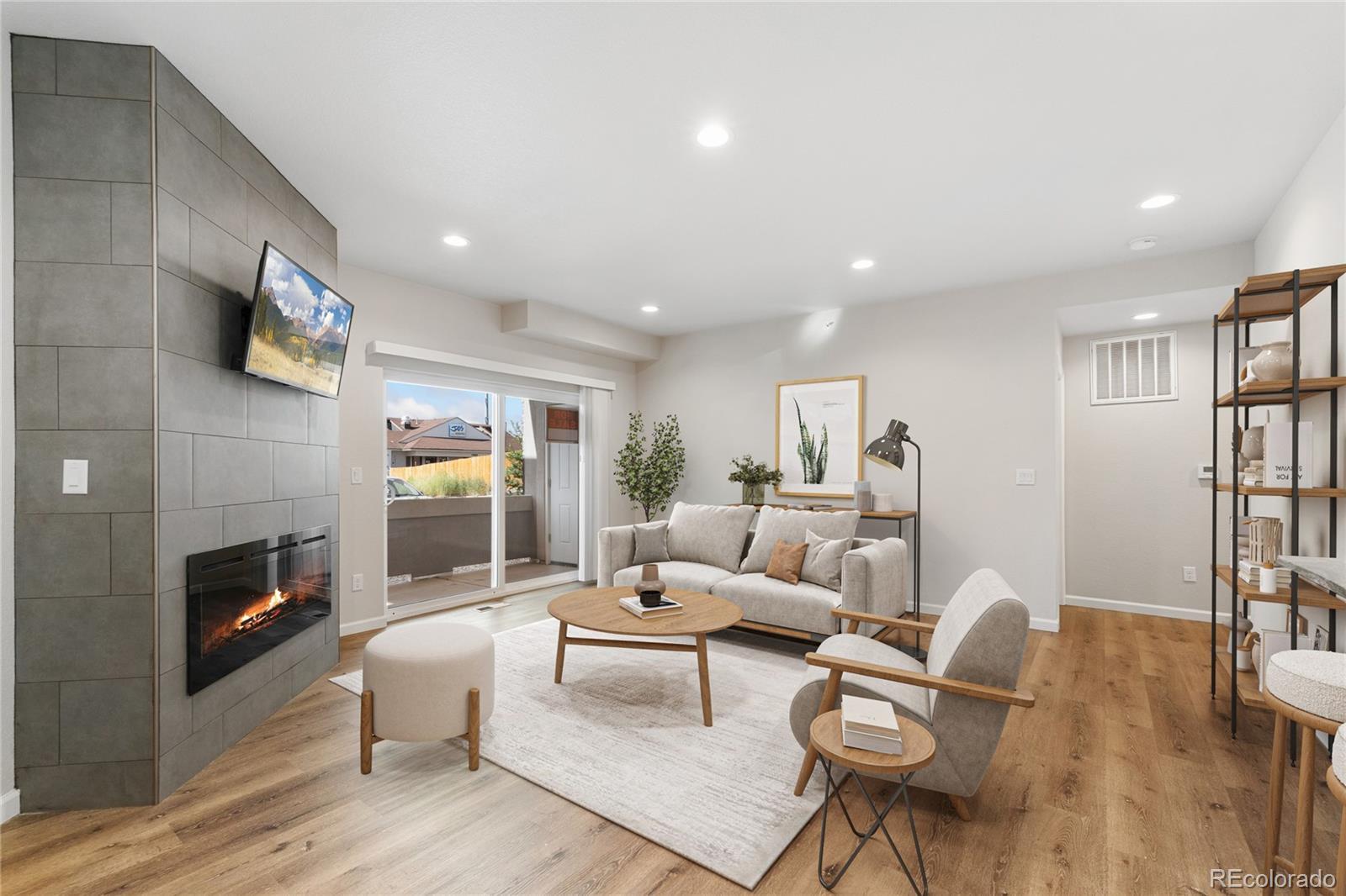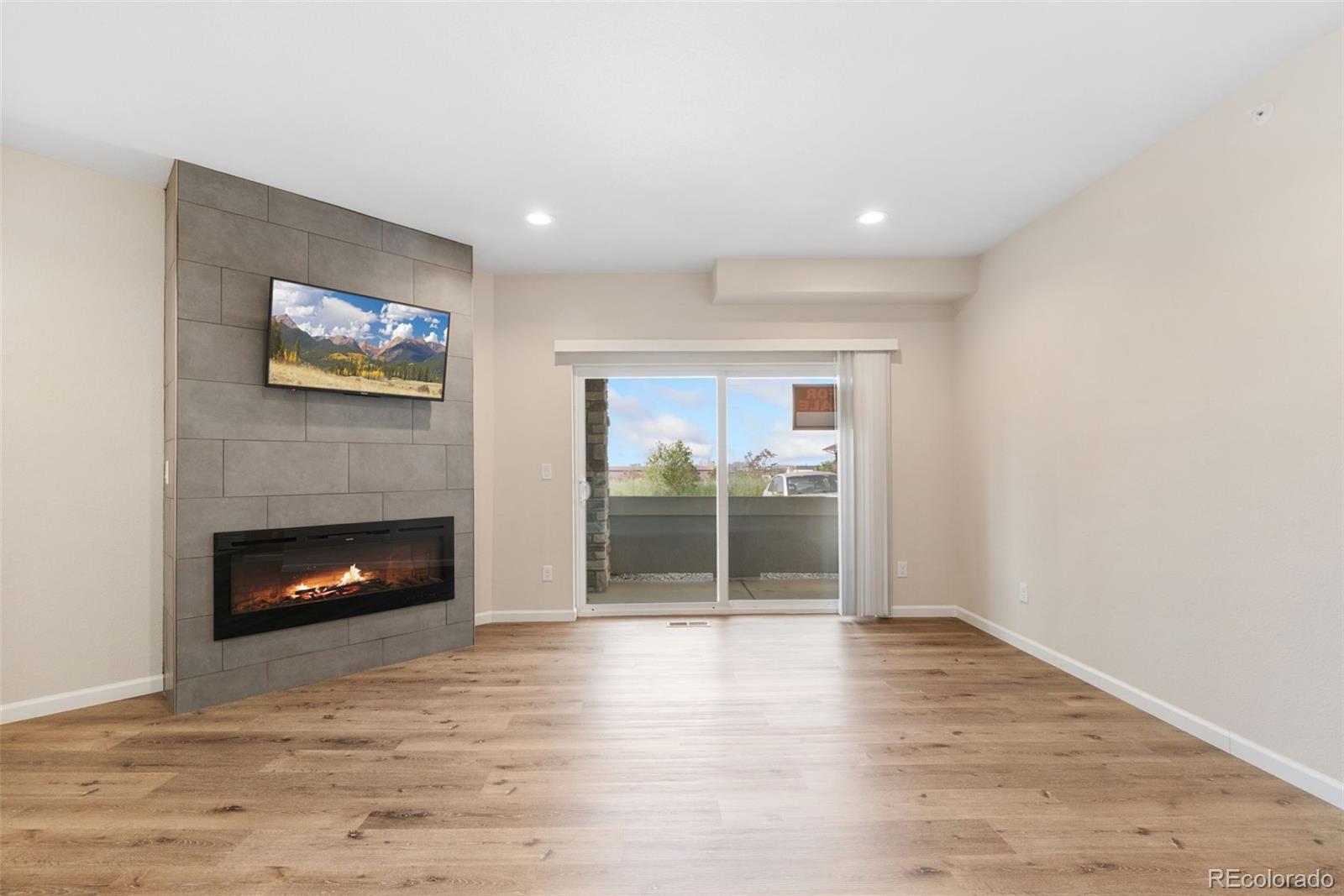 Settle into easy living with this spacious main floor condo, offering the best of both comfort and accessibility with secured, indoor entry and an ideal layout that blends functionality with style. This 3-bed, 2-bath unit offers a lock-and-leave lifestyle that is perfect for anyone seeking a hassle-free living environment. Step inside to an open-concept floor plan featuring durable, stylish LVP flooring that connects the living, dining, and kitchen areas into one inviting, easy-to-use space. The living room is anchored by a stylish fireplace, perfect for relaxing or adding a touch of ambiance to your quiet evenings. The modern kitchen makes both cooking and entertaining a breeze, featuring quartz countertops, stainless steel appliances, and plenty of workspace for prepping your favorite meals. All bedrooms are comfortably carpeted to keep things soft underfoot. The primary suite includes an ensuite bathroom and a walk-in closet, providing ample storage space and convenience. Enjoy the fresh air from your covered patio, complete with a storage closet to keep tools, gear, or seasonal decor neatly tucked away. The laundry area also offers plenty of extra room for storage, making it easy to stay organized and clutter-free. Parking is ample, ensuring that residents and guests always have a place to park. This feature. Centrally located near Denver, DIA, and the Metro area, this spot makes commuting a breeze while keeping you close to dining, shopping, and everyday essentials.