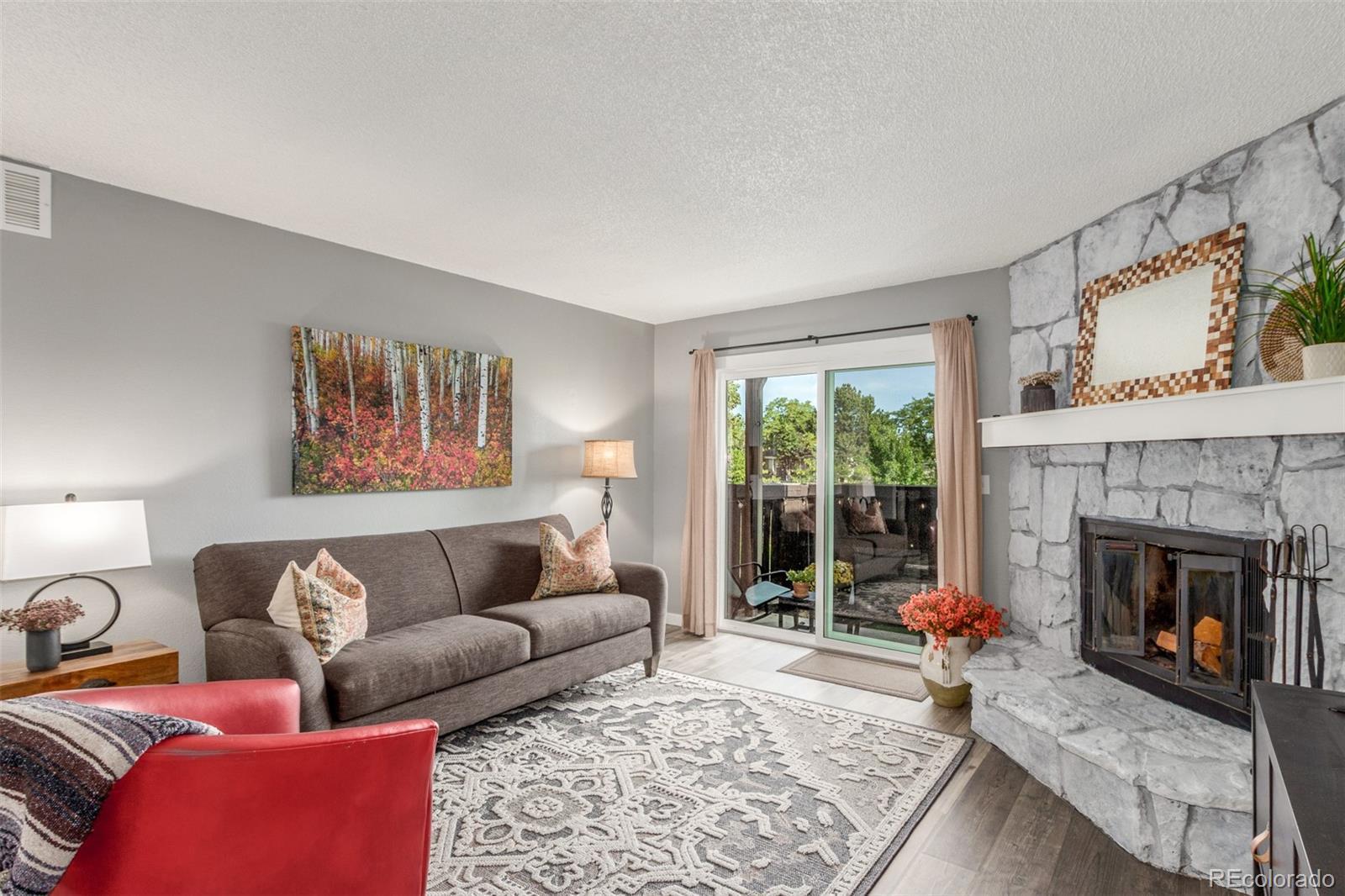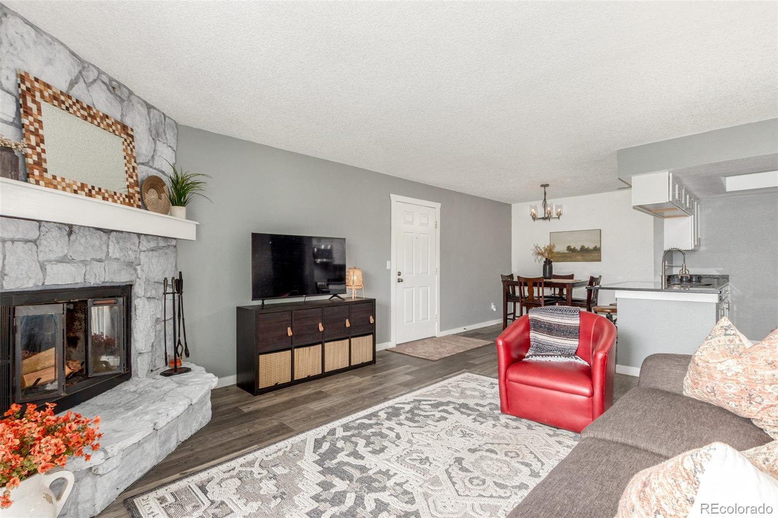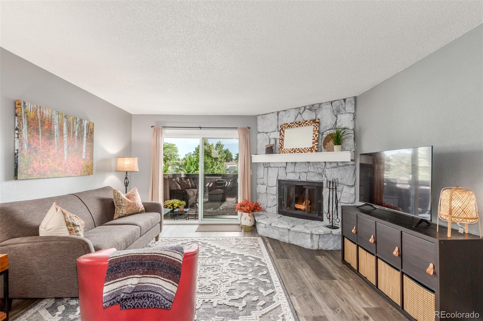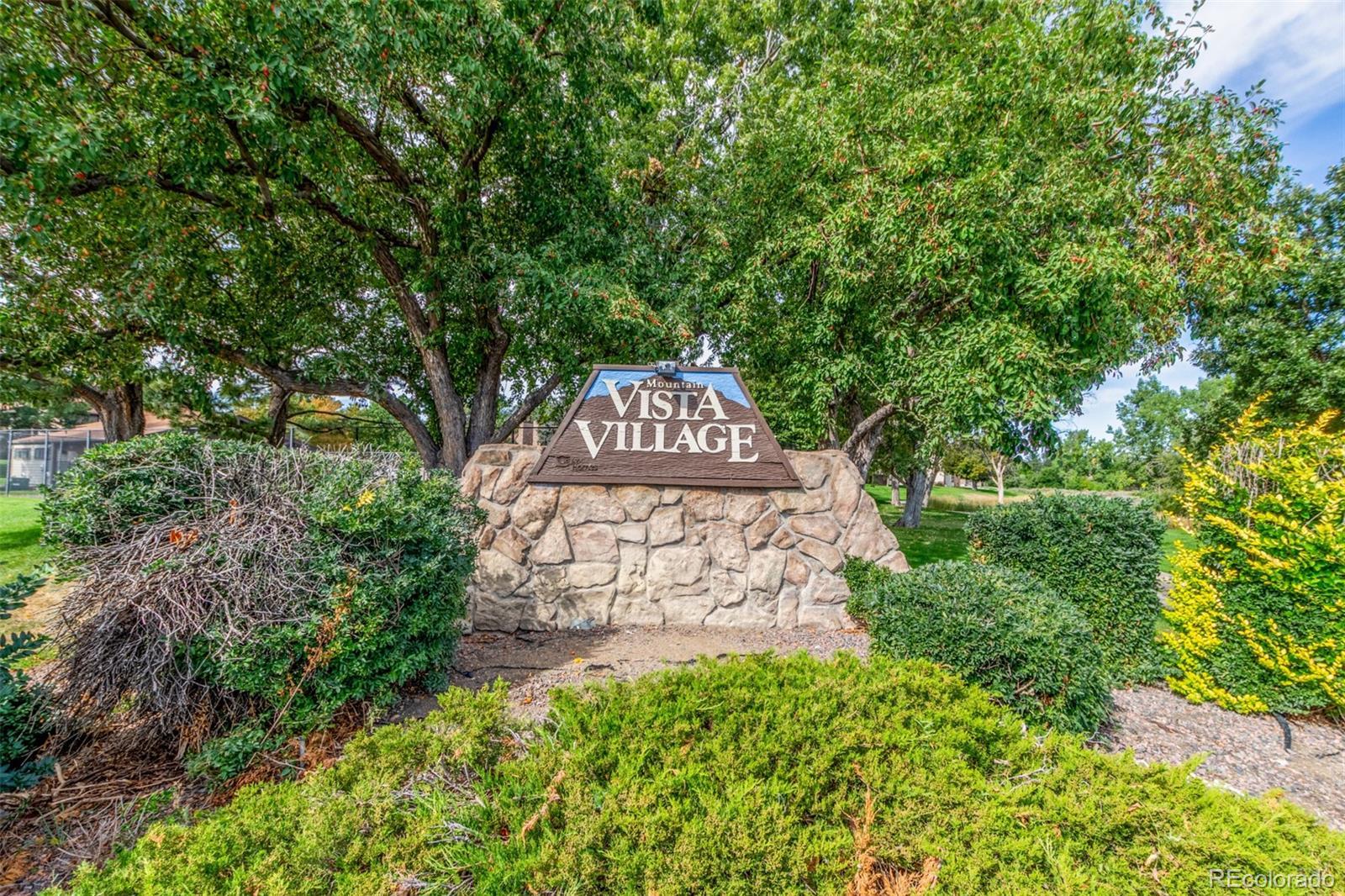 Seller's are offering to pay HOA Dues FOR TWO MONTHS AFTER CLOSING! One less item on your list when it is time to move-in! What a charming ground-floor condo awaits you in Mountain Vista Village! With 2 beds & 1 bath, this beauty seamlessly blends modern style and everyday comfort. The inviting interior showcases a neutral palette, abundant natural light, wood-look flooring in common areas, and soft carpet in bedrooms. You'll love the seamlessly flowing open layout that enhances both daily living and entertaining! With a fireplace as the focal point, the space exudes warmth and character. The impressive kitchen boasts stainless steel appliances, granite counters, track lighting, white shaker cabinetry, and a breakfast bar. The primary bedroom has a walk-in closet and access to the Jack & Jill bathroom. For added functionality, the secondary bedroom can also serve as an office. If you want to relax after a busy day, the private yard is waiting for you with a cozy covered patio! The unit is adjacent to a greenbelt, offering added privacy and serene natural views right outside your door. For your convenience, you’ll have two assigned parking spaces. Let's not forget the Community amenities, including a heated pool, a spa, and tennis/pickleball courts. Excellent location close to parks, shopping, dining options, entertainment, and highways. Don't miss this great opportunity!